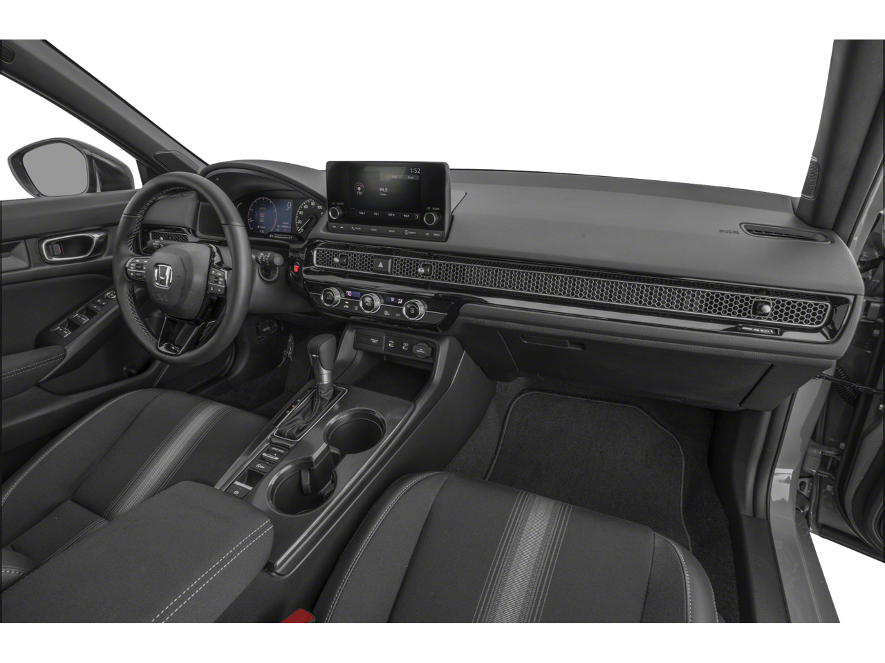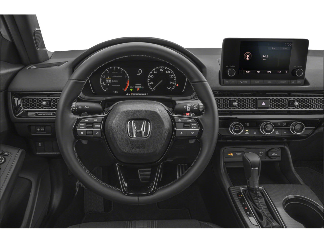 Black Artificial Leather, 4-Wheel Disc Brakes, 8 Speakers, ABS brakes, Adaptive Cruise Control: Adaptive Cruise Control (ACC) with Low-Speed Follow, Air Conditioning, Alloy wheels, AM/FM radio, Apple CarPlay/Android Auto, Auto High-beam Headlights, Automatic temperature control, Blind Spot Information (BSI) System warning, Brake assist, Bumpers: body-color, Cloth/Leatherette Seating Surfaces, Delay-off headlights, Driver door bin, Driver vanity mirror, Dual front impact airbags, Dual front side impact airbags, Electronic Stability Control, Emergency communication system: HondaLink, Exterior Parking Camera Rear, Four wheel independent suspension, Front anti-roll bar, Front Bucket Seats, Front Center Armrest, Front reading lights, Fully automatic headlights, Heated door mirrors, Illuminated entry, Knee airbag, Lane departure: Lane Keeping Assist System (LKAS) active, Leather Shift Knob, Low tire pressure warning, Occupant sensing airbag, Outside temperature display, Overhead airbag, Panic alarm, Passenger door bin, Passenger vanity mirror, Power door mirrors, Power steering, Power windows, Radio data system, Radio: 180-Watt Audio System, Rear anti-roll bar, Rear side impact airbag, Rear window defroster, Rear window wiper, Remote keyless entry, Security system, Speed control, Speed-sensing steering, Split folding rear seat, Steering wheel mounted audio controls, Tachometer, Telescoping steering wheel, Tilt steering wheel, Traction control, Trip computer, Wheels: 18 Gloss Black Alloy, Black Artificial Leather. 30/38 City/Highway MPG