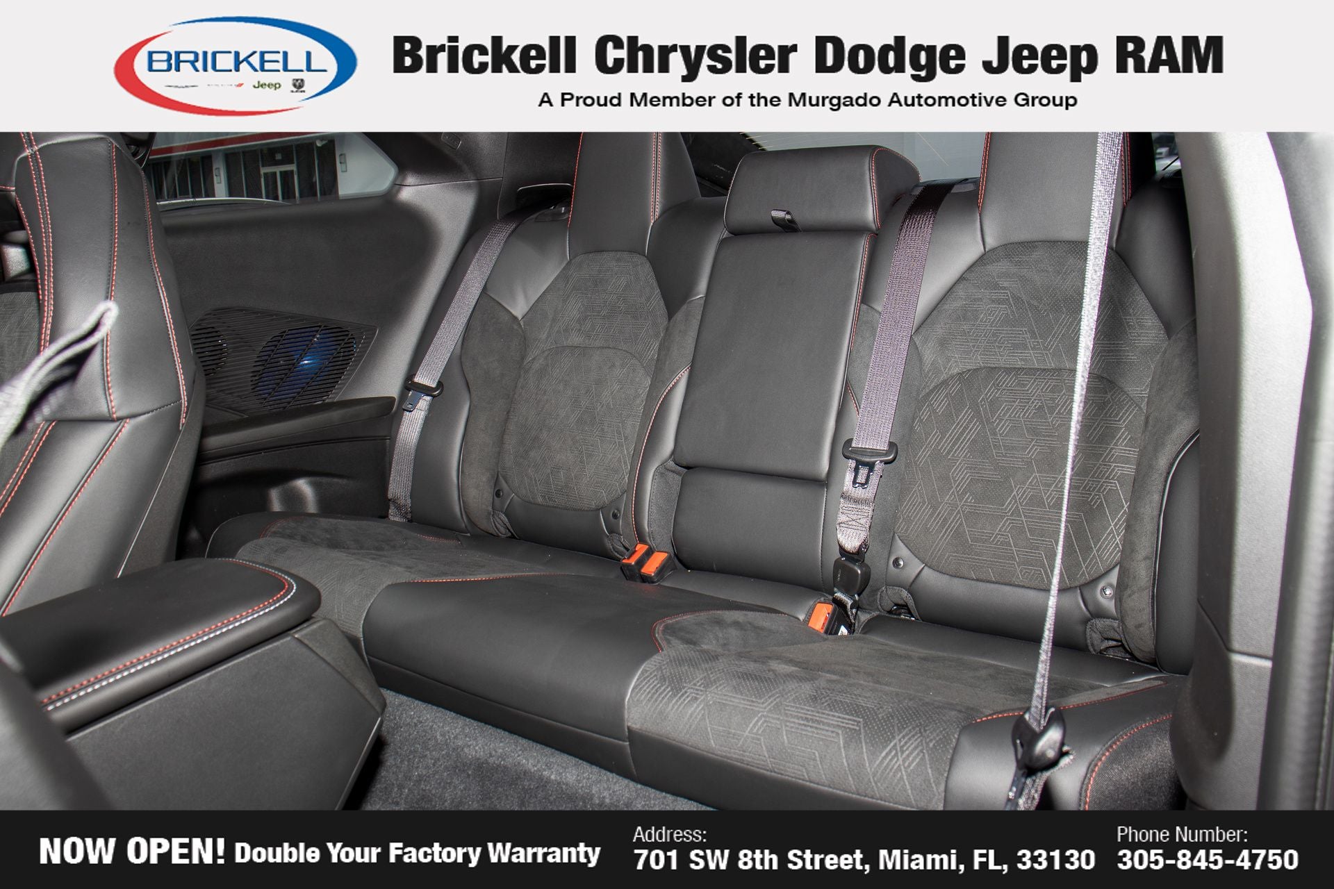 Discover Your Next Vehicle at Brickell Chrysler Dodge Jeep Ram Welcome to Brickell CDJR, where we go beyond selling cars. We double the factory powertrain warranty, giving you added peace of mind. Our dealership offers one of the largest new car inventories in the region, ensuring you find the right vehicle Prices displayed do not included our Perma-plate. Our state-of-the-art service department is the largest in the country and is open seven days a week from 7 AM to 9 PM. Visit us at 701 SW 8th St, Miami, FL 33130, or call 305-777-2800 to learn more and schedule a test drive. The displayed price includes an incentive for financing with Brickell CDJR Finance Company. Outside financing and bank drafts are not accepted. All pre-owned vehicle exports are subject to an export fee. Prices apply only to customers who live, work, or worship in Broward, Miami-Dade, Palm Beach, Monroe, Collier, Hendry, Lee, Glades, Martin, St. Lucie, Okeechobee, Manatee, Hillsborough, Osceola, or Orange County. Customers outside these counties will pay an additional $ Taxes, title, registration, and dealer fees apply. Factory MSRP: $70,455 Bludicrous 2026 Dodge Charger R/T Scat Pack AWD 8-Speed Automatic HO AWD, Black Artificial Leather.