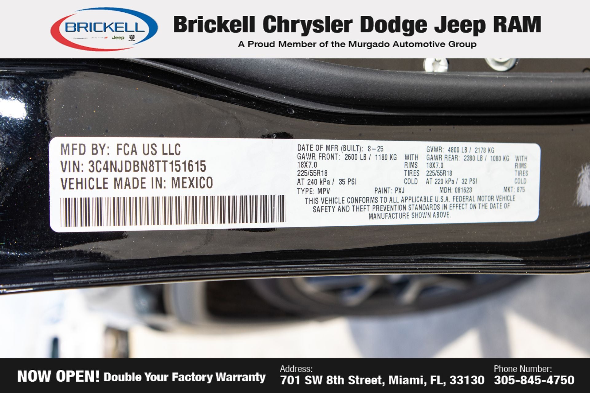 Price includes: $1000 - 2026 National Retail Bonus Cash . Exp. 04/30/2026 $1960 - 2026 National Select Inventory Bonus Cash w/ 4TR . Exp. 01/04/2027 Discover Your Next Vehicle at Brickell Chrysler Dodge Jeep Ram Welcome to Brickell CDJR, where we go beyond selling cars. We double the factory powertrain warranty, giving you added peace of mind. Our dealership offers one of the largest new car inventories in the region, ensuring you find the right vehicle Prices displayed do not included our Perma-plate. Our state-of-the-art service department is the largest in the country and is open seven days a week from 7 AM to 9 PM. Visit us at 701 SW 8th St, Miami, FL 33130, or call 305-777-2800 to learn more and schedule a test drive. The displayed price includes an incentive for financing with Brickell CDJR Finance Company. Outside financing and bank drafts are not accepted. All pre-owned vehicle exports are subject to an export fee. Prices apply only to customers who live, work, or worship in Broward, Miami-Dade, Palm Beach, Monroe, Collier, Hendry, Lee, Glades, Martin, St. Lucie, Okeechobee, Manatee, Hillsborough, Osceola, or Orange County. Customers outside these counties will pay an additional $ Taxes, title, registration, and dealer fees apply. Factory MSRP: $38,335 Diamond Black Crystal Pearlcoat 2026 Jeep Compass Latitude 4WD 8-Speed Automatic 2.0L I4 DOHC 4WD.