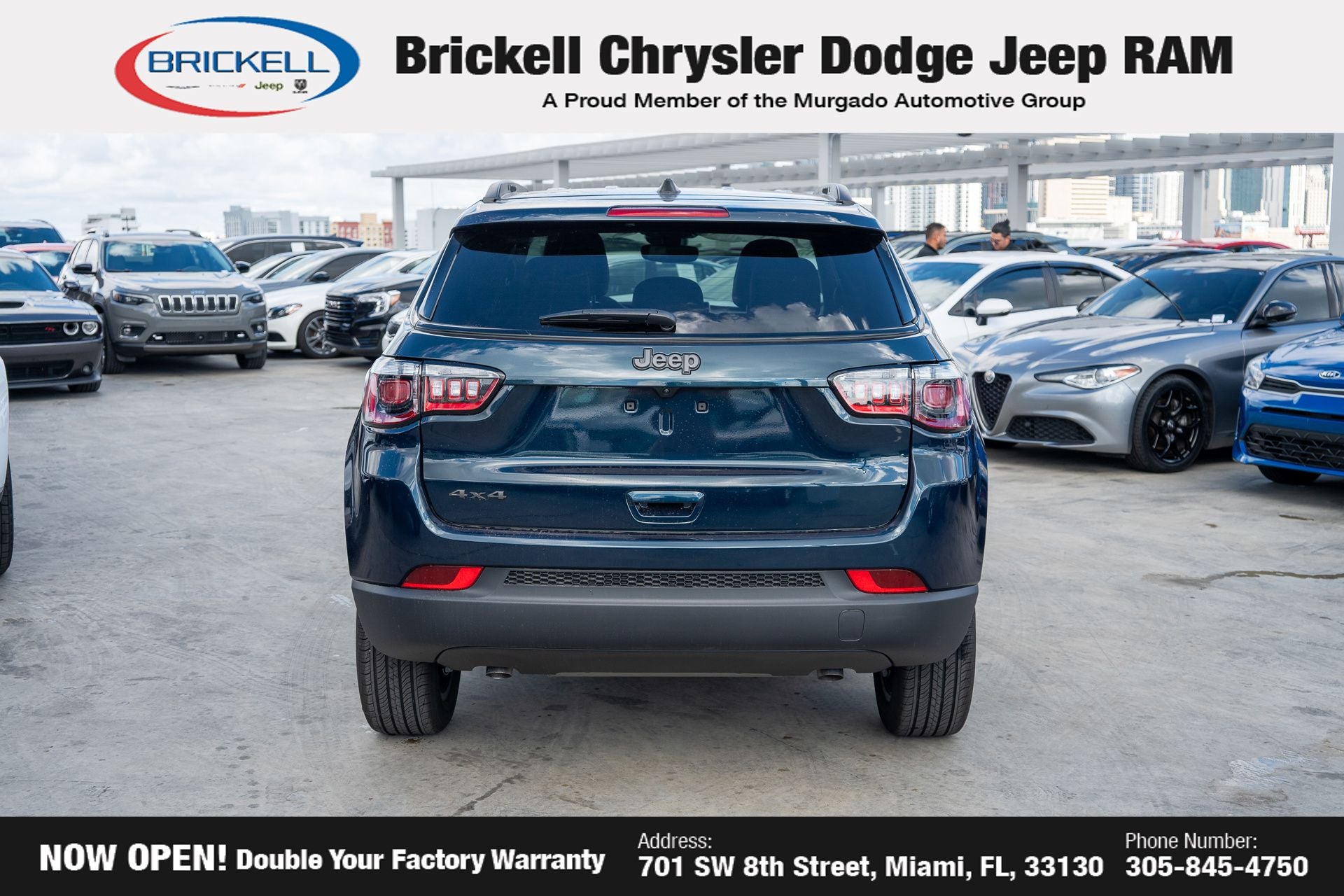Price includes: $1000 - 2026 National Retail Bonus Cash . Exp. 03/02/2026 $500 - 2026 National 2026 Military Bonus Cash . Exp. 01/04/2027 Discover Your Next Vehicle at Brickell Chrysler Dodge Jeep Ram Welcome to Brickell CDJR, where we go beyond selling cars. We double the factory powertrain warranty, giving you added peace of mind. Our dealership offers one of the largest new car inventories in the region, ensuring you find the right vehicle Prices displayed do not included our Perma-plate. Our state-of-the-art service department is the largest in the country and is open seven days a week from 7 AM to 9 PM. Visit us at 701 SW 8th St, Miami, FL 33130, or call 305-777-2800 to learn more and schedule a test drive. The displayed price includes an incentive for financing with Brickell CDJR Finance Company. Outside financing and bank drafts are not accepted. All pre-owned vehicle exports are subject to an export fee. Prices apply only to customers who live, work, or worship in Broward, Miami-Dade, Palm Beach, Monroe, Collier, Hendry, Lee, Glades, Martin, St. Lucie, Okeechobee, Manatee, Hillsborough, Osceola, or Orange County. Customers outside these counties will pay an additional $ Taxes, title, registration, and dealer fees apply. Factory MSRP: $33,580 fathom blue pearl coat 2026 Jeep Compass Latitude 4WD 8-Speed Automatic 2.0L I4 DOHC 4WD.