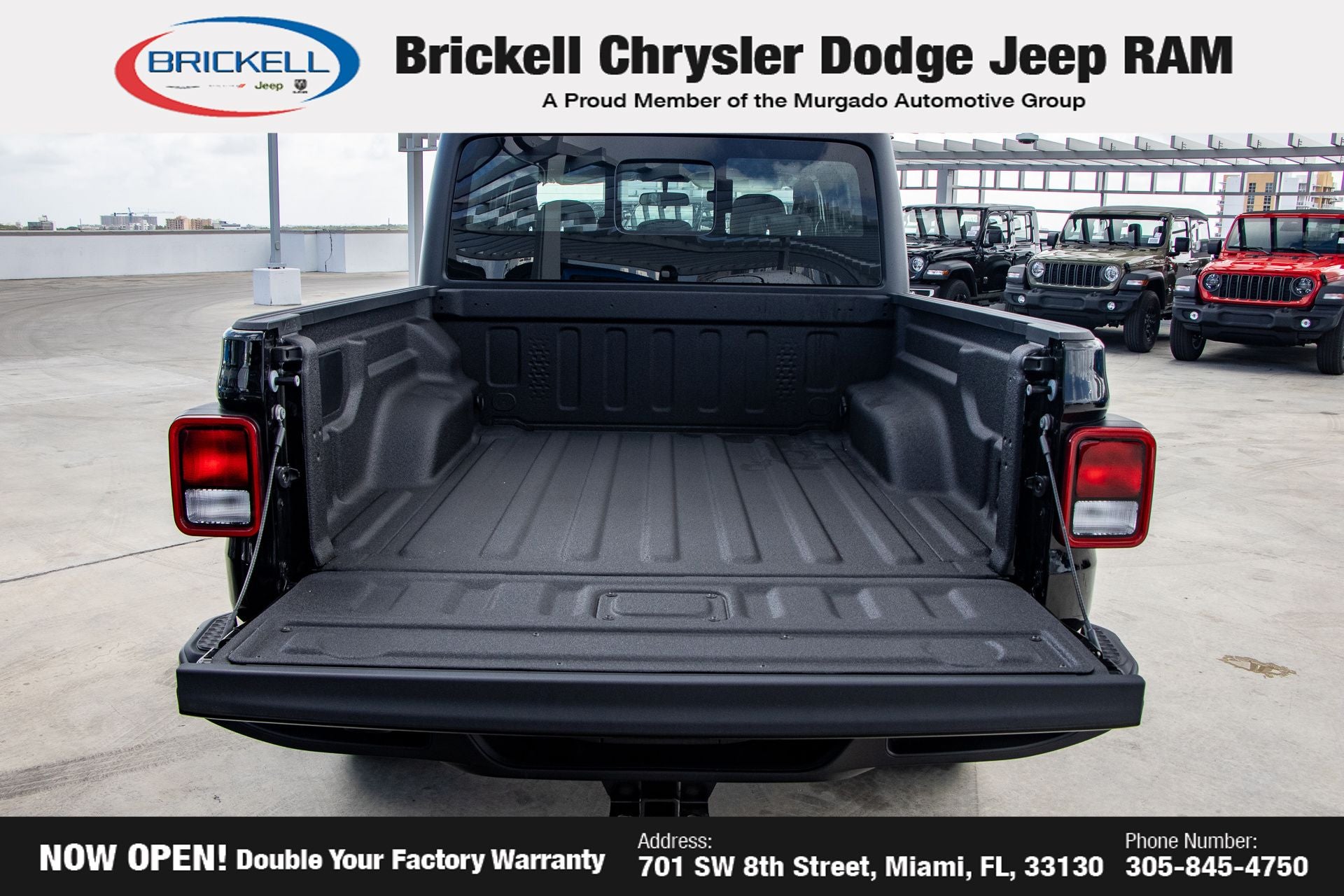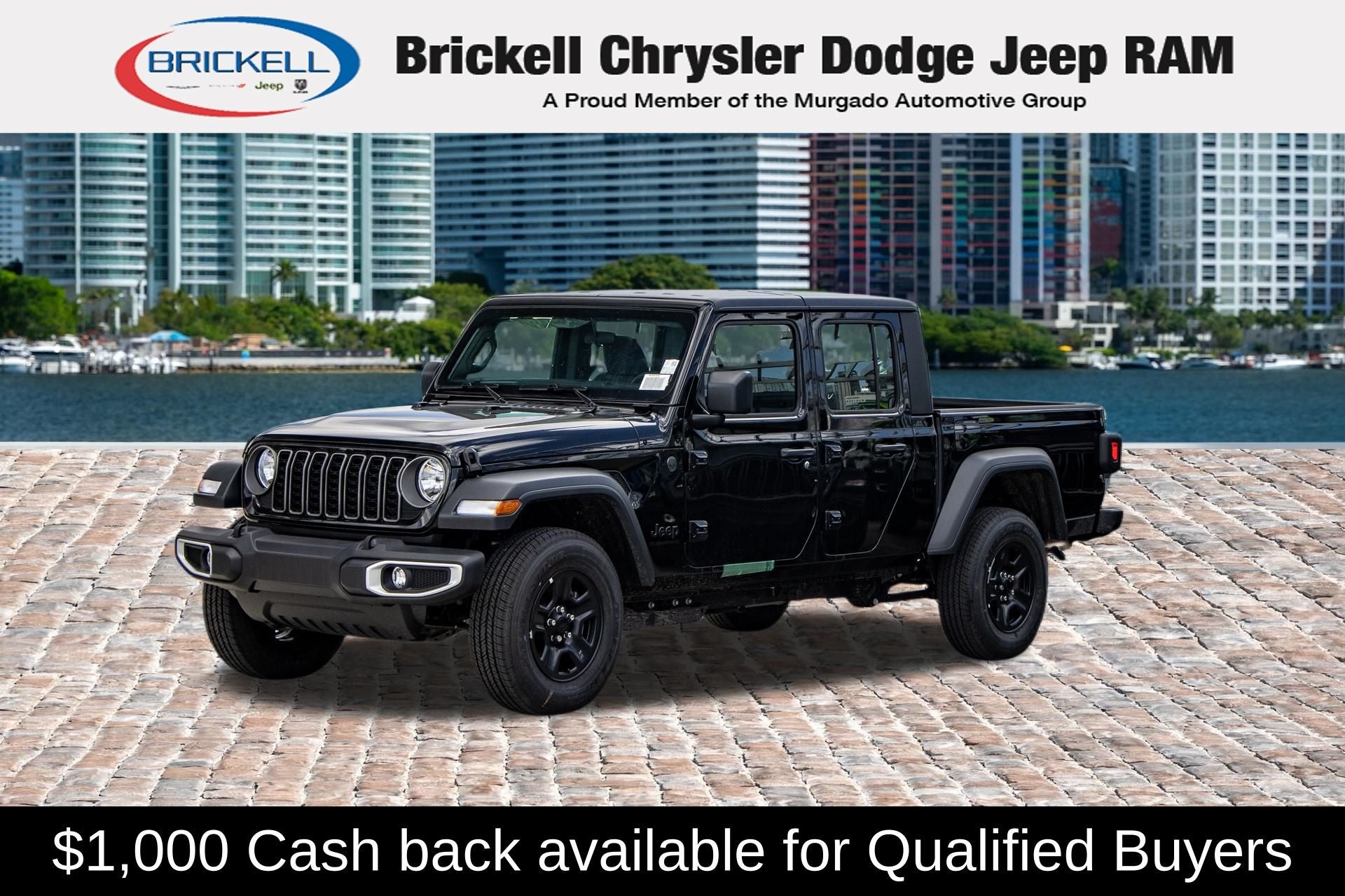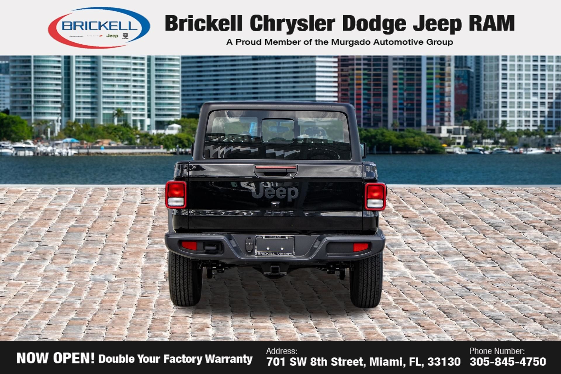 Price includes: $1000 - 2026 National Retail Bonus Cash . Exp. 04/30/2026 Discover Your Next Vehicle at Brickell Chrysler Dodge Jeep Ram Welcome to Brickell CDJR, where we go beyond selling cars. We double the factory powertrain warranty, giving you added peace of mind. Our dealership offers one of the largest new car inventories in the region, ensuring you find the right vehicle Prices displayed do not included our Perma-plate. Our state-of-the-art service department is the largest in the country and is open seven days a week from 7 AM to 9 PM. Visit us at 701 SW 8th St, Miami, FL 33130, or call 305-777-2800 to learn more and schedule a test drive. The displayed price includes an incentive for financing with Brickell CDJR Finance Company. Outside financing and bank drafts are not accepted. All pre-owned vehicle exports are subject to an export fee. Prices apply only to customers who live, work, or worship in Broward, Miami-Dade, Palm Beach, Monroe, Collier, Hendry, Lee, Glades, Martin, St. Lucie, Okeechobee, Manatee, Hillsborough, Osceola, or Orange County. Customers outside these counties will pay an additional $ Taxes, title, registration, and dealer fees apply. Factory MSRP: $45,035 Black Clearcoat 2026 Jeep Gladiator Sport 4WD 8-Speed Automatic 3.6L V6 24V VVT