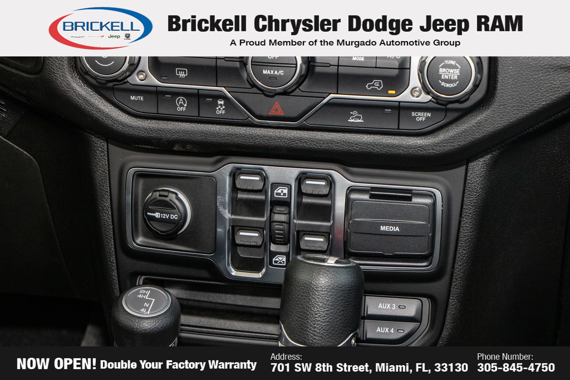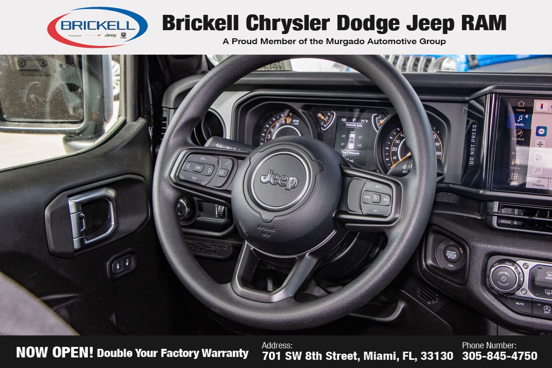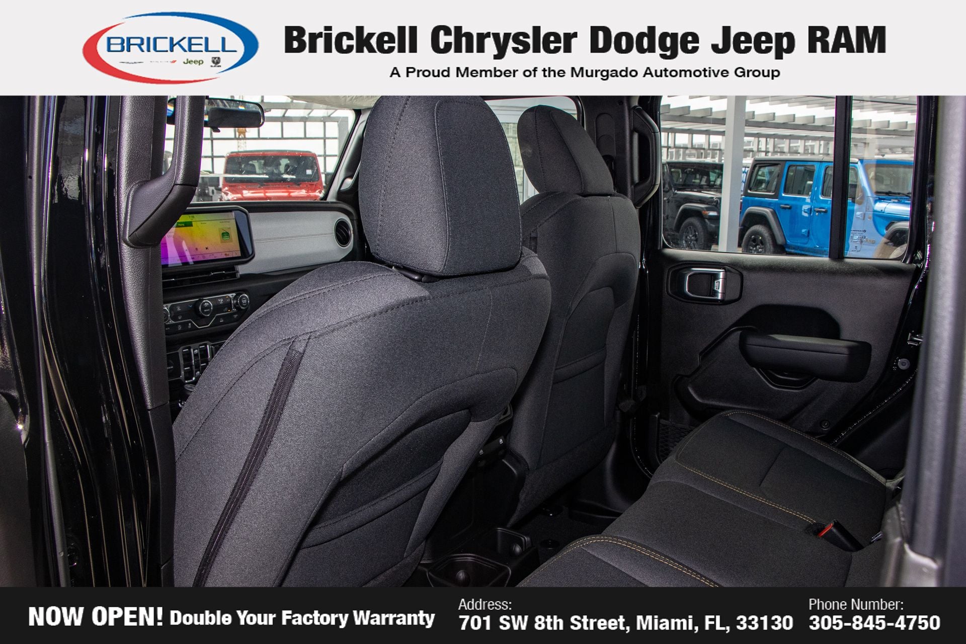 Price includes: $1000 - 2026 National Retail Bonus Cash . Exp. 04/30/2026 Discover Your Next Vehicle at Brickell Chrysler Dodge Jeep Ram Welcome to Brickell CDJR, where we go beyond selling cars. We double the factory powertrain warranty, giving you added peace of mind. Our dealership offers one of the largest new car inventories in the region, ensuring you find the right vehicle Prices displayed do not included our Perma-plate. Our state-of-the-art service department is the largest in the country and is open seven days a week from 7 AM to 9 PM. Visit us at 701 SW 8th St, Miami, FL 33130, or call 305-777-2800 to learn more and schedule a test drive. The displayed price includes an incentive for financing with Brickell CDJR Finance Company. Outside financing and bank drafts are not accepted. All pre-owned vehicle exports are subject to an export fee. Prices apply only to customers who live, work, or worship in Broward, Miami-Dade, Palm Beach, Monroe, Collier, Hendry, Lee, Glades, Martin, St. Lucie, Okeechobee, Manatee, Hillsborough, Osceola, or Orange County. Customers outside these counties will pay an additional $ Taxes, title, registration, and dealer fees apply. Factory MSRP: $45,035 Black Clearcoat 2026 Jeep Gladiator Sport 4WD 8-Speed Automatic 3.6L V6 24V VVT