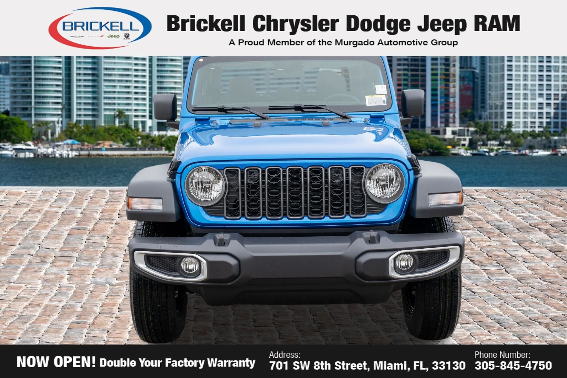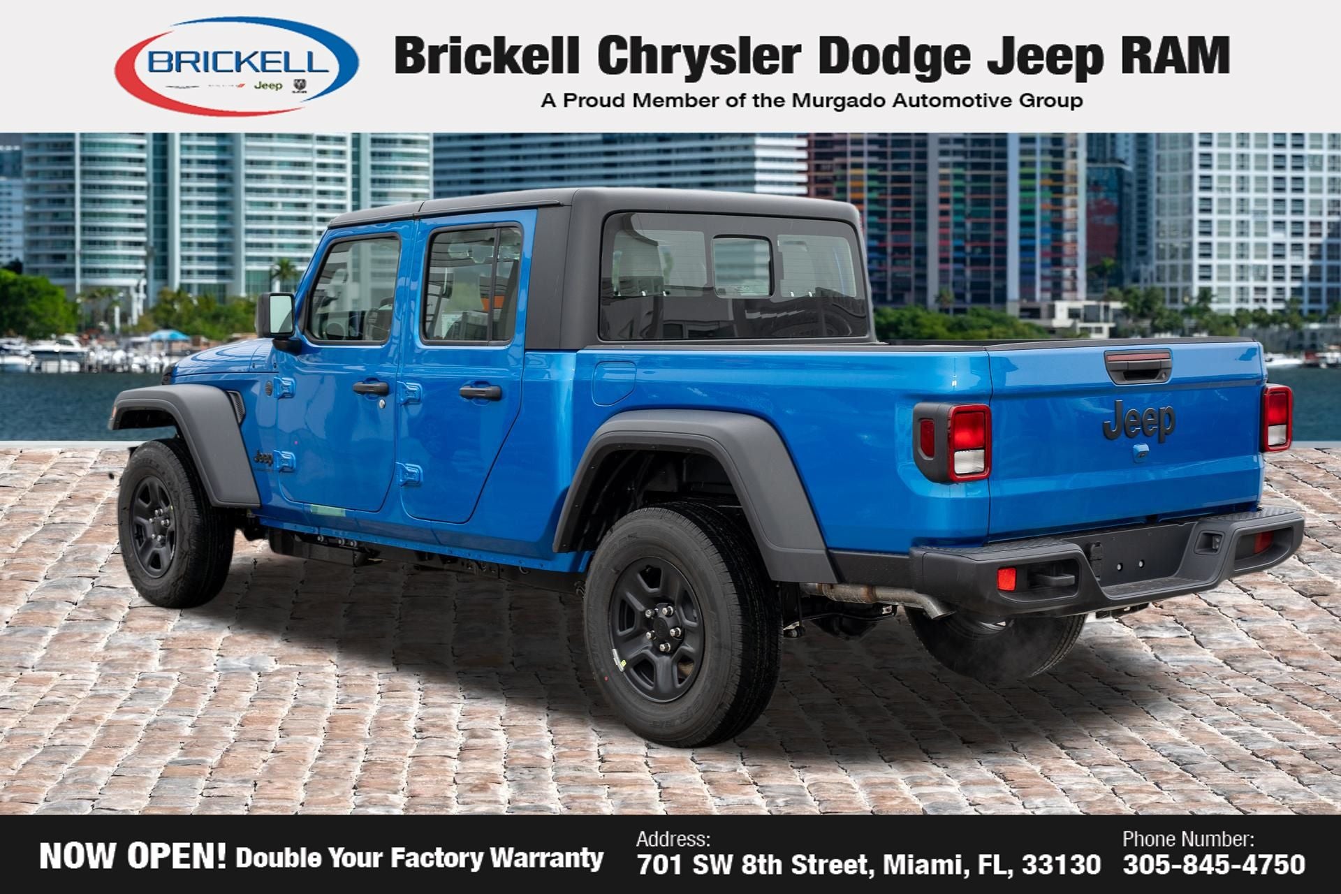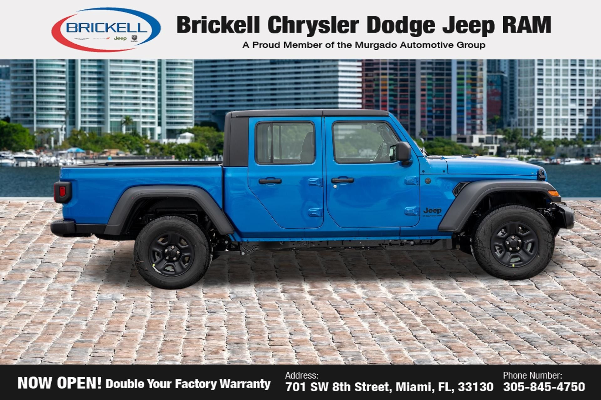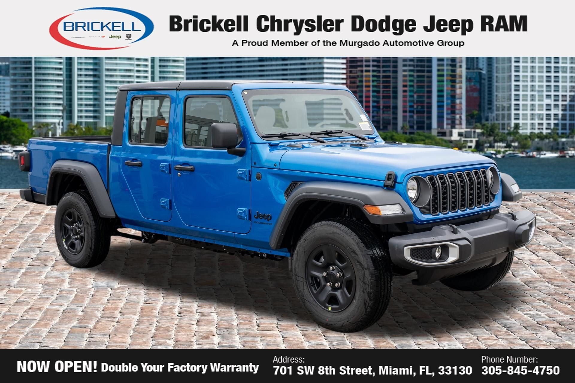 Price includes: $1000 - 2026 National Retail Bonus Cash . Exp. 04/30/2026 Discover Your Next Vehicle at Brickell Chrysler Dodge Jeep Ram Welcome to Brickell CDJR, where we go beyond selling cars. We double the factory powertrain warranty, giving you added peace of mind. Our dealership offers one of the largest new car inventories in the region, ensuring you find the right vehicle Prices displayed do not included our Perma-plate. Our state-of-the-art service department is the largest in the country and is open seven days a week from 7 AM to 9 PM. Visit us at 701 SW 8th St, Miami, FL 33130, or call 305-777-2800 to learn more and schedule a test drive. The displayed price includes an incentive for financing with Brickell CDJR Finance Company. Outside financing and bank drafts are not accepted. All pre-owned vehicle exports are subject to an export fee. Prices apply only to customers who live, work, or worship in Broward, Miami-Dade, Palm Beach, Monroe, Collier, Hendry, Lee, Glades, Martin, St. Lucie, Okeechobee, Manatee, Hillsborough, Osceola, or Orange County. Customers outside these counties will pay an additional $ Taxes, title, registration, and dealer fees apply. Factory MSRP: $43,445 Hydro Blue Pearlcoat 2026 Jeep Gladiator Sport 4WD 8-Speed Automatic 3.6L V6 24V VVT