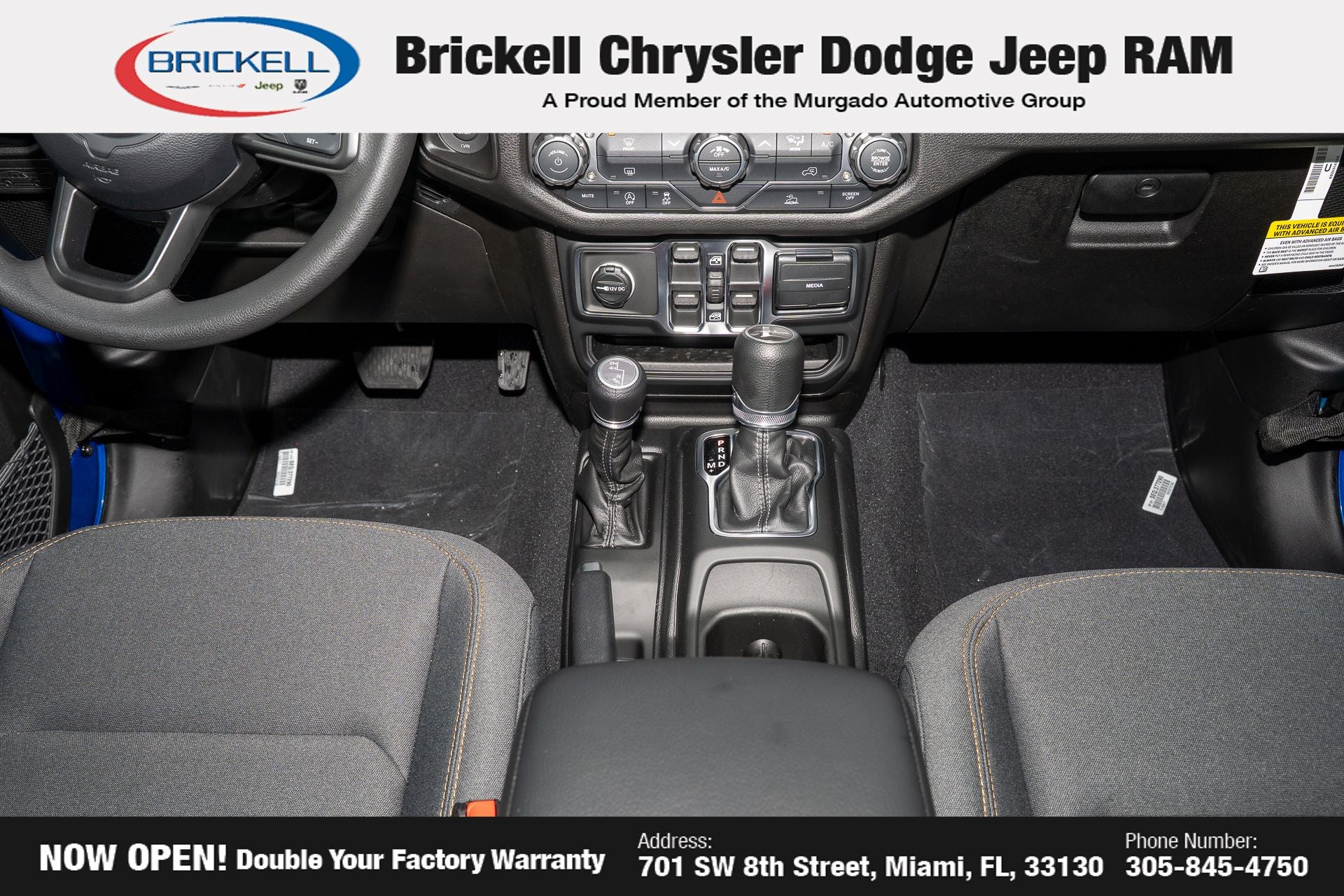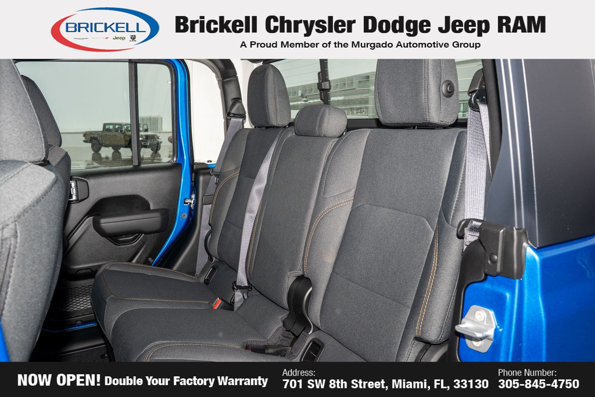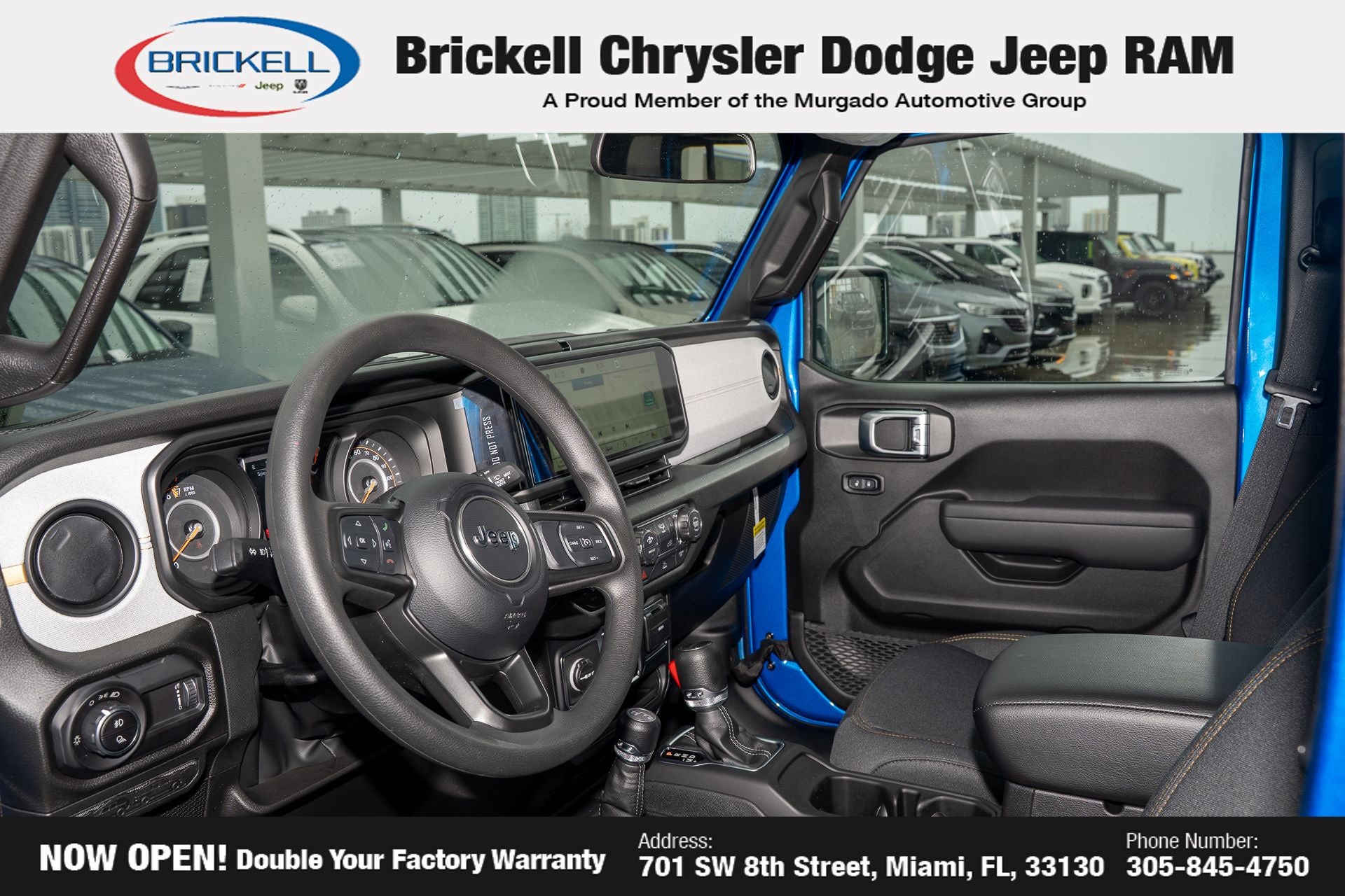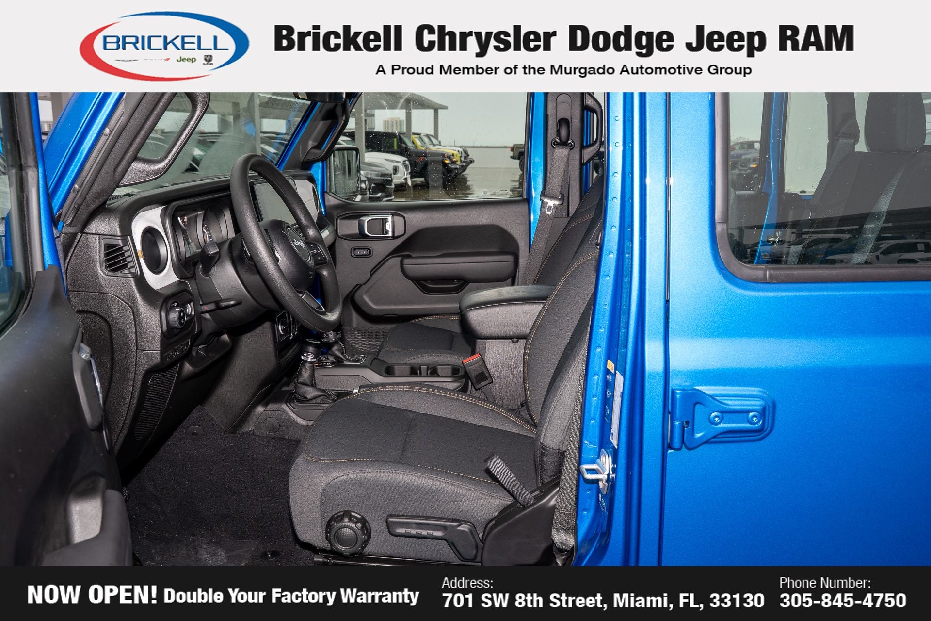 Price includes: $1000 - 2026 National Retail Bonus Cash . Exp. 04/30/2026 Discover Your Next Vehicle at Brickell Chrysler Dodge Jeep Ram Welcome to Brickell CDJR, where we go beyond selling cars. We double the factory powertrain warranty, giving you added peace of mind. Our dealership offers one of the largest new car inventories in the region, ensuring you find the right vehicle Prices displayed do not included our Perma-plate. Our state-of-the-art service department is the largest in the country and is open seven days a week from 7 AM to 9 PM. Visit us at 701 SW 8th St, Miami, FL 33130, or call 305-777-2800 to learn more and schedule a test drive. The displayed price includes an incentive for financing with Brickell CDJR Finance Company. Outside financing and bank drafts are not accepted. All pre-owned vehicle exports are subject to an export fee. Prices apply only to customers who live, work, or worship in Broward, Miami-Dade, Palm Beach, Monroe, Collier, Hendry, Lee, Glades, Martin, St. Lucie, Okeechobee, Manatee, Hillsborough, Osceola, or Orange County. Customers outside these counties will pay an additional $ Taxes, title, registration, and dealer fees apply. Factory MSRP: $43,445 Hydro Blue Pearlcoat 2026 Jeep Gladiator Sport 4WD 8-Speed Automatic 3.6L V6 24V VVT