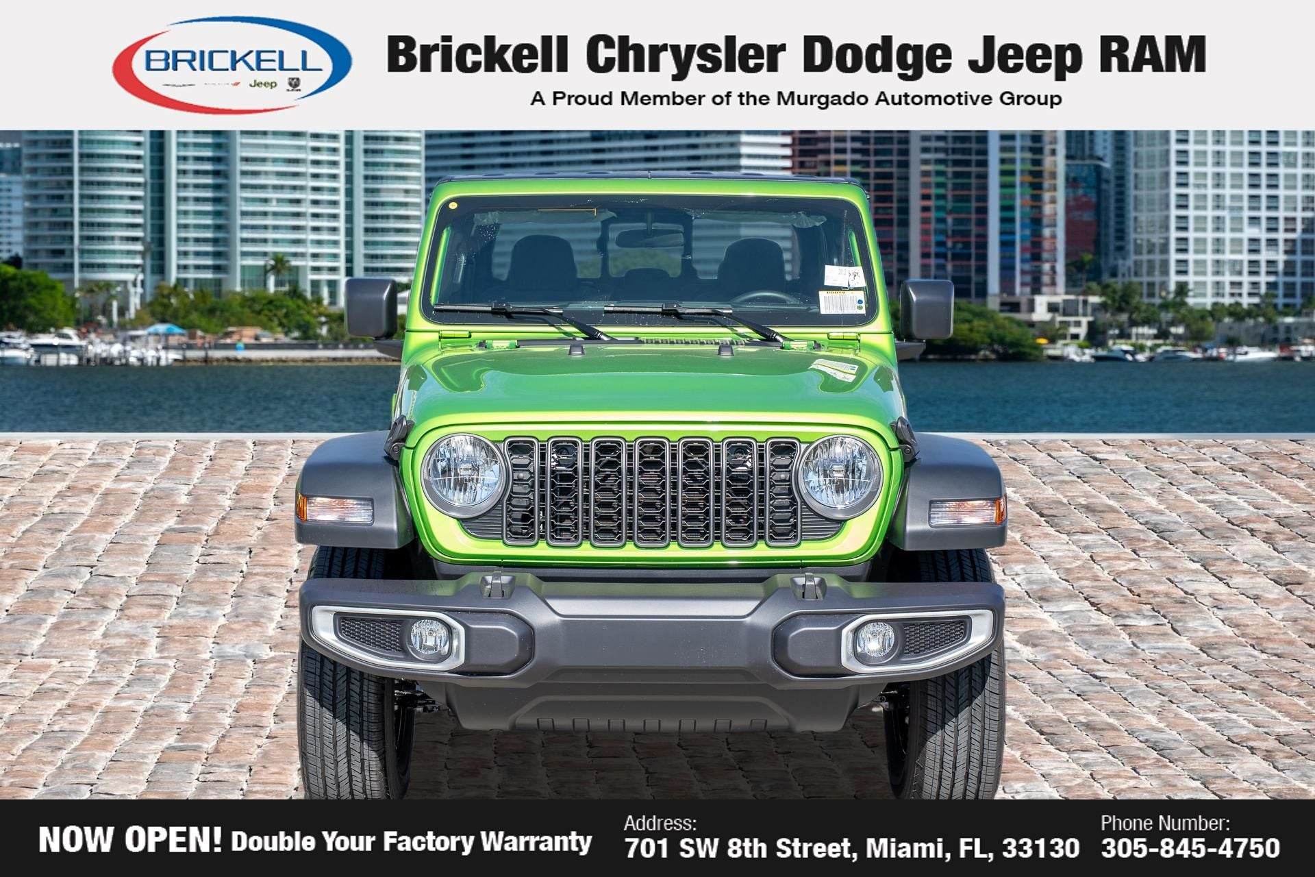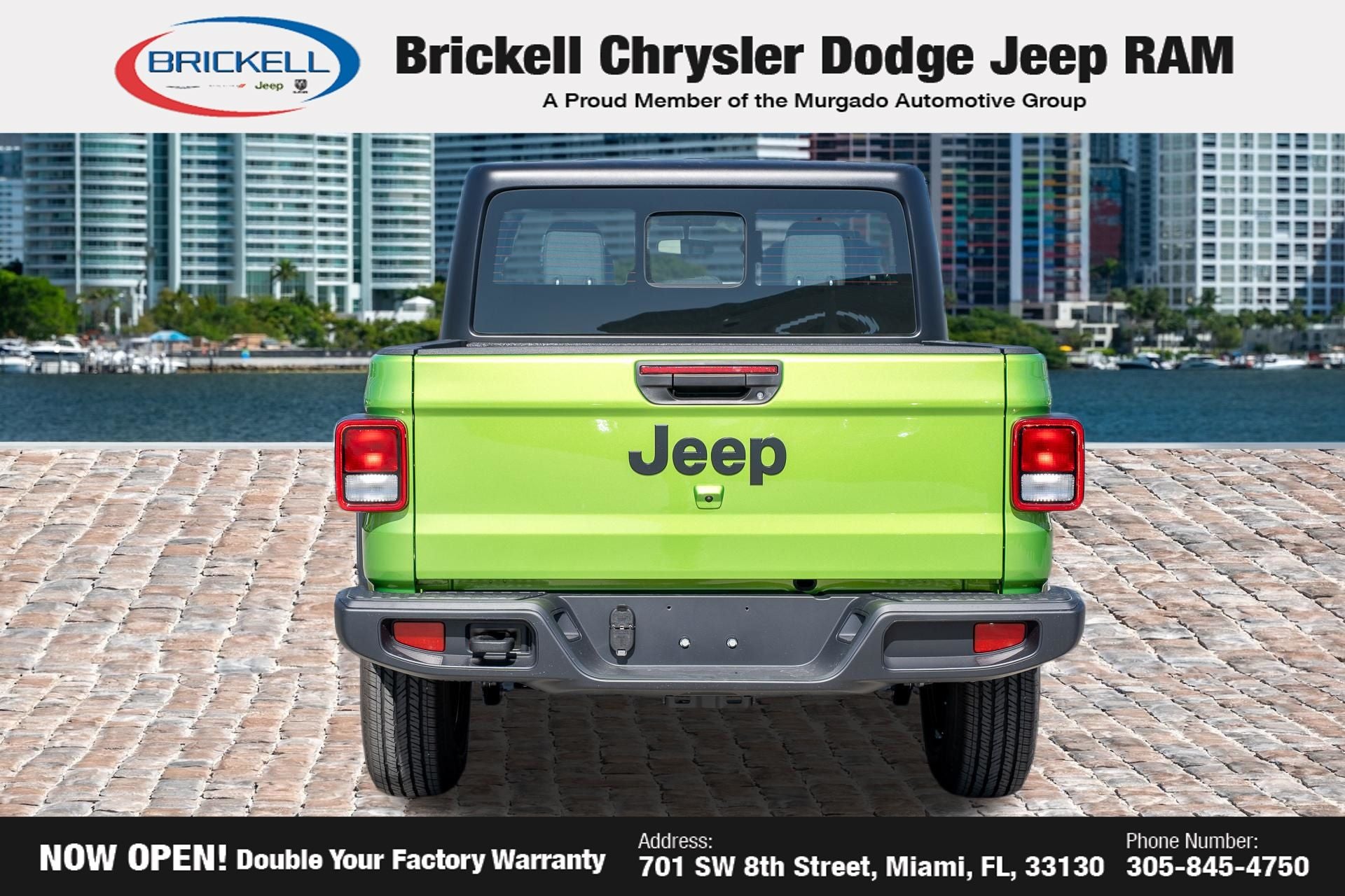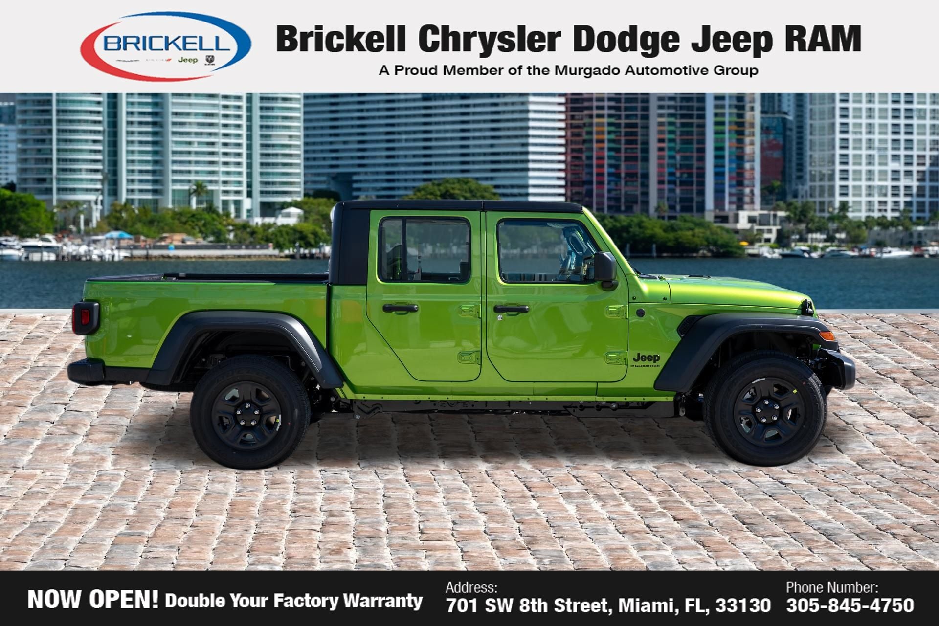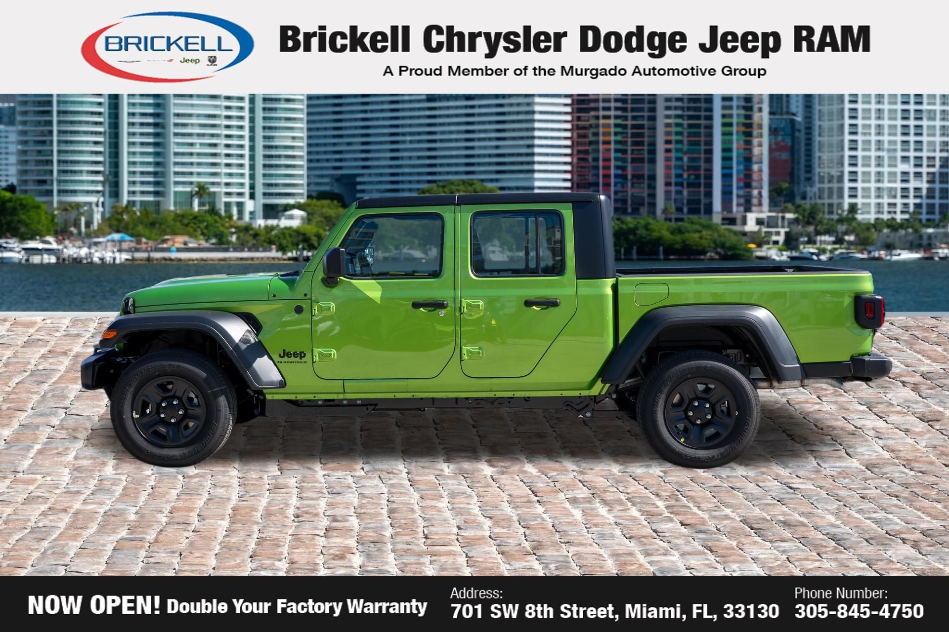 Price includes: $1000 - 2026 National Retail Bonus Cash . Exp. 04/30/2026 Discover Your Next Vehicle at Brickell Chrysler Dodge Jeep Ram Welcome to Brickell CDJR, where we go beyond selling cars. We double the factory powertrain warranty, giving you added peace of mind. Our dealership offers one of the largest new car inventories in the region, ensuring you find the right vehicle Prices displayed do not included our Perma-plate. Our state-of-the-art service department is the largest in the country and is open seven days a week from 7 AM to 9 PM. Visit us at 701 SW 8th St, Miami, FL 33130, or call 305-777-2800 to learn more and schedule a test drive. The displayed price includes an incentive for financing with Brickell CDJR Finance Company. Outside financing and bank drafts are not accepted. All pre-owned vehicle exports are subject to an export fee. Prices apply only to customers who live, work, or worship in Broward, Miami-Dade, Palm Beach, Monroe, Collier, Hendry, Lee, Glades, Martin, St. Lucie, Okeechobee, Manatee, Hillsborough, Osceola, or Orange County. Customers outside these counties will pay an additional $ Taxes, title, registration, and dealer fees apply. Factory MSRP: $44,040 Mojito 2026 Jeep Gladiator Sport 4WD 8-Speed Automatic 3.6L V6 24V VVT