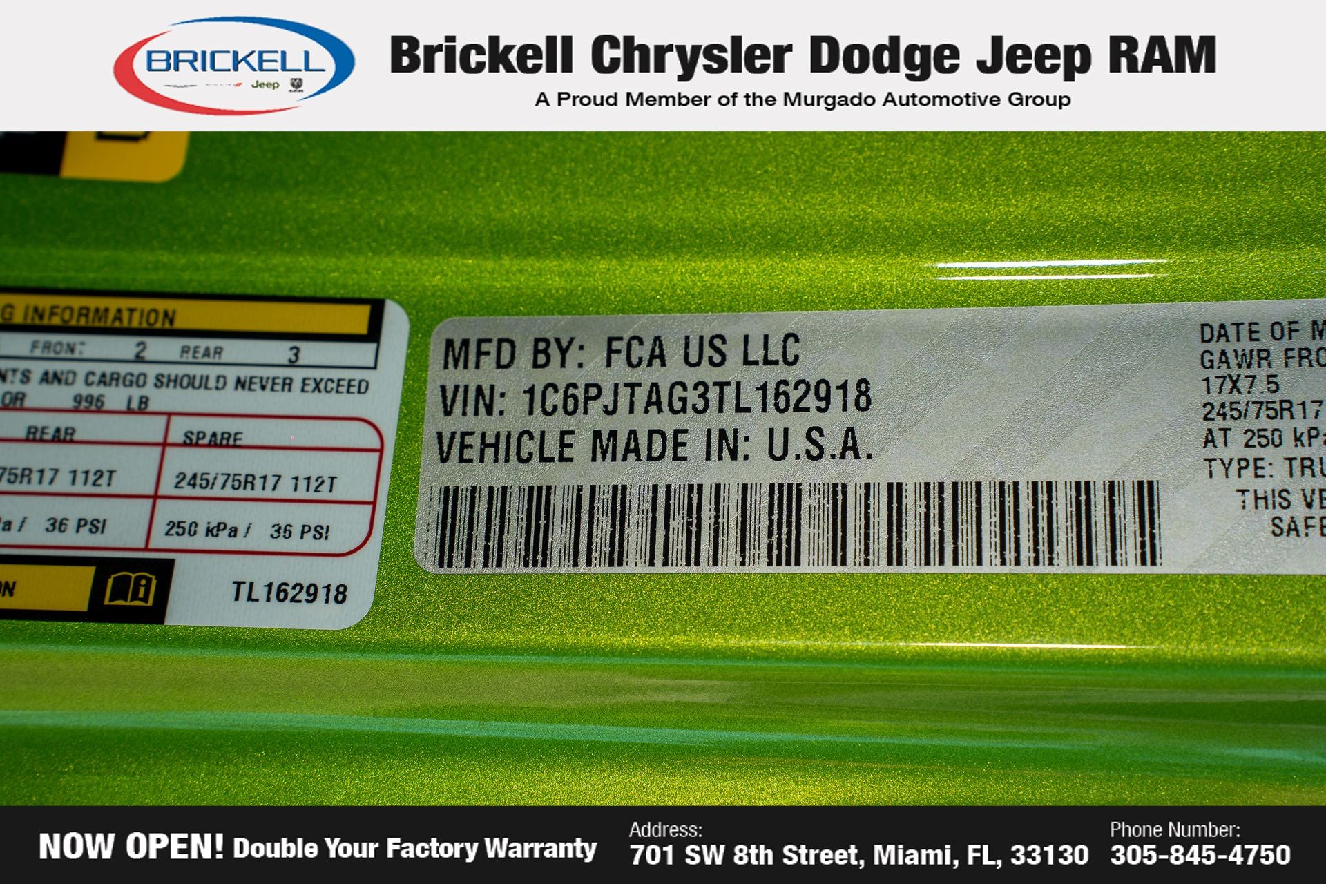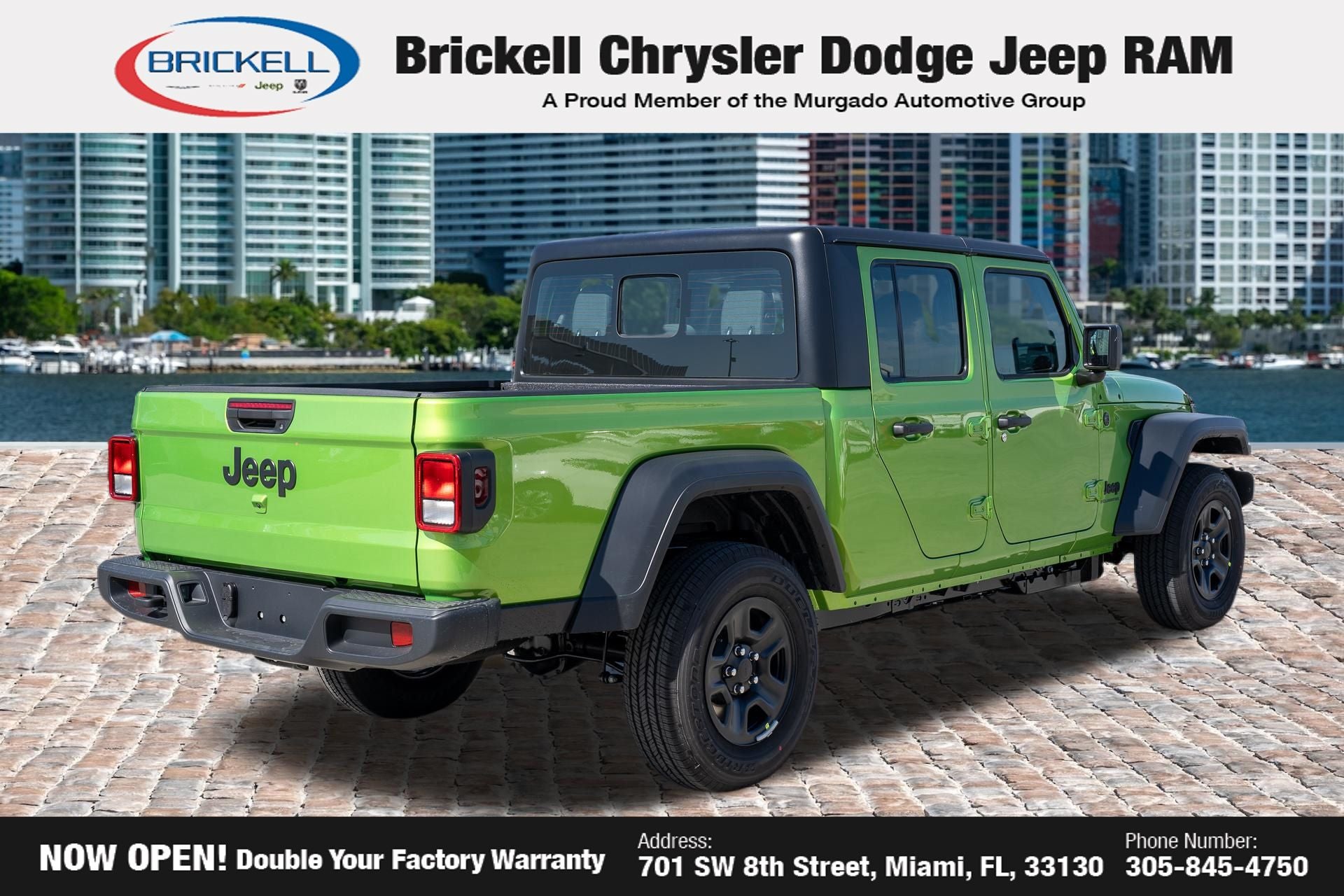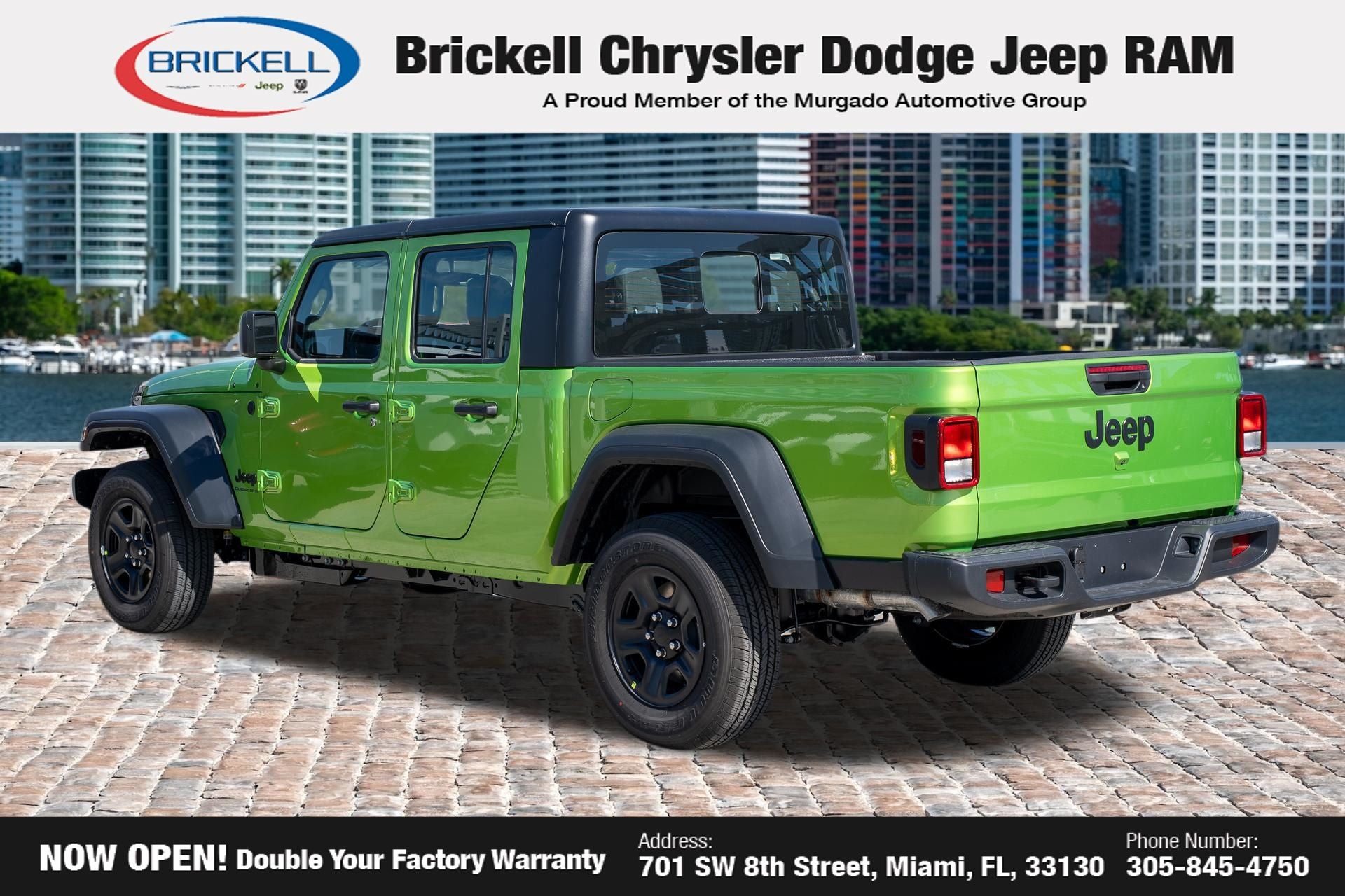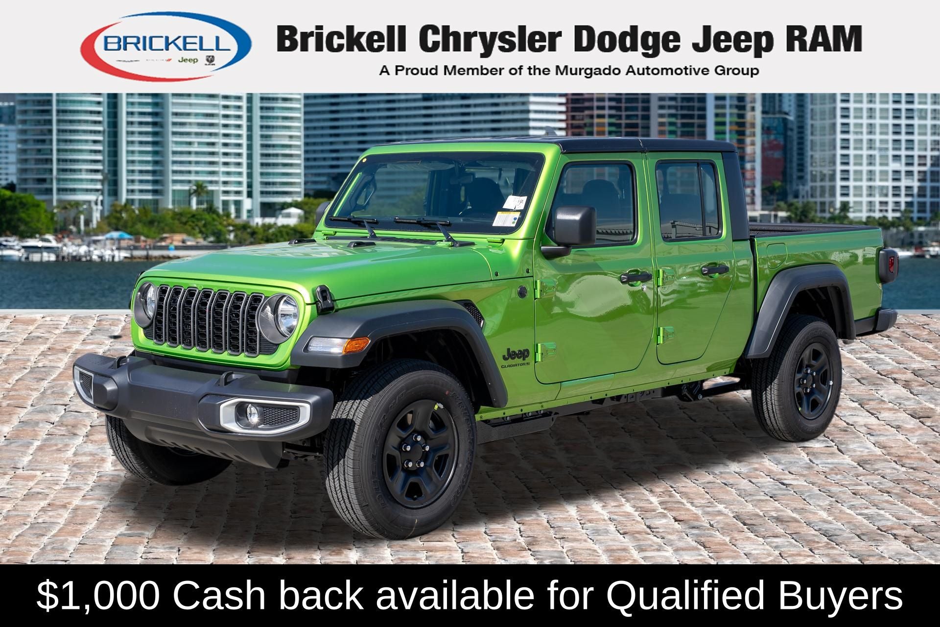 Price includes: $1000 - 2026 National Retail Bonus Cash . Exp. 04/30/2026 Discover Your Next Vehicle at Brickell Chrysler Dodge Jeep Ram Welcome to Brickell CDJR, where we go beyond selling cars. We double the factory powertrain warranty, giving you added peace of mind. Our dealership offers one of the largest new car inventories in the region, ensuring you find the right vehicle Prices displayed do not included our Perma-plate. Our state-of-the-art service department is the largest in the country and is open seven days a week from 7 AM to 9 PM. Visit us at 701 SW 8th St, Miami, FL 33130, or call 305-777-2800 to learn more and schedule a test drive. The displayed price includes an incentive for financing with Brickell CDJR Finance Company. Outside financing and bank drafts are not accepted. All pre-owned vehicle exports are subject to an export fee. Prices apply only to customers who live, work, or worship in Broward, Miami-Dade, Palm Beach, Monroe, Collier, Hendry, Lee, Glades, Martin, St. Lucie, Okeechobee, Manatee, Hillsborough, Osceola, or Orange County. Customers outside these counties will pay an additional $ Taxes, title, registration, and dealer fees apply. Factory MSRP: $44,040 Mojito 2026 Jeep Gladiator Sport 4WD 8-Speed Automatic 3.6L V6 24V VVT