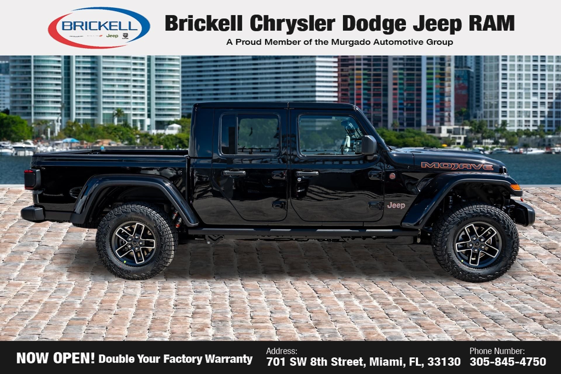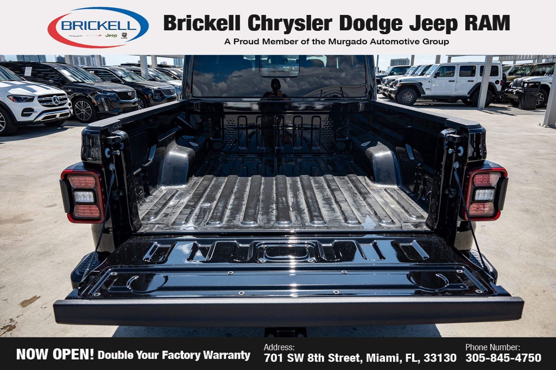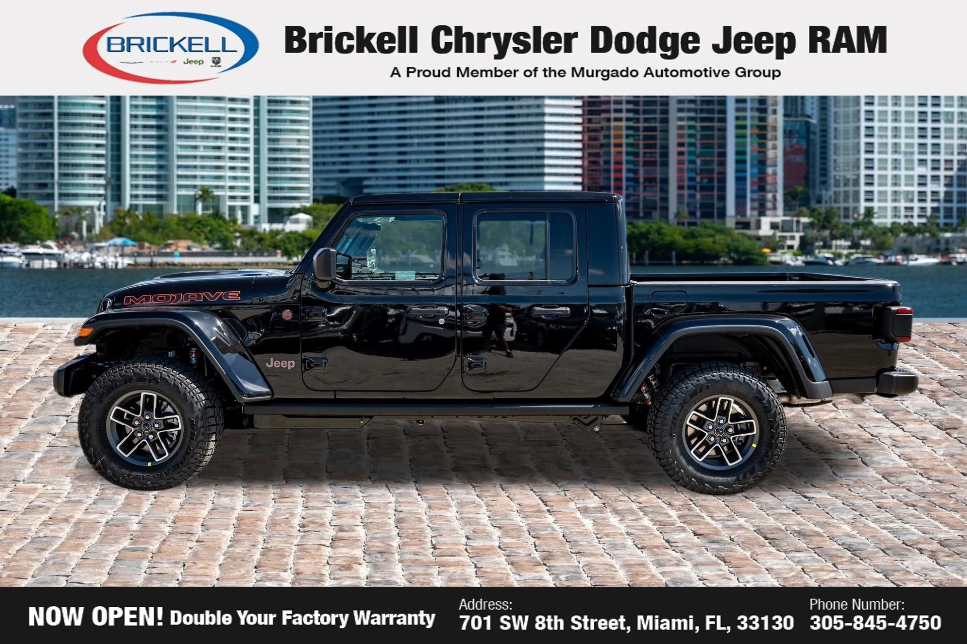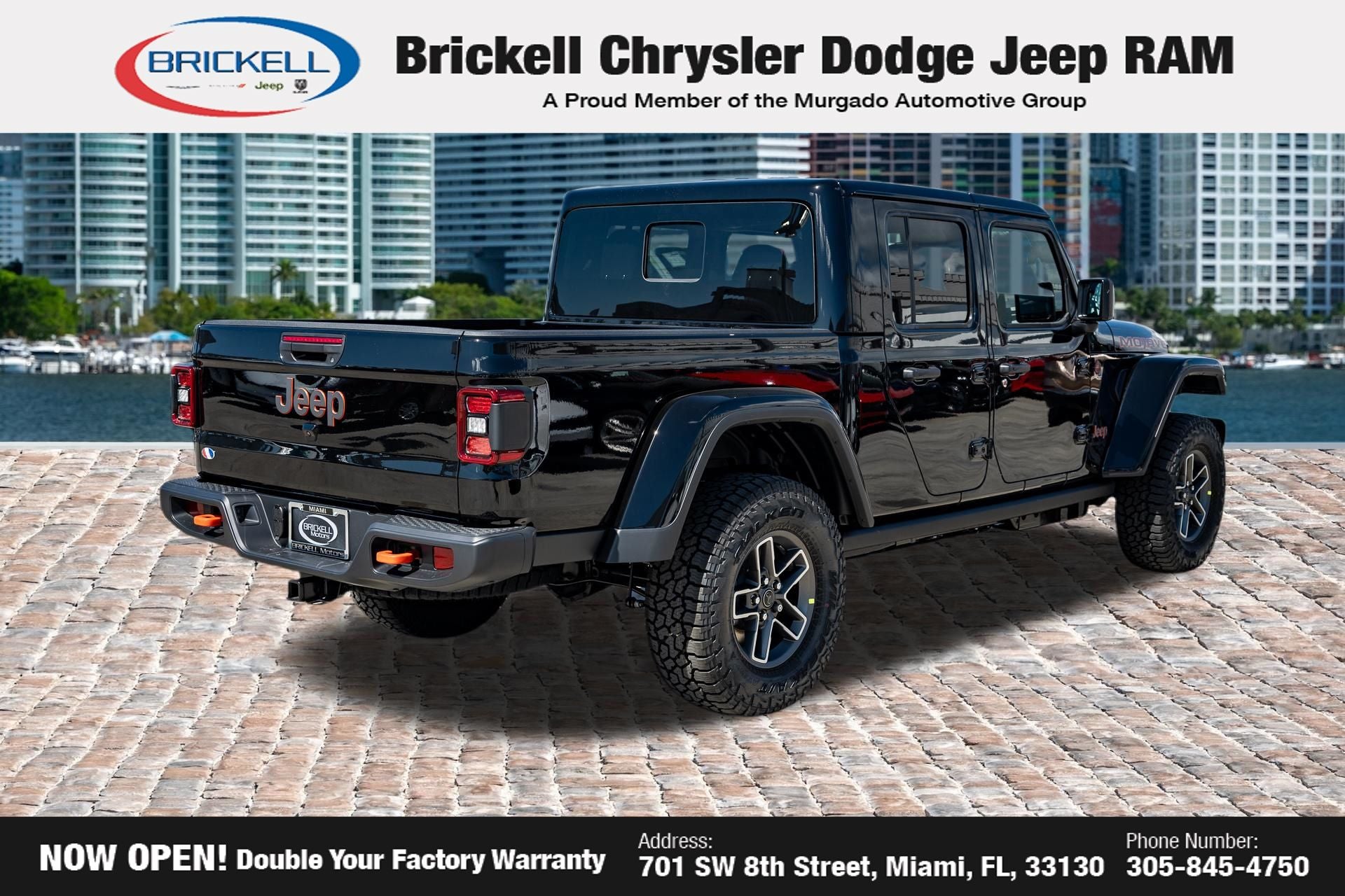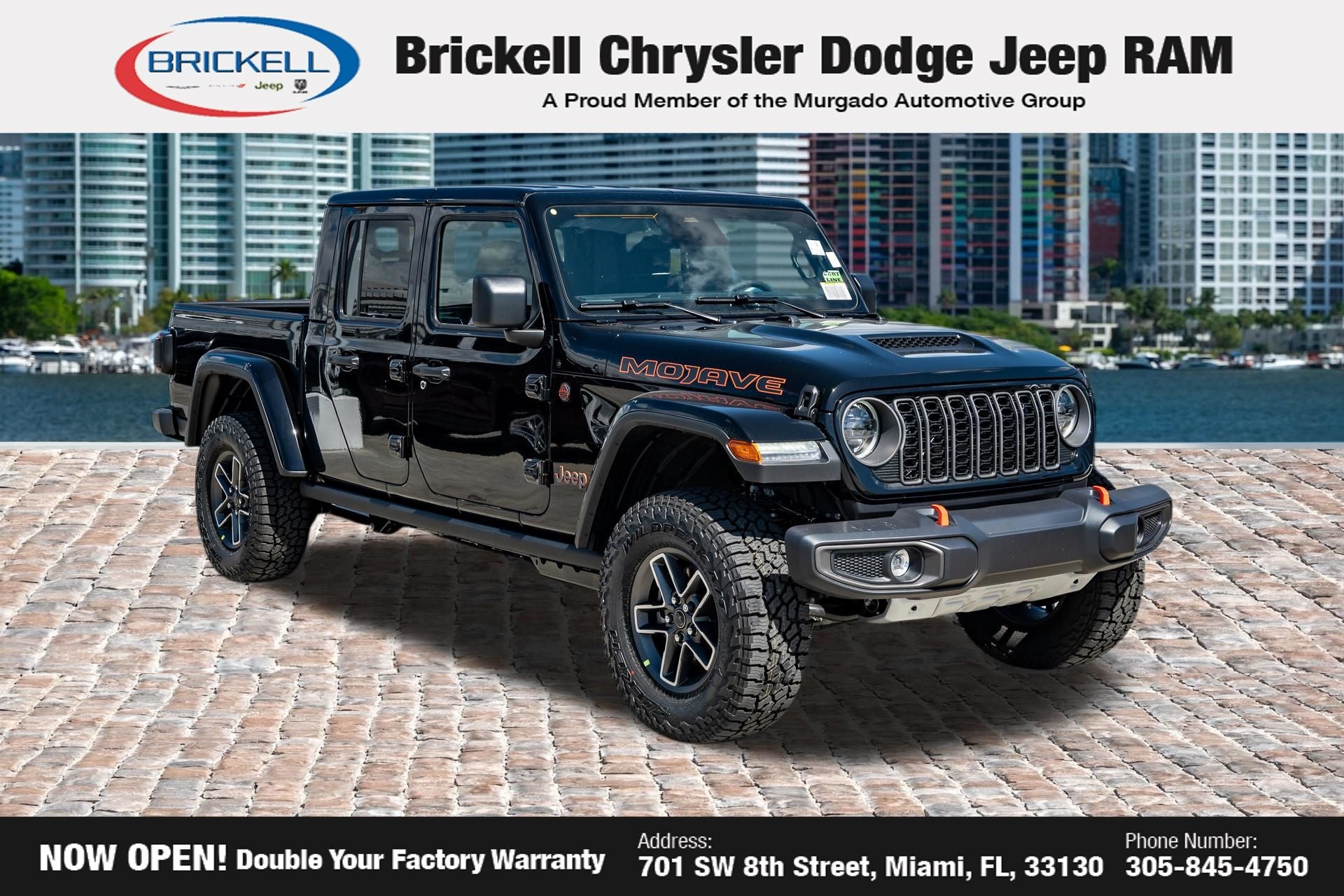 Price includes: $1000 - 2026 National Retail Bonus Cash . Exp. 04/30/2026 Discover Your Next Vehicle at Brickell Chrysler Dodge Jeep Ram Welcome to Brickell CDJR, where we go beyond selling cars. We double the factory powertrain warranty, giving you added peace of mind. Our dealership offers one of the largest new car inventories in the region, ensuring you find the right vehicle Prices displayed do not included our Perma-plate. Our state-of-the-art service department is the largest in the country and is open seven days a week from 7 AM to 9 PM. Visit us at 701 SW 8th St, Miami, FL 33130, or call 305-777-2800 to learn more and schedule a test drive. The displayed price includes an incentive for financing with Brickell CDJR Finance Company. Outside financing and bank drafts are not accepted. All pre-owned vehicle exports are subject to an export fee. Prices apply only to customers who live, work, or worship in Broward, Miami-Dade, Palm Beach, Monroe, Collier, Hendry, Lee, Glades, Martin, St. Lucie, Okeechobee, Manatee, Hillsborough, Osceola, or Orange County. Customers outside these counties will pay an additional $ Taxes, title, registration, and dealer fees apply. Factory MSRP: $45,035 Granite Crystal Metallic Clearcoat 2026 Jeep Gladiator Sport 4WD 8-Speed Automatic 3.6L V6 24V VVT