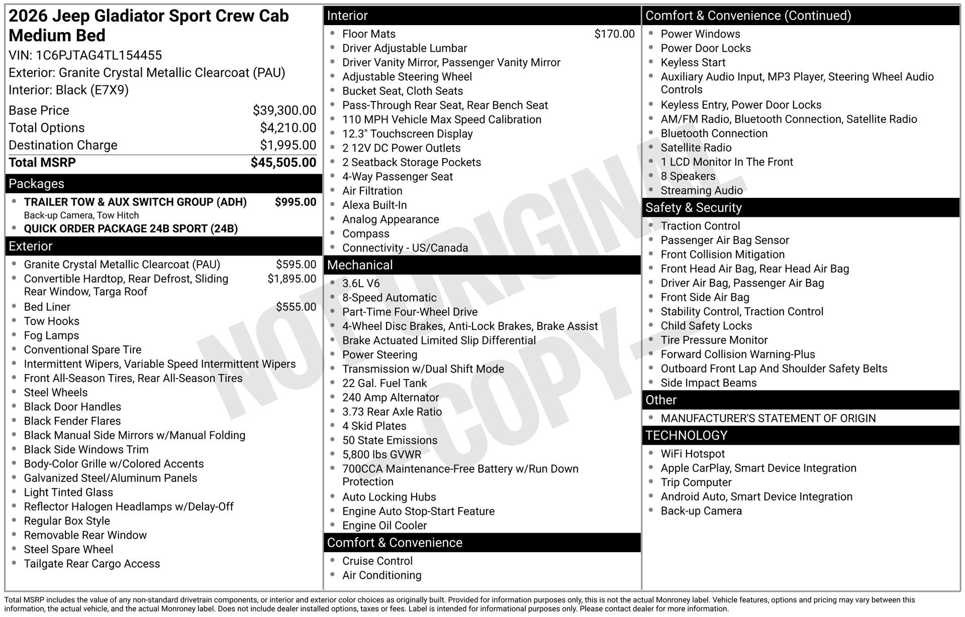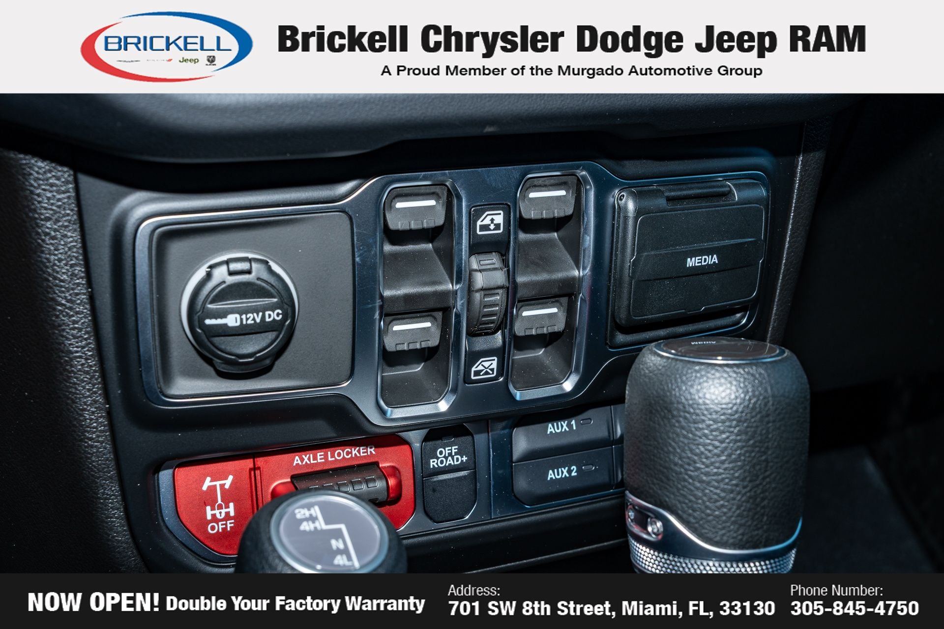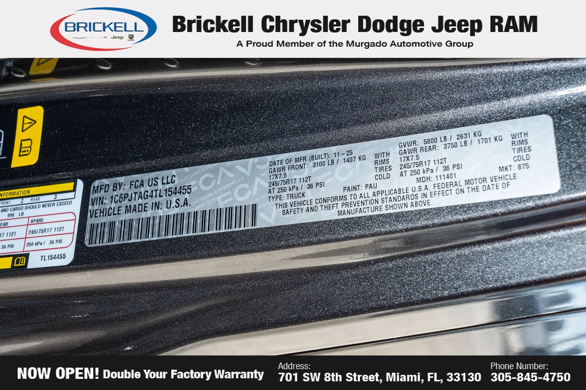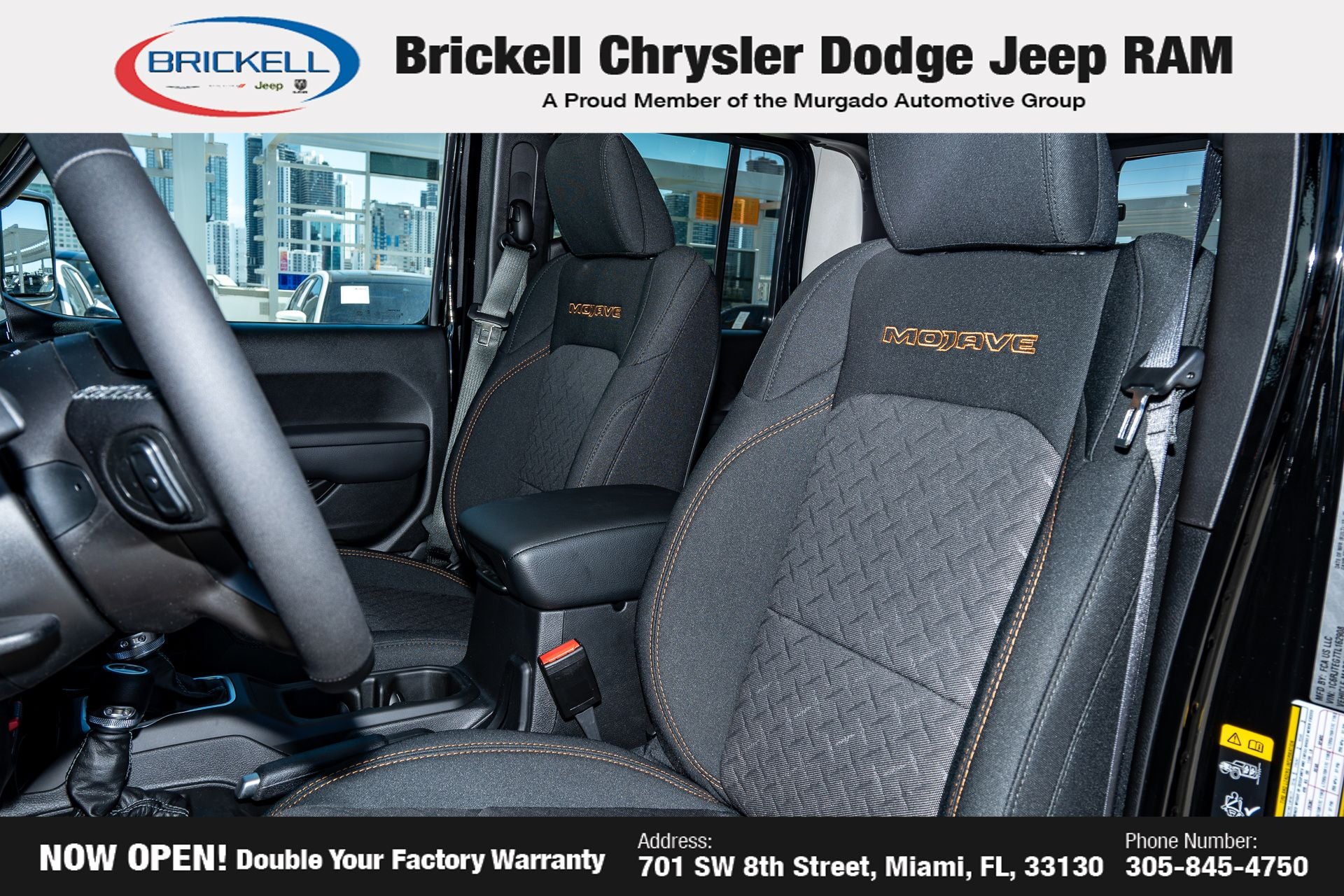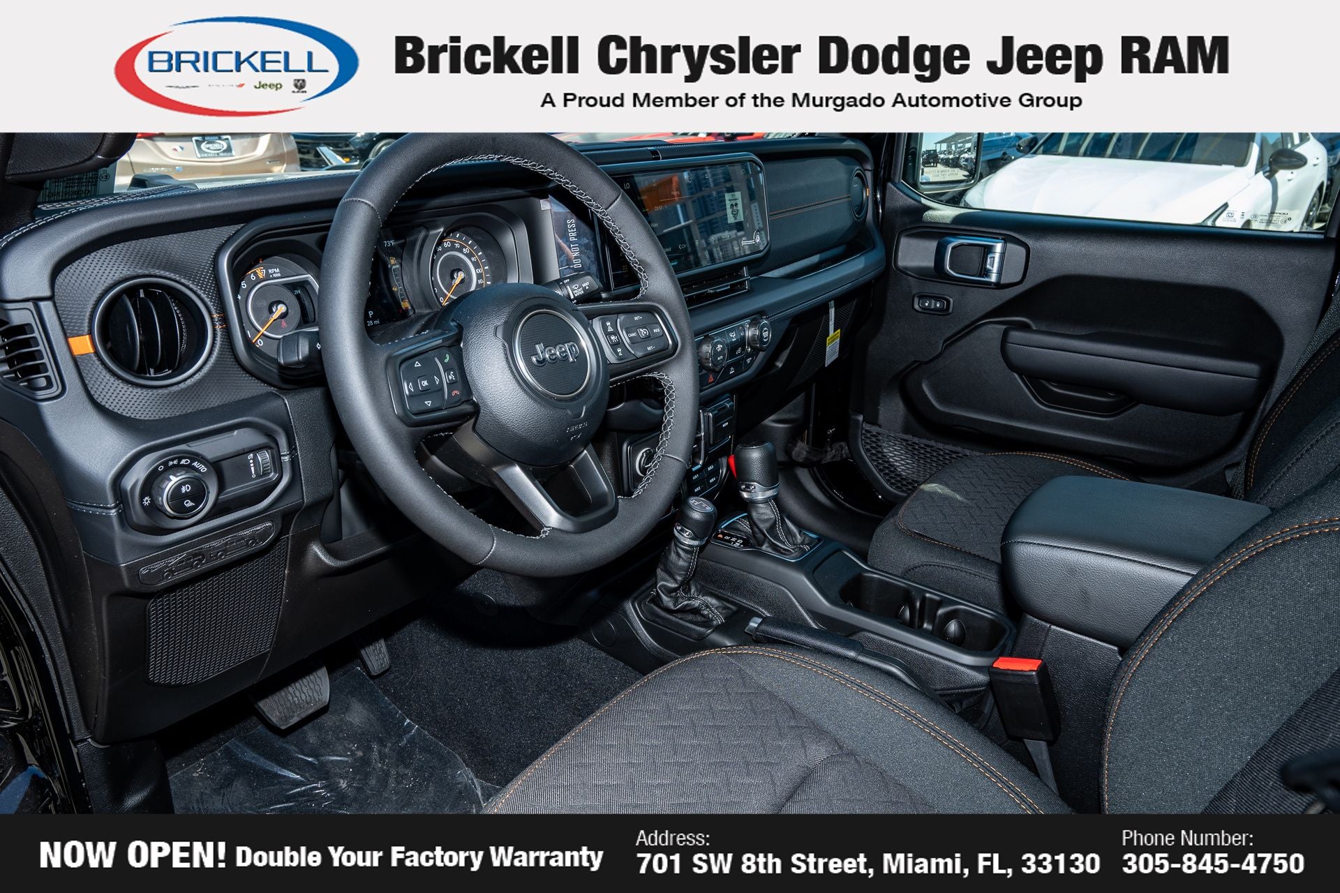 Price includes: $1000 - 2026 National Retail Bonus Cash . Exp. 04/30/2026 Discover Your Next Vehicle at Brickell Chrysler Dodge Jeep Ram Welcome to Brickell CDJR, where we go beyond selling cars. We double the factory powertrain warranty, giving you added peace of mind. Our dealership offers one of the largest new car inventories in the region, ensuring you find the right vehicle Prices displayed do not included our Perma-plate. Our state-of-the-art service department is the largest in the country and is open seven days a week from 7 AM to 9 PM. Visit us at 701 SW 8th St, Miami, FL 33130, or call 305-777-2800 to learn more and schedule a test drive. The displayed price includes an incentive for financing with Brickell CDJR Finance Company. Outside financing and bank drafts are not accepted. All pre-owned vehicle exports are subject to an export fee. Prices apply only to customers who live, work, or worship in Broward, Miami-Dade, Palm Beach, Monroe, Collier, Hendry, Lee, Glades, Martin, St. Lucie, Okeechobee, Manatee, Hillsborough, Osceola, or Orange County. Customers outside these counties will pay an additional $ Taxes, title, registration, and dealer fees apply. Factory MSRP: $45,035 Granite Crystal Metallic Clearcoat 2026 Jeep Gladiator Sport 4WD 8-Speed Automatic 3.6L V6 24V VVT