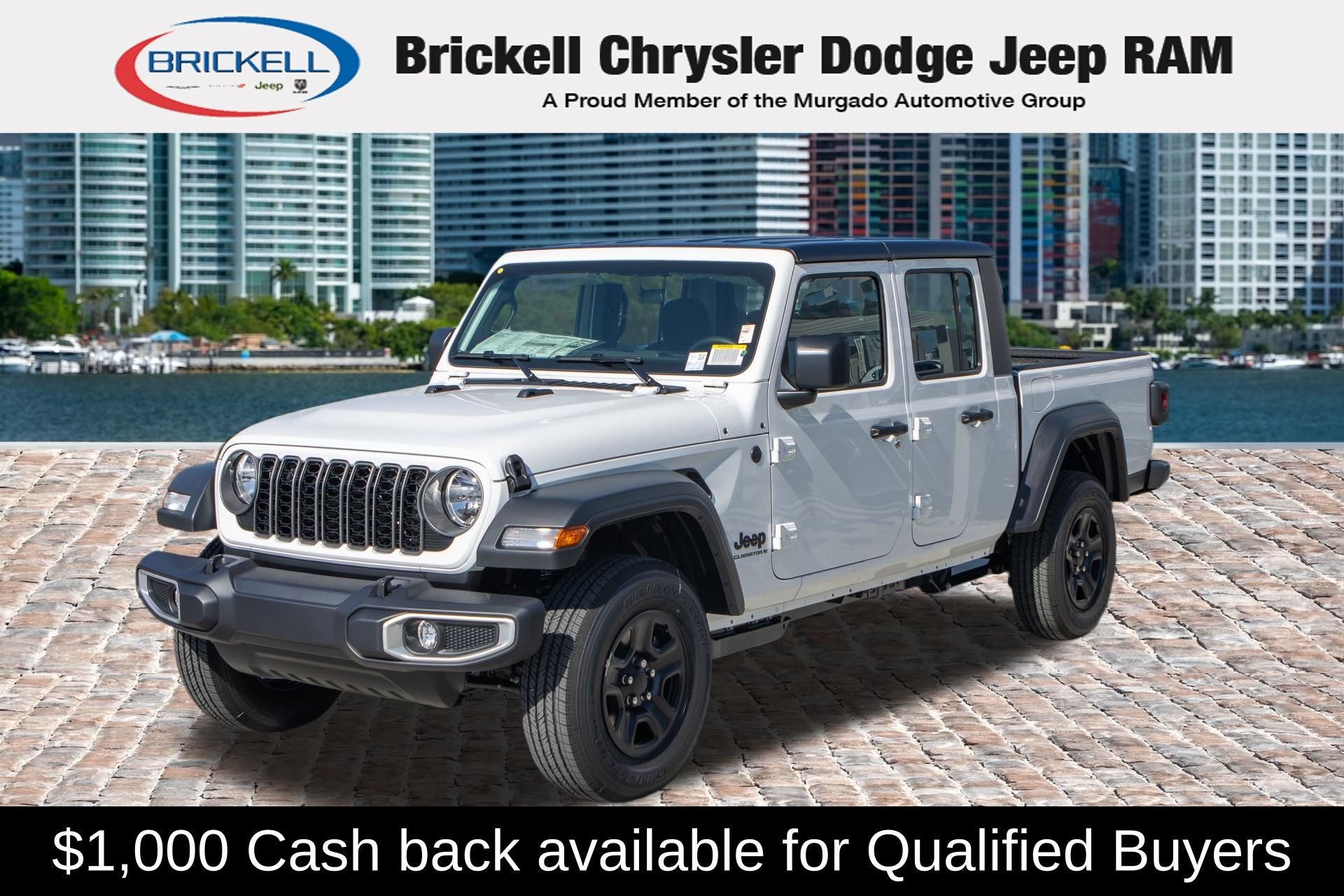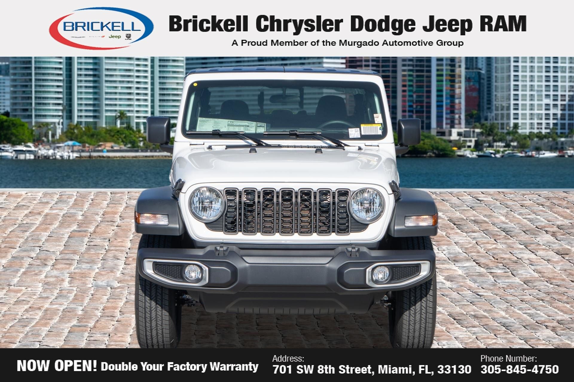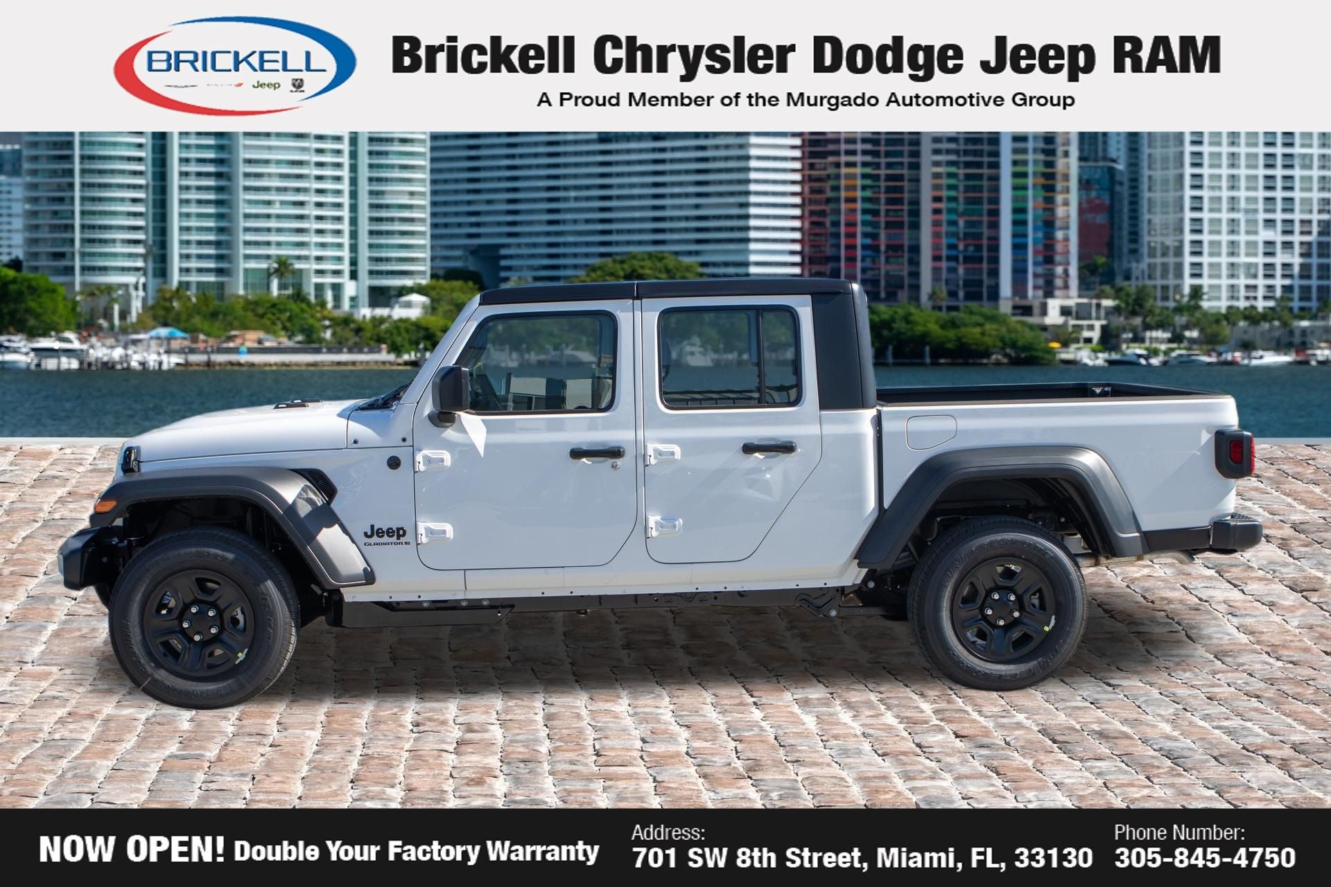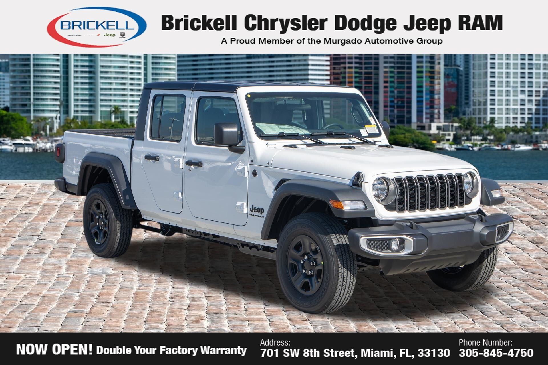 Price includes: $1000 - 2026 National Retail Bonus Cash . Exp. 04/30/2026 Discover Your Next Vehicle at Brickell Chrysler Dodge Jeep Ram Welcome to Brickell CDJR, where we go beyond selling cars. We double the factory powertrain warranty, giving you added peace of mind. Our dealership offers one of the largest new car inventories in the region, ensuring you find the right vehicle Prices displayed do not included our Perma-plate. Our state-of-the-art service department is the largest in the country and is open seven days a week from 7 AM to 9 PM. Visit us at 701 SW 8th St, Miami, FL 33130, or call 305-777-2800 to learn more and schedule a test drive. The displayed price includes an incentive for financing with Brickell CDJR Finance Company. Outside financing and bank drafts are not accepted. All pre-owned vehicle exports are subject to an export fee. Prices apply only to customers who live, work, or worship in Broward, Miami-Dade, Palm Beach, Monroe, Collier, Hendry, Lee, Glades, Martin, St. Lucie, Okeechobee, Manatee, Hillsborough, Osceola, or Orange County. Customers outside these counties will pay an additional $ Taxes, title, registration, and dealer fees apply. Factory MSRP: $43,445 Bright White Clearcoat 2026 Jeep Gladiator Sport 4WD 8-Speed Automatic 3.6L V6 24V VVT