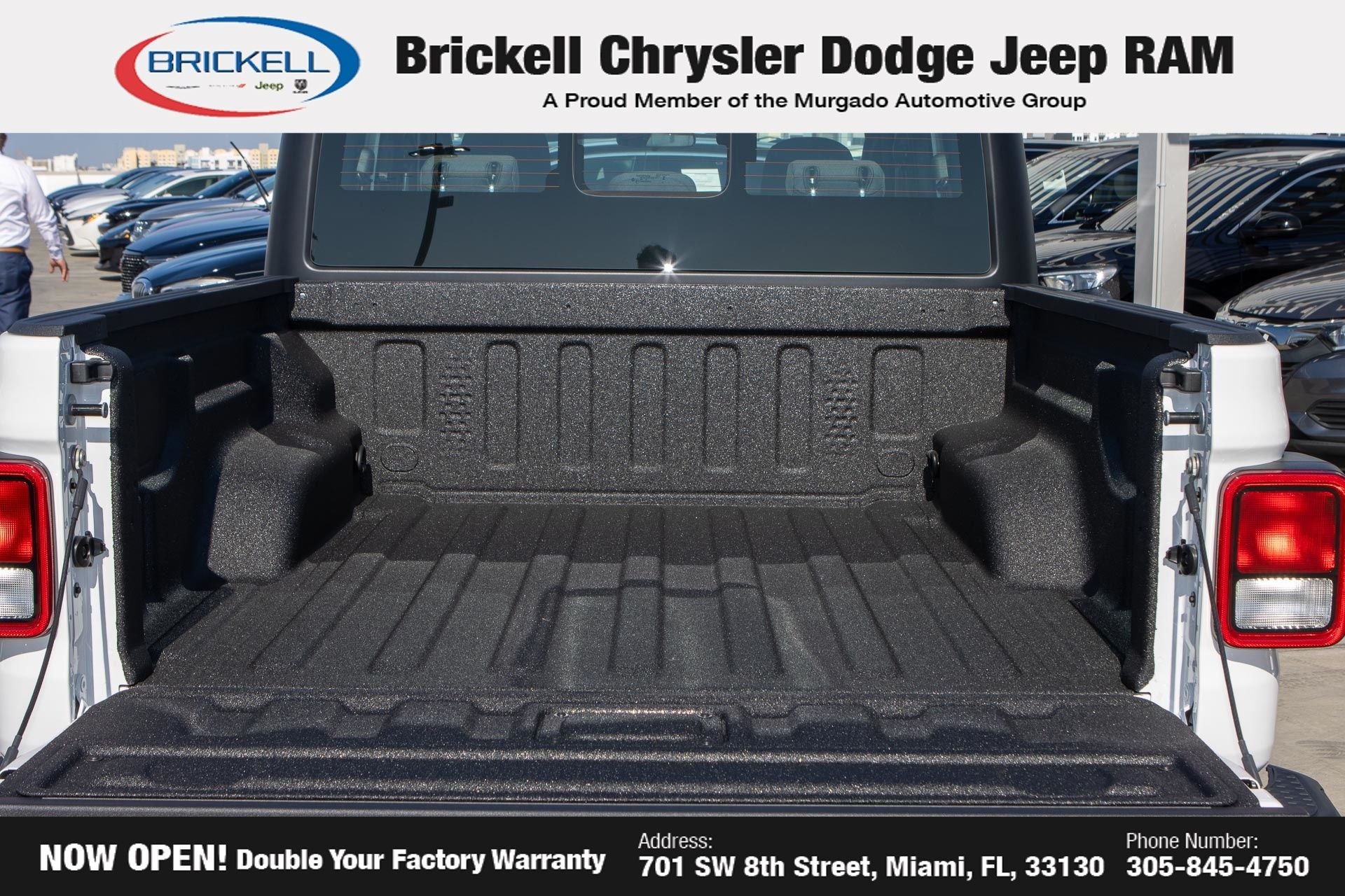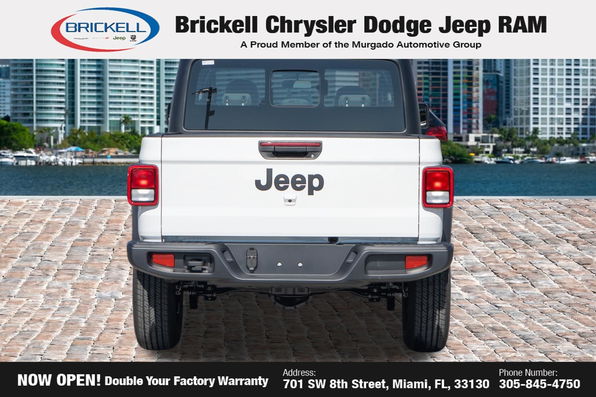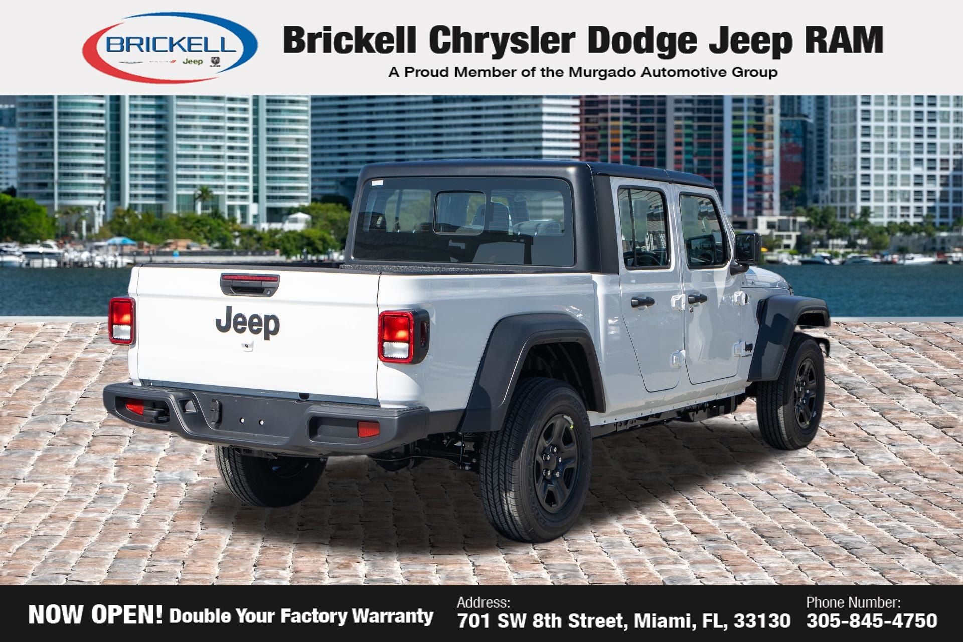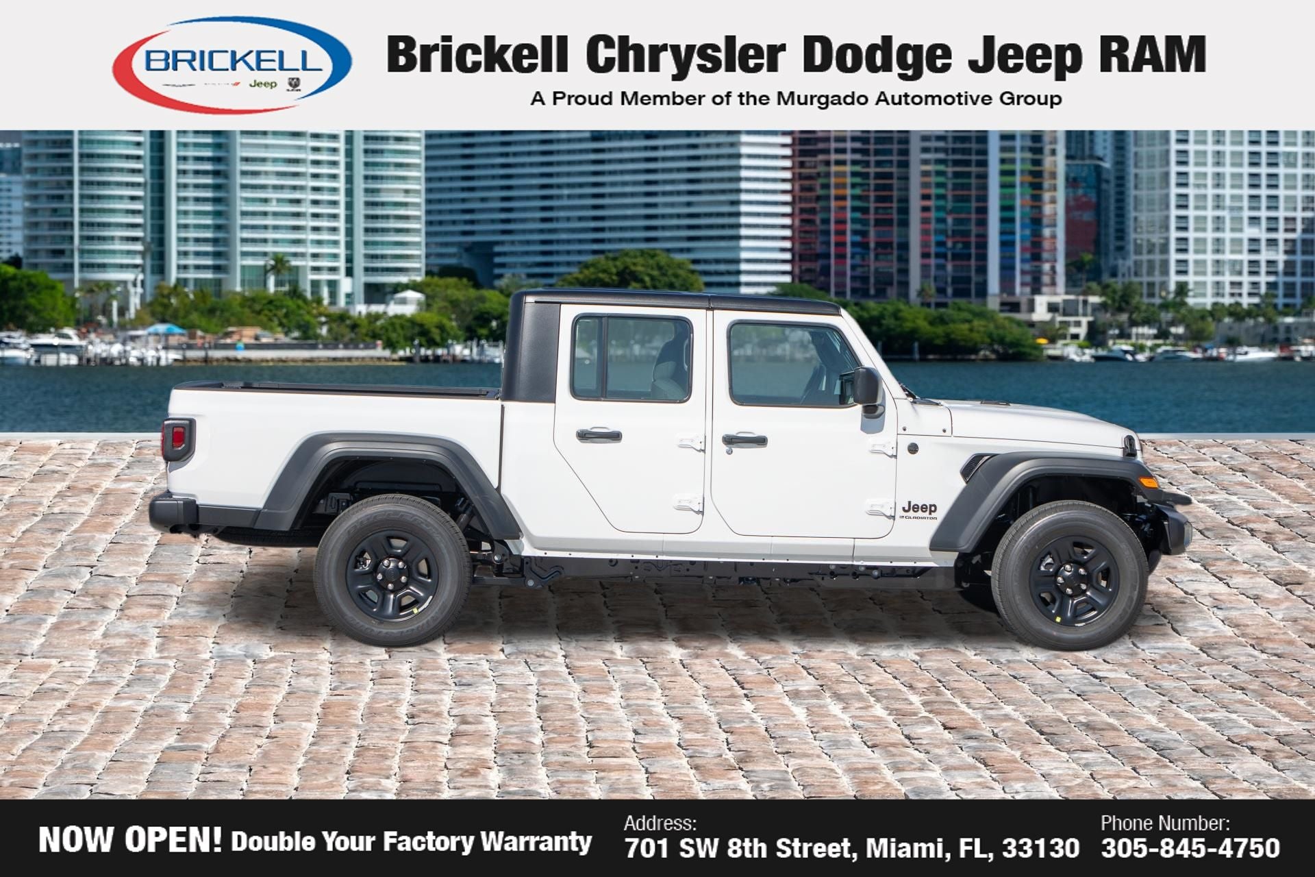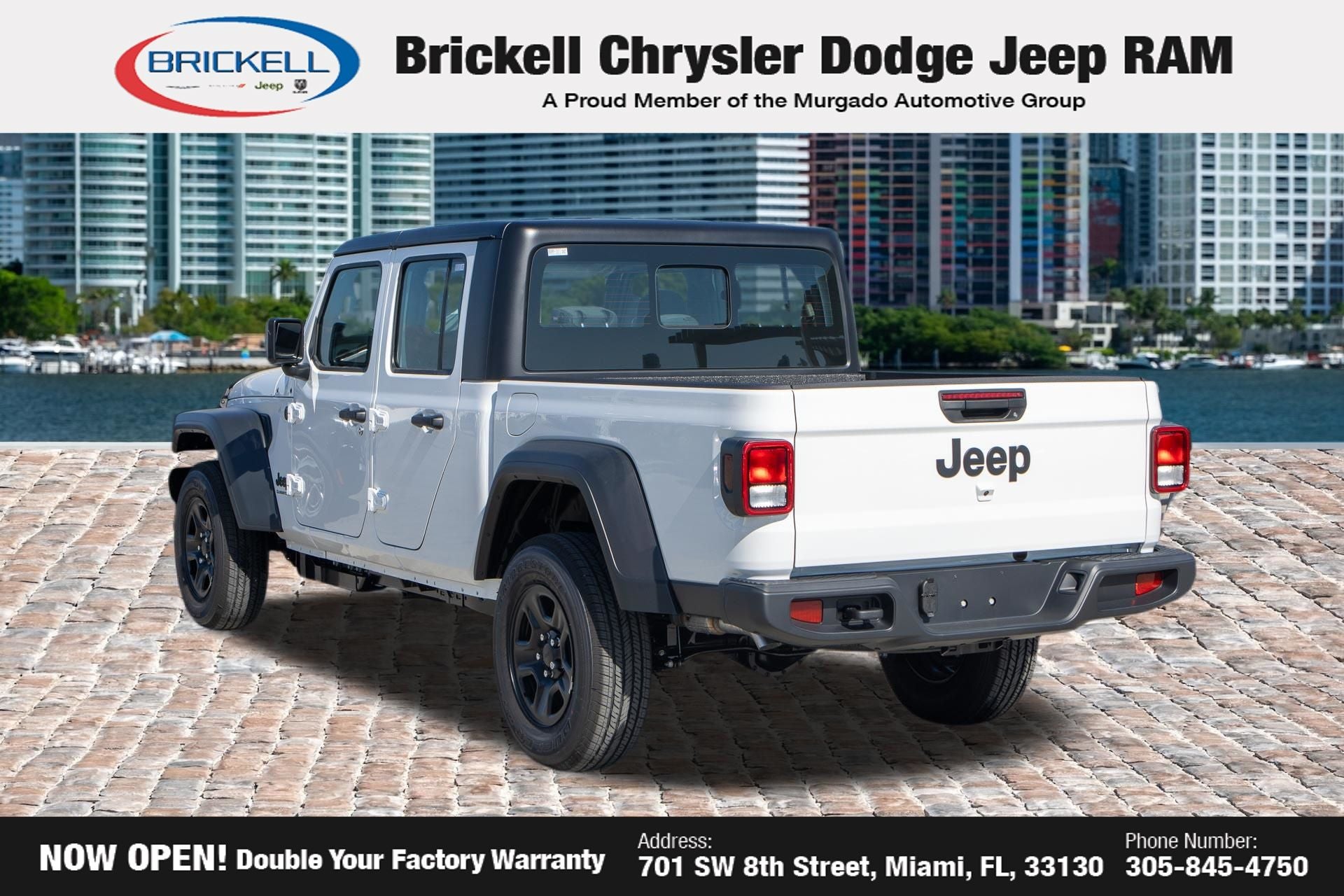Price includes: $1000 - 2026 National Retail Bonus Cash . Exp. 04/30/2026 Discover Your Next Vehicle at Brickell Chrysler Dodge Jeep Ram Welcome to Brickell CDJR, where we go beyond selling cars. We double the factory powertrain warranty, giving you added peace of mind. Our dealership offers one of the largest new car inventories in the region, ensuring you find the right vehicle Prices displayed do not included our Perma-plate. Our state-of-the-art service department is the largest in the country and is open seven days a week from 7 AM to 9 PM. Visit us at 701 SW 8th St, Miami, FL 33130, or call 305-777-2800 to learn more and schedule a test drive. The displayed price includes an incentive for financing with Brickell CDJR Finance Company. Outside financing and bank drafts are not accepted. All pre-owned vehicle exports are subject to an export fee. Prices apply only to customers who live, work, or worship in Broward, Miami-Dade, Palm Beach, Monroe, Collier, Hendry, Lee, Glades, Martin, St. Lucie, Okeechobee, Manatee, Hillsborough, Osceola, or Orange County. Customers outside these counties will pay an additional $ Taxes, title, registration, and dealer fees apply. Factory MSRP: $43,445 Bright White Clearcoat 2026 Jeep Gladiator Sport 4WD 8-Speed Automatic 3.6L V6 24V VVT