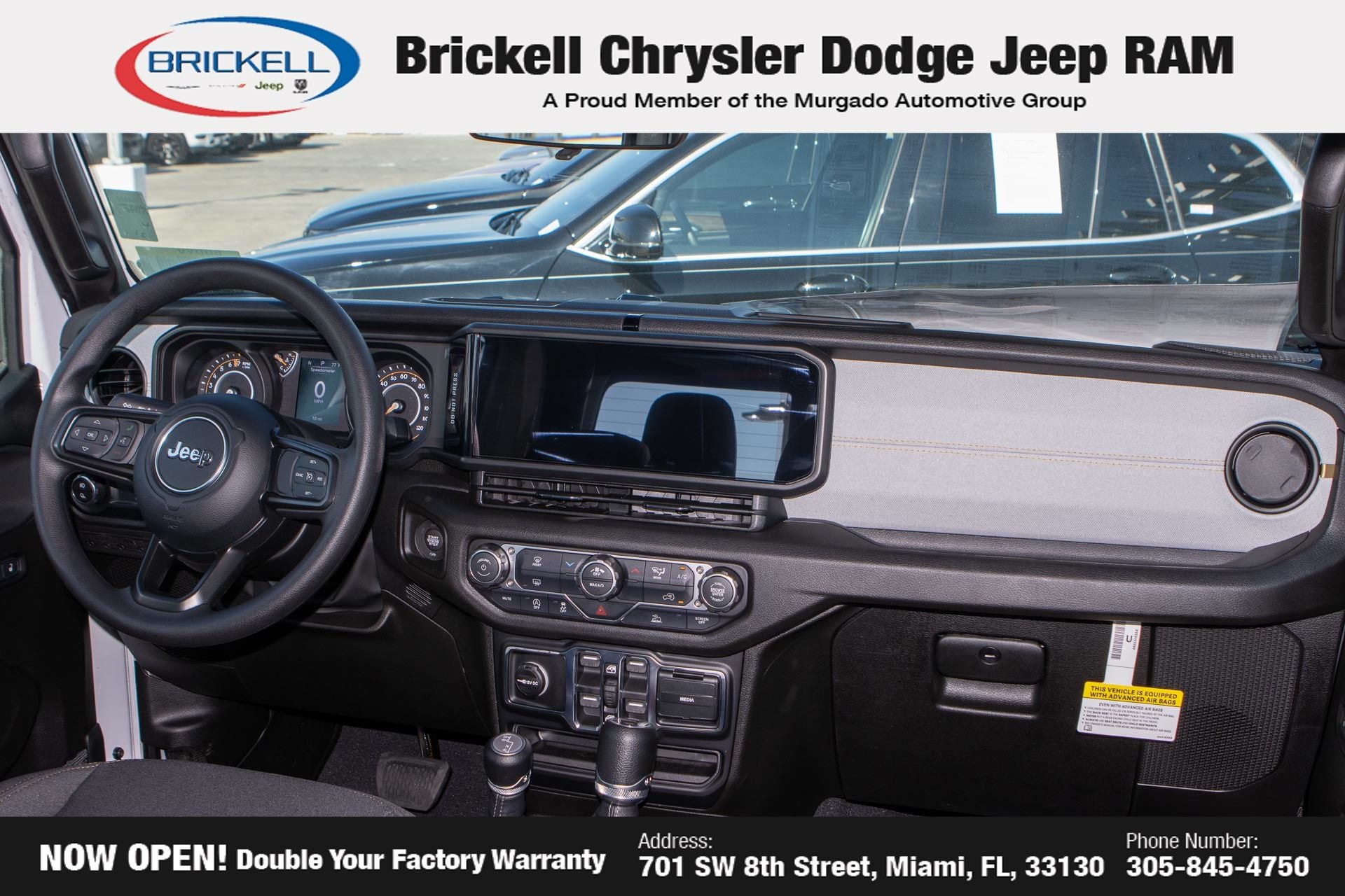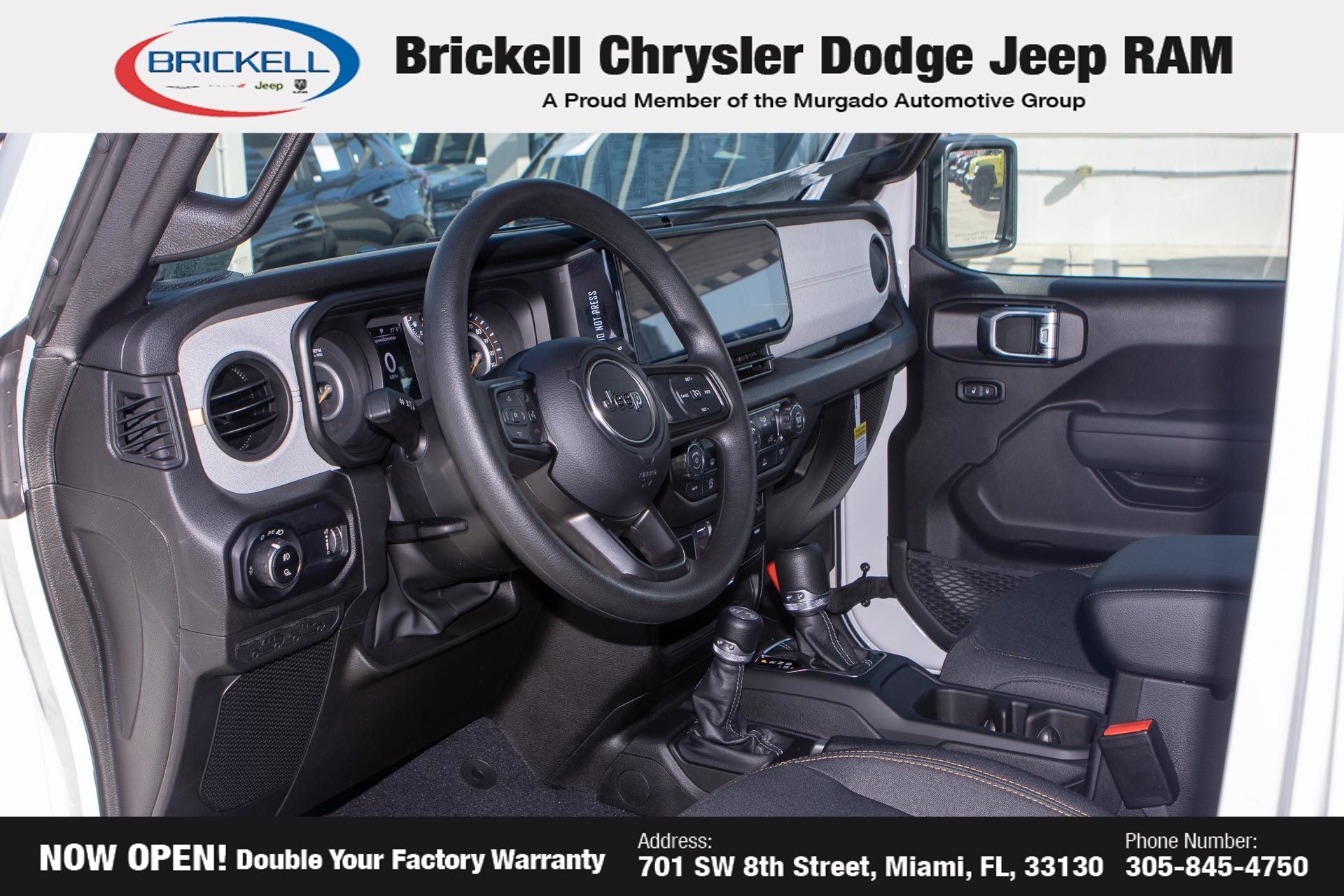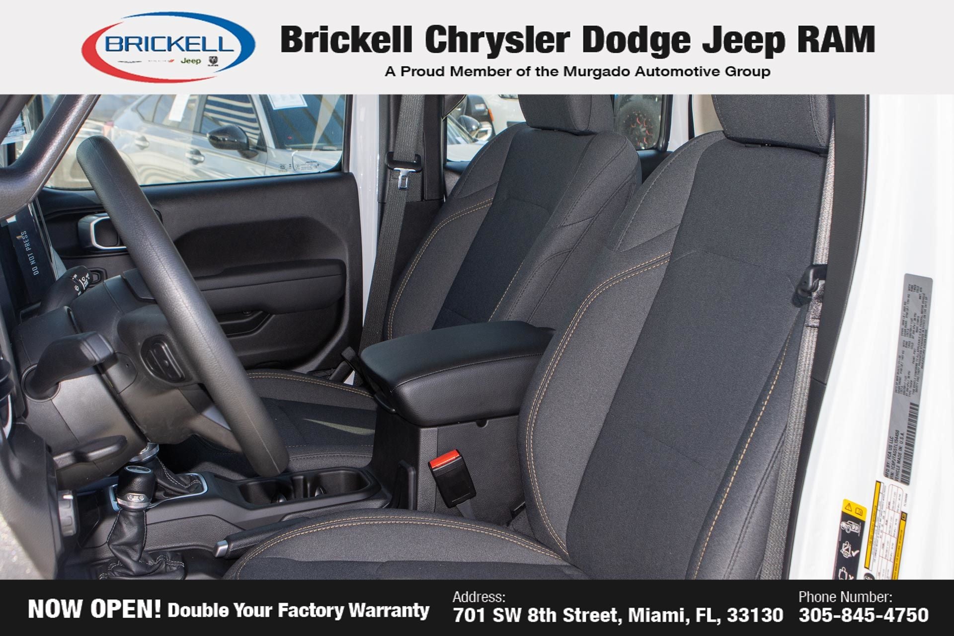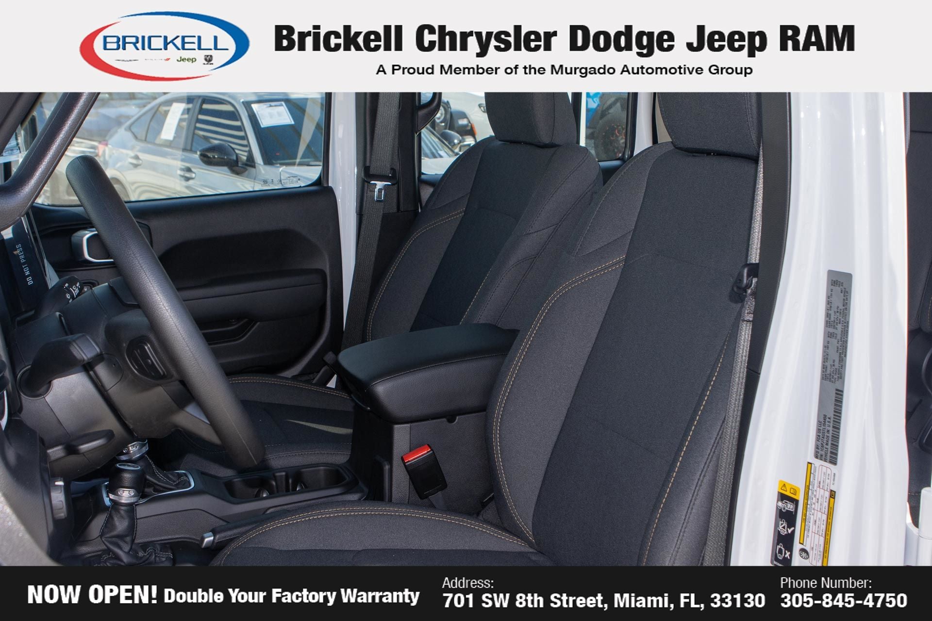 Price includes: $1000 - 2026 National Retail Bonus Cash . Exp. 04/30/2026 Discover Your Next Vehicle at Brickell Chrysler Dodge Jeep Ram Welcome to Brickell CDJR, where we go beyond selling cars. We double the factory powertrain warranty, giving you added peace of mind. Our dealership offers one of the largest new car inventories in the region, ensuring you find the right vehicle Prices displayed do not included our Perma-plate. Our state-of-the-art service department is the largest in the country and is open seven days a week from 7 AM to 9 PM. Visit us at 701 SW 8th St, Miami, FL 33130, or call 305-777-2800 to learn more and schedule a test drive. The displayed price includes an incentive for financing with Brickell CDJR Finance Company. Outside financing and bank drafts are not accepted. All pre-owned vehicle exports are subject to an export fee. Prices apply only to customers who live, work, or worship in Broward, Miami-Dade, Palm Beach, Monroe, Collier, Hendry, Lee, Glades, Martin, St. Lucie, Okeechobee, Manatee, Hillsborough, Osceola, or Orange County. Customers outside these counties will pay an additional $ Taxes, title, registration, and dealer fees apply. Factory MSRP: $43,445 Bright White Clearcoat 2026 Jeep Gladiator Sport 4WD 8-Speed Automatic 3.6L V6 24V VVT