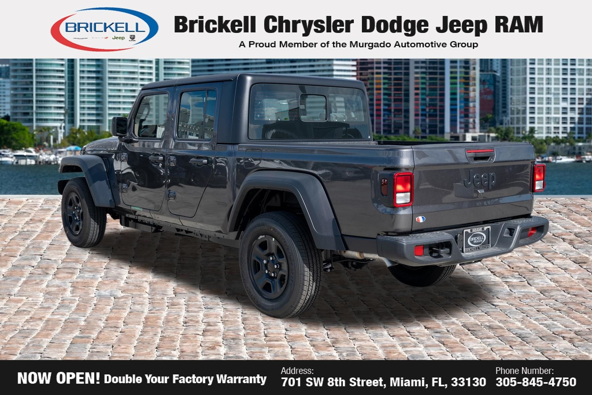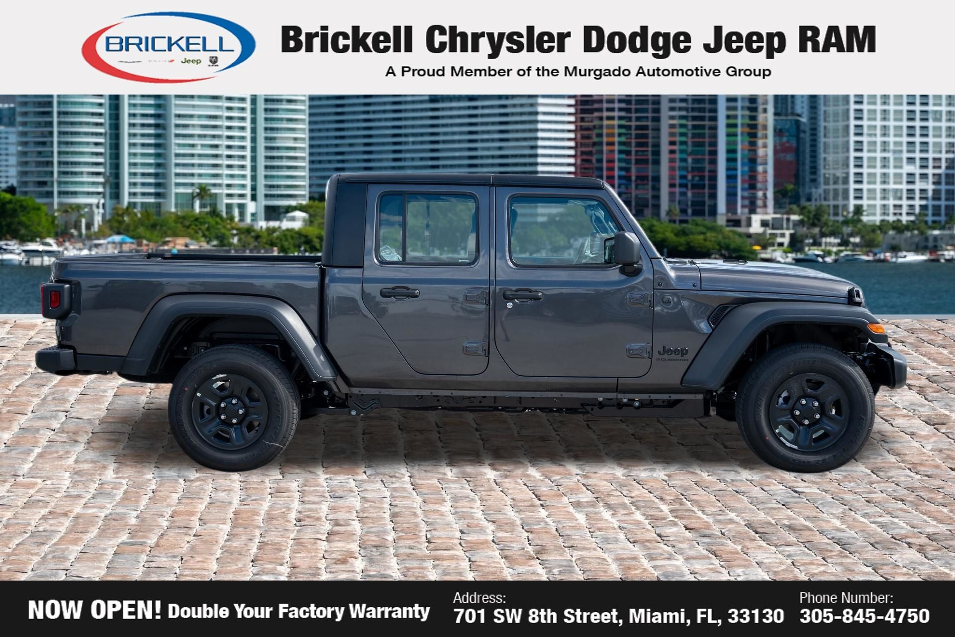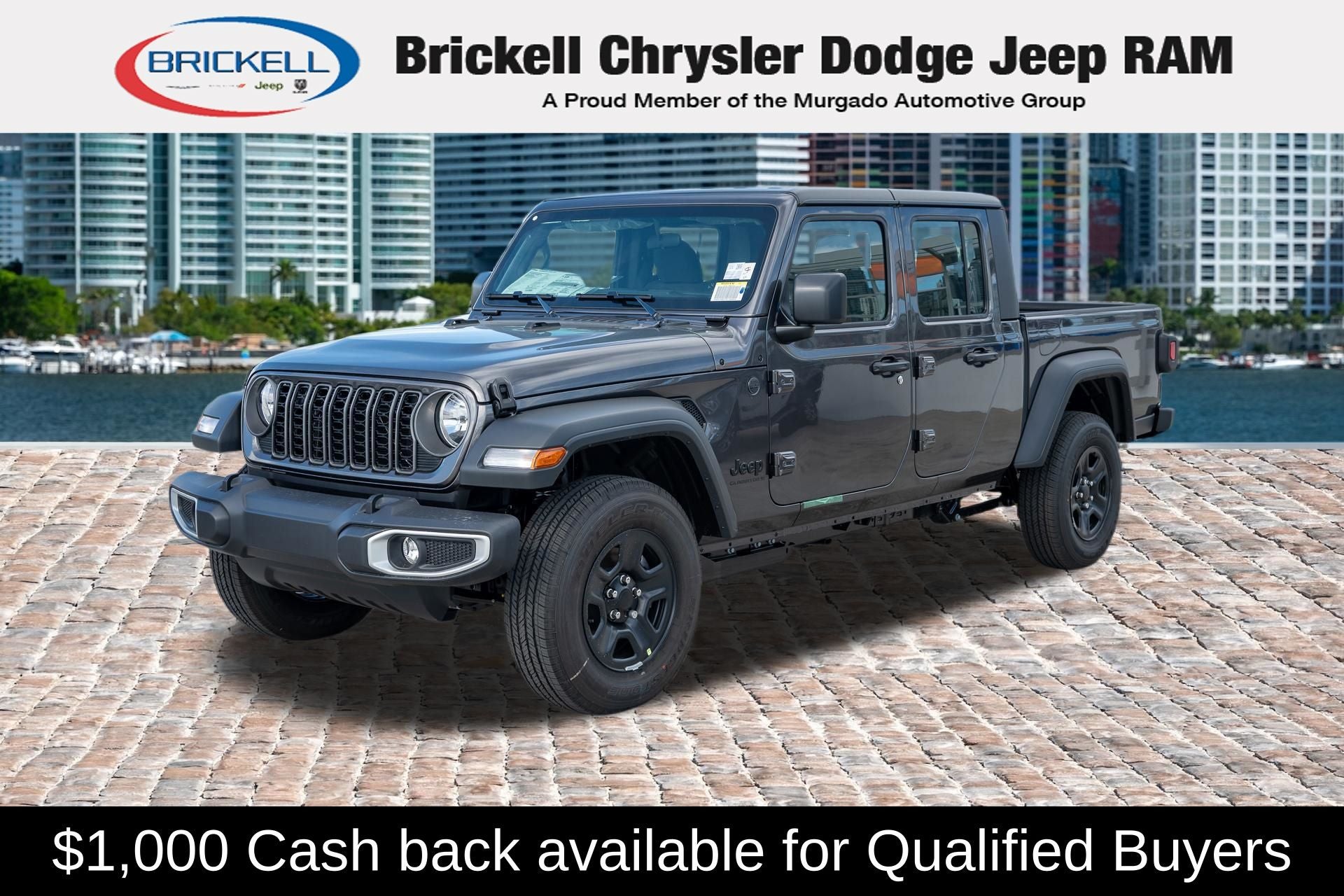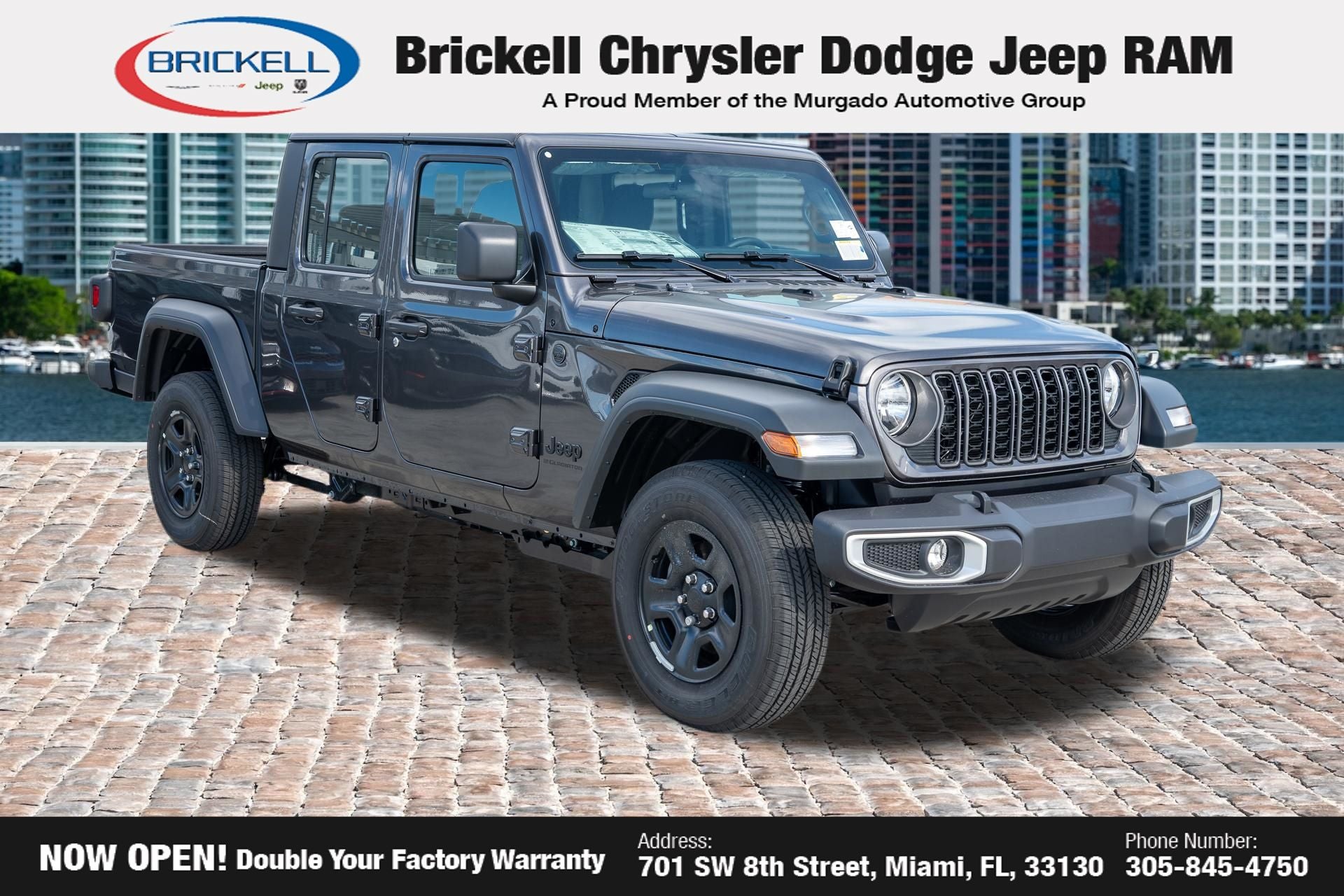 Price includes: $1000 - 2026 National Retail Bonus Cash . Exp. 04/30/2026 Discover Your Next Vehicle at Brickell Chrysler Dodge Jeep Ram Welcome to Brickell CDJR, where we go beyond selling cars. We double the factory powertrain warranty, giving you added peace of mind. Our dealership offers one of the largest new car inventories in the region, ensuring you find the right vehicle Prices displayed do not included our Perma-plate. Our state-of-the-art service department is the largest in the country and is open seven days a week from 7 AM to 9 PM. Visit us at 701 SW 8th St, Miami, FL 33130, or call 305-777-2800 to learn more and schedule a test drive. The displayed price includes an incentive for financing with Brickell CDJR Finance Company. Outside financing and bank drafts are not accepted. All pre-owned vehicle exports are subject to an export fee. Prices apply only to customers who live, work, or worship in Broward, Miami-Dade, Palm Beach, Monroe, Collier, Hendry, Lee, Glades, Martin, St. Lucie, Okeechobee, Manatee, Hillsborough, Osceola, or Orange County. Customers outside these counties will pay an additional $ Taxes, title, registration, and dealer fees apply. Factory MSRP: $44,040 Granite Crystal Metallic Clearcoat 2026 Jeep Gladiator Sport 4WD 8-Speed Automatic 3.6L V6 24V VVT