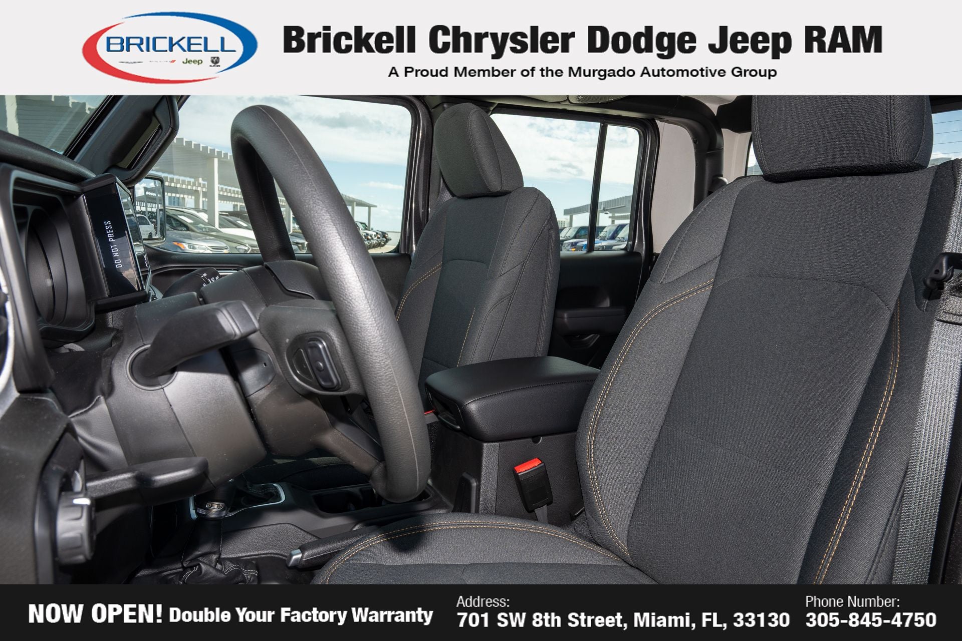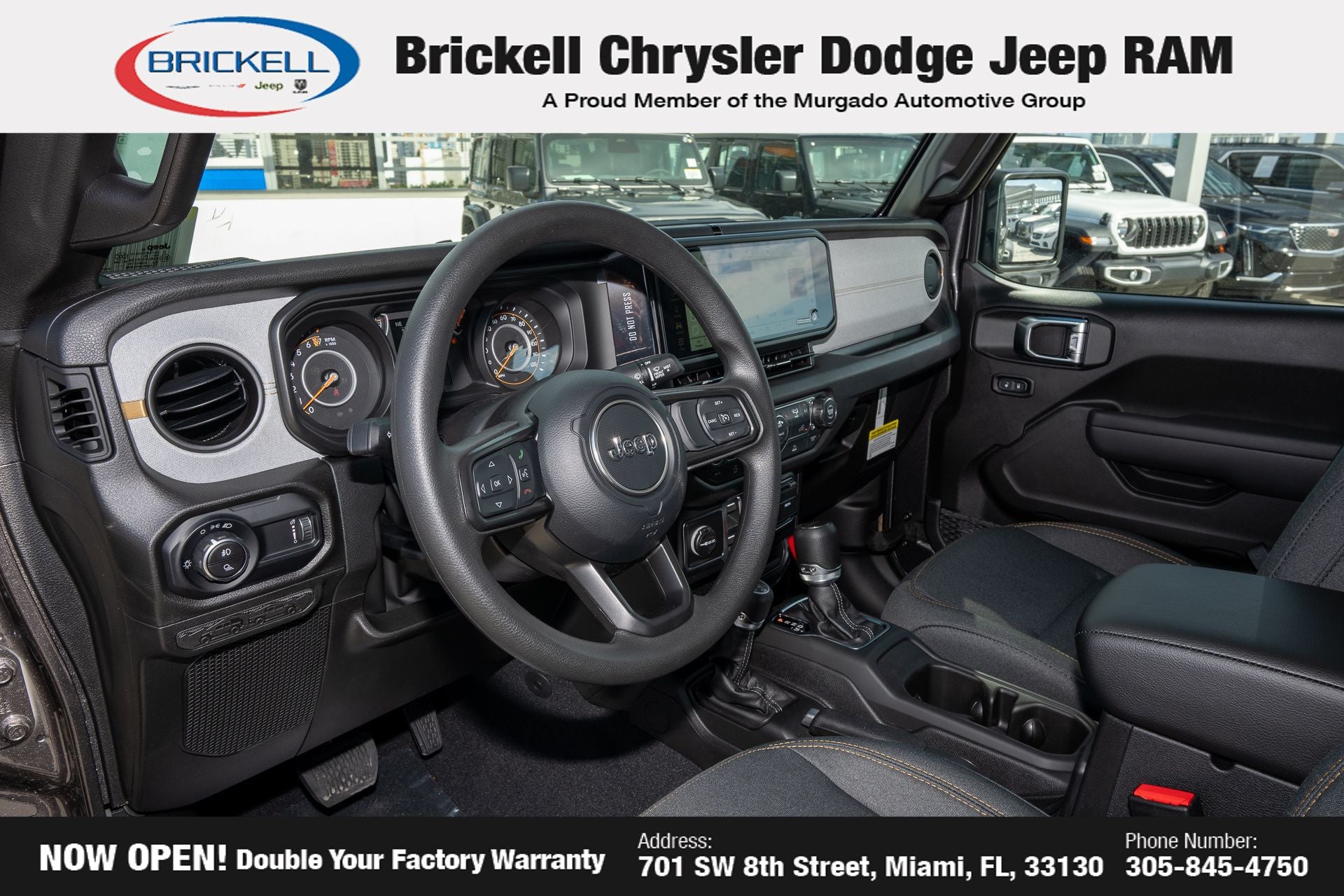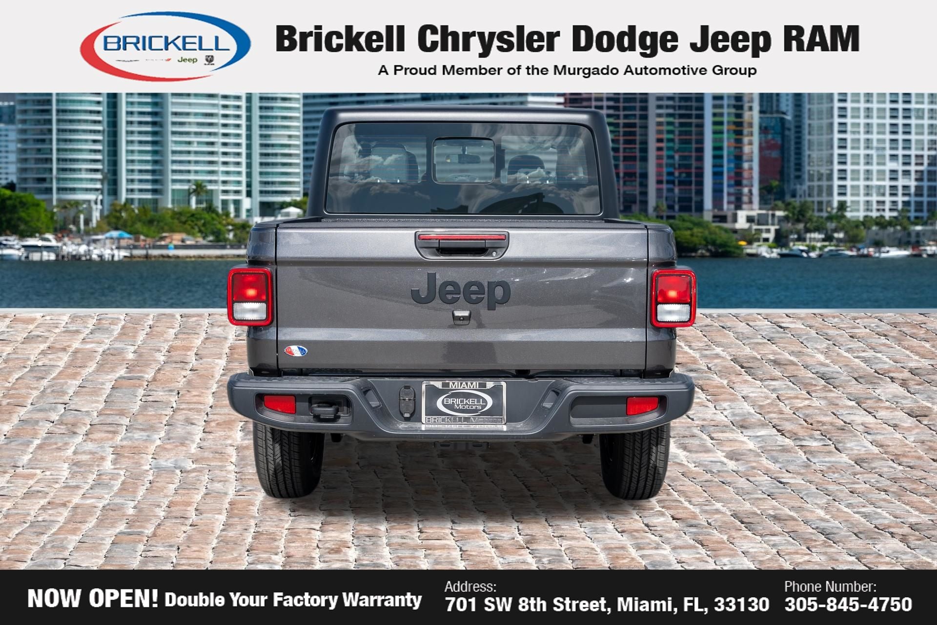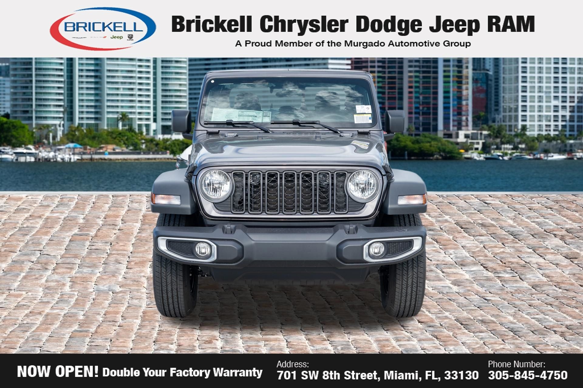 Price includes: $1000 - 2026 National Retail Bonus Cash . Exp. 04/30/2026 Discover Your Next Vehicle at Brickell Chrysler Dodge Jeep Ram Welcome to Brickell CDJR, where we go beyond selling cars. We double the factory powertrain warranty, giving you added peace of mind. Our dealership offers one of the largest new car inventories in the region, ensuring you find the right vehicle Prices displayed do not included our Perma-plate. Our state-of-the-art service department is the largest in the country and is open seven days a week from 7 AM to 9 PM. Visit us at 701 SW 8th St, Miami, FL 33130, or call 305-777-2800 to learn more and schedule a test drive. The displayed price includes an incentive for financing with Brickell CDJR Finance Company. Outside financing and bank drafts are not accepted. All pre-owned vehicle exports are subject to an export fee. Prices apply only to customers who live, work, or worship in Broward, Miami-Dade, Palm Beach, Monroe, Collier, Hendry, Lee, Glades, Martin, St. Lucie, Okeechobee, Manatee, Hillsborough, Osceola, or Orange County. Customers outside these counties will pay an additional $ Taxes, title, registration, and dealer fees apply. Factory MSRP: $44,040 Granite Crystal Metallic Clearcoat 2026 Jeep Gladiator Sport 4WD 8-Speed Automatic 3.6L V6 24V VVT