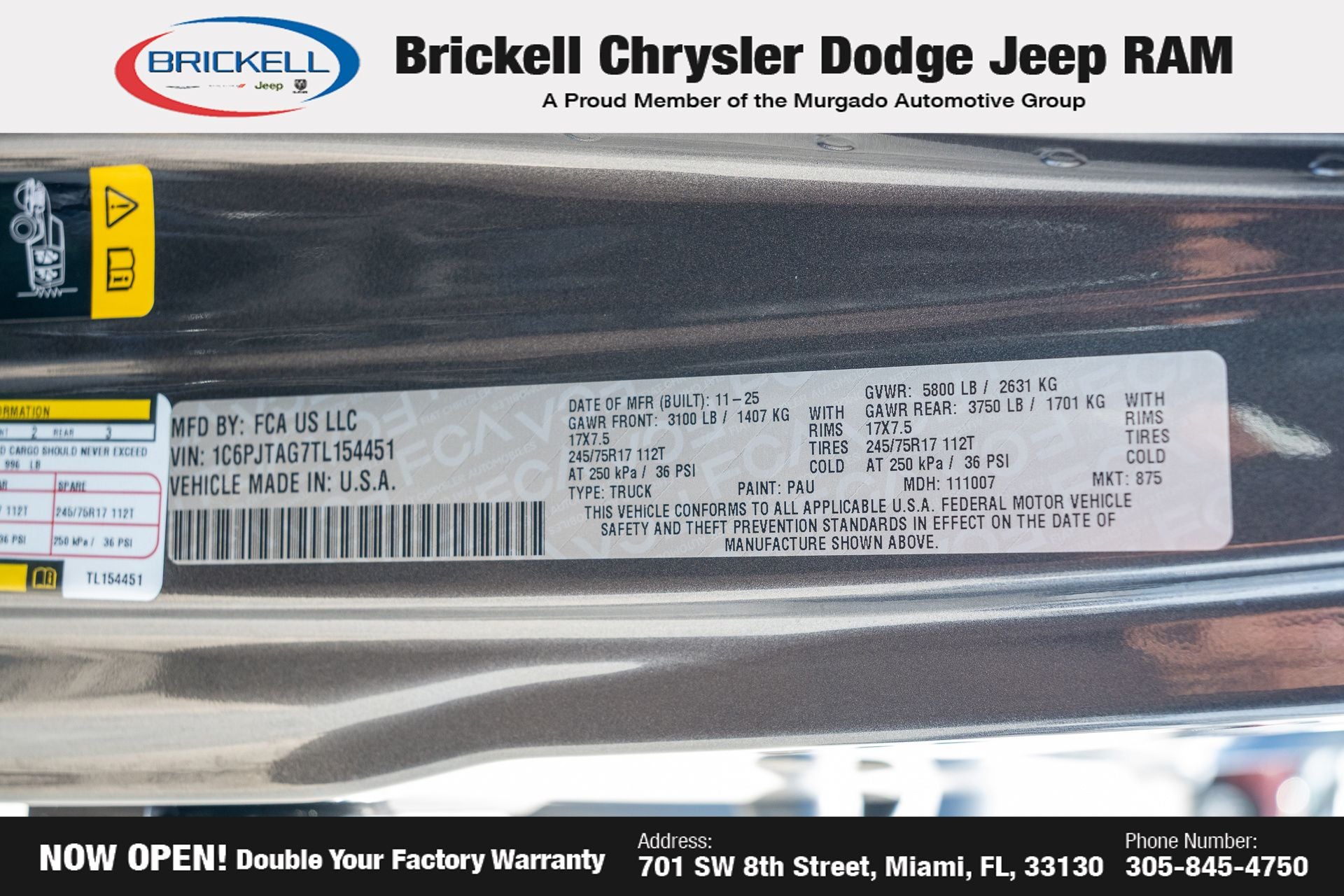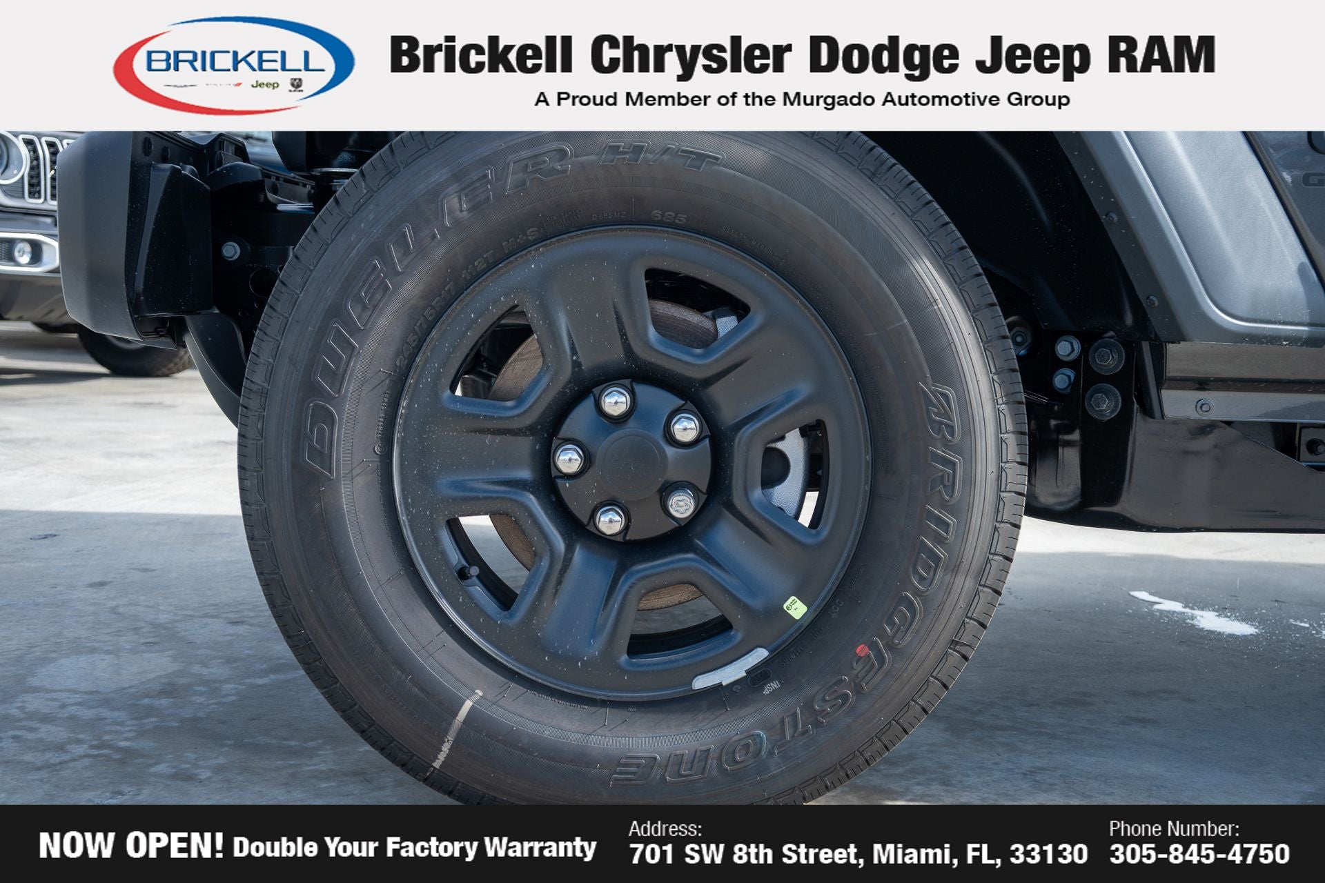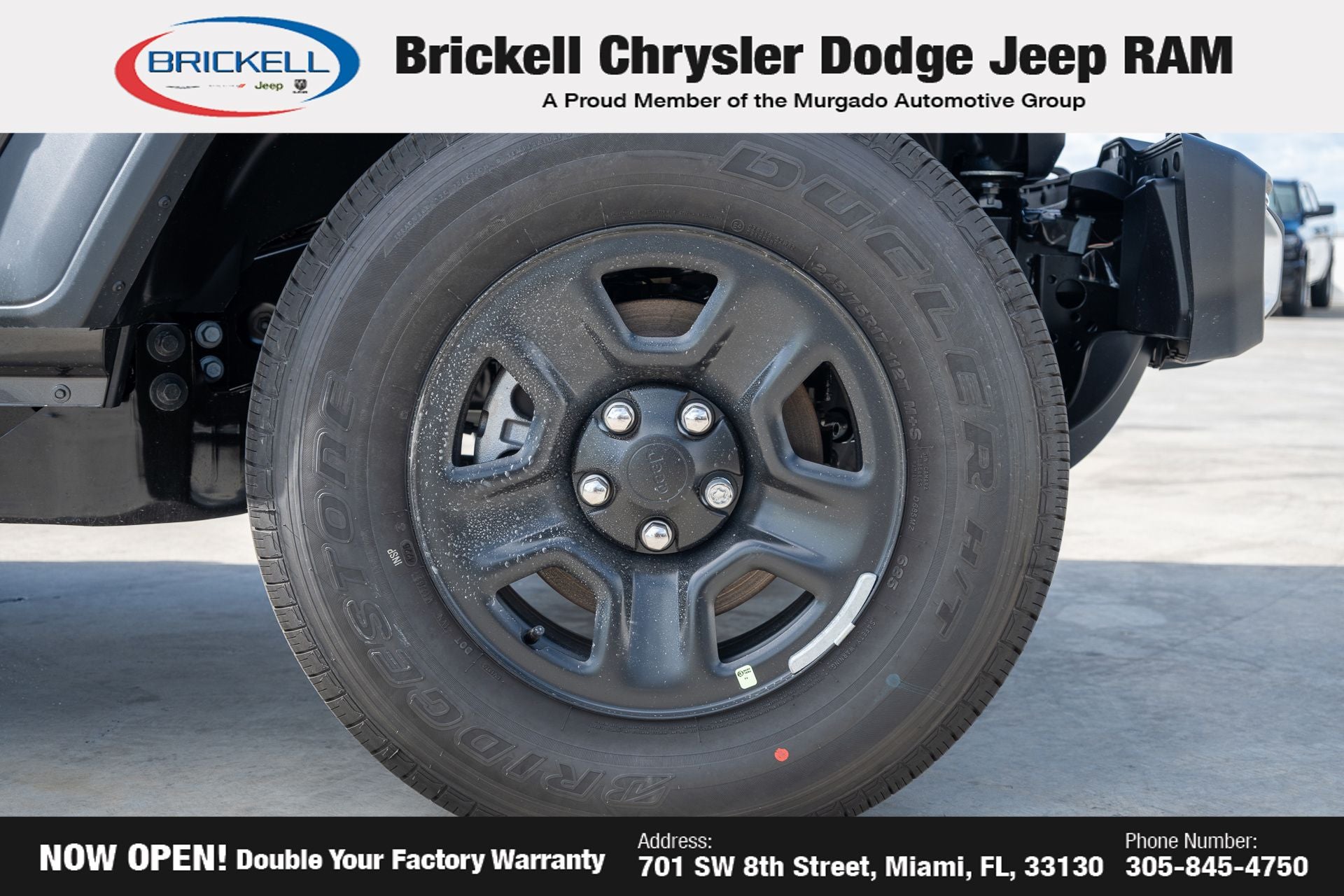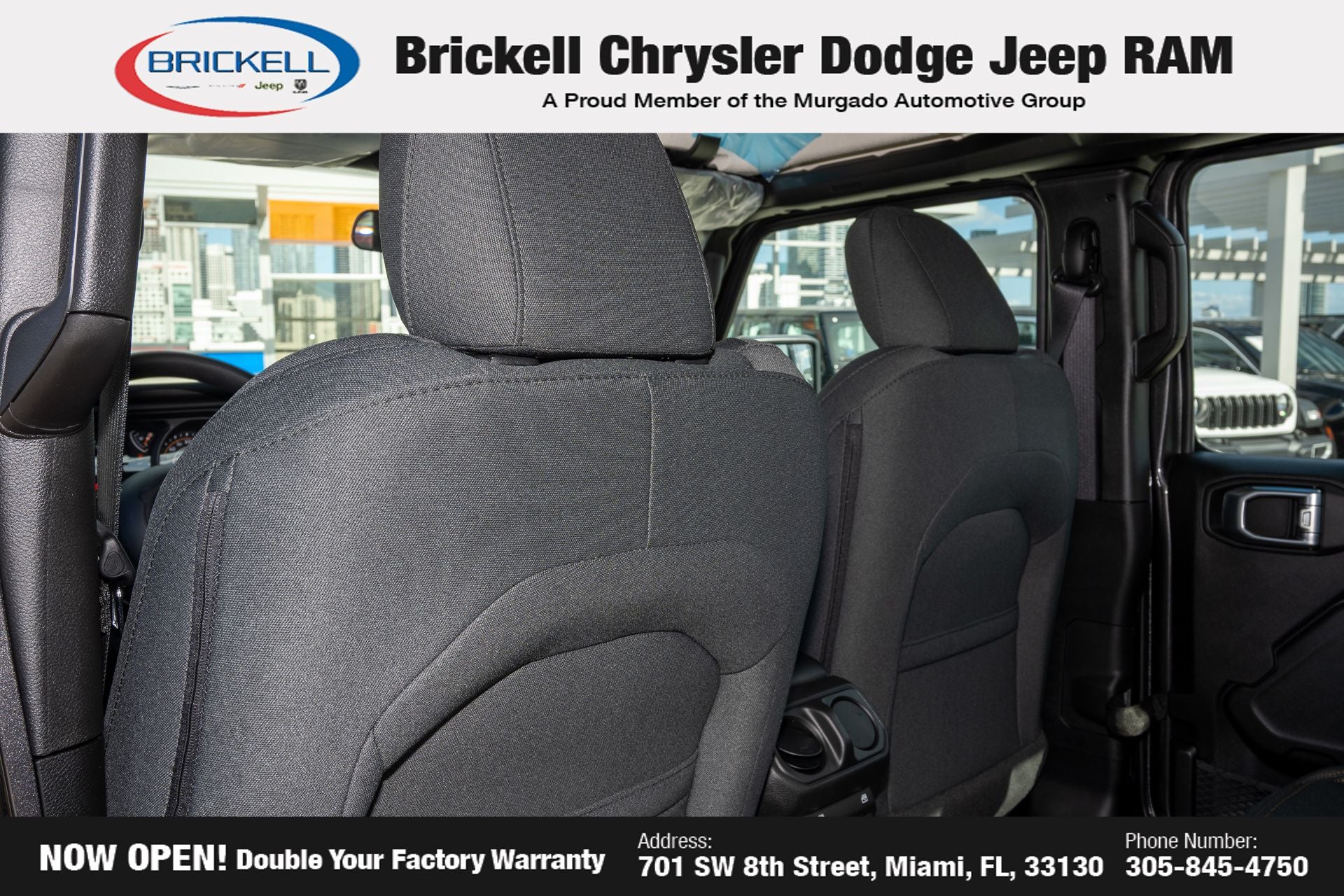 Price includes: $1000 - 2026 National Retail Bonus Cash . Exp. 04/30/2026 Discover Your Next Vehicle at Brickell Chrysler Dodge Jeep Ram Welcome to Brickell CDJR, where we go beyond selling cars. We double the factory powertrain warranty, giving you added peace of mind. Our dealership offers one of the largest new car inventories in the region, ensuring you find the right vehicle Prices displayed do not included our Perma-plate. Our state-of-the-art service department is the largest in the country and is open seven days a week from 7 AM to 9 PM. Visit us at 701 SW 8th St, Miami, FL 33130, or call 305-777-2800 to learn more and schedule a test drive. The displayed price includes an incentive for financing with Brickell CDJR Finance Company. Outside financing and bank drafts are not accepted. All pre-owned vehicle exports are subject to an export fee. Prices apply only to customers who live, work, or worship in Broward, Miami-Dade, Palm Beach, Monroe, Collier, Hendry, Lee, Glades, Martin, St. Lucie, Okeechobee, Manatee, Hillsborough, Osceola, or Orange County. Customers outside these counties will pay an additional $ Taxes, title, registration, and dealer fees apply. Factory MSRP: $44,040 Granite Crystal Metallic Clearcoat 2026 Jeep Gladiator Sport 4WD 8-Speed Automatic 3.6L V6 24V VVT