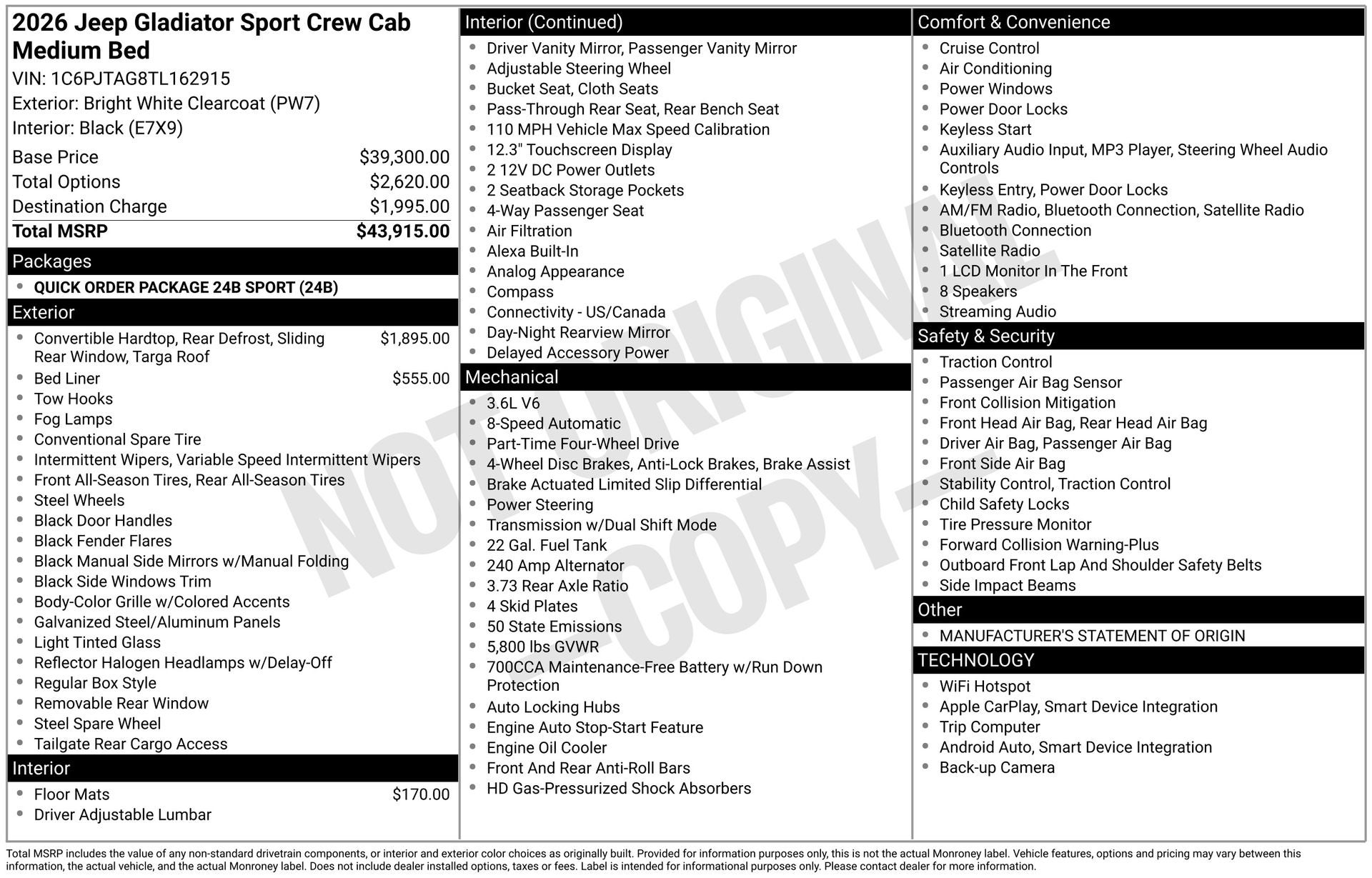 Price includes: $1000 - 2026 National Retail Bonus Cash . Exp. 04/30/2026 Discover Your Next Vehicle at Brickell Chrysler Dodge Jeep Ram Welcome to Brickell CDJR, where we go beyond selling cars. We double the factory powertrain warranty, giving you added peace of mind. Our dealership offers one of the largest new car inventories in the region, ensuring you find the right vehicle Prices displayed do not included our Perma-plate. Our state-of-the-art service department is the largest in the country and is open seven days a week from 7 AM to 9 PM. Visit us at 701 SW 8th St, Miami, FL 33130, or call 305-777-2800 to learn more and schedule a test drive. The displayed price includes an incentive for financing with Brickell CDJR Finance Company. Outside financing and bank drafts are not accepted. All pre-owned vehicle exports are subject to an export fee. Prices apply only to customers who live, work, or worship in Broward, Miami-Dade, Palm Beach, Monroe, Collier, Hendry, Lee, Glades, Martin, St. Lucie, Okeechobee, Manatee, Hillsborough, Osceola, or Orange County. Customers outside these counties will pay an additional $ Taxes, title, registration, and dealer fees apply. Factory MSRP: $43,445 Bright White Clearcoat 2026 Jeep Gladiator Sport 4WD 8-Speed Automatic 3.6L V6 24V VVT