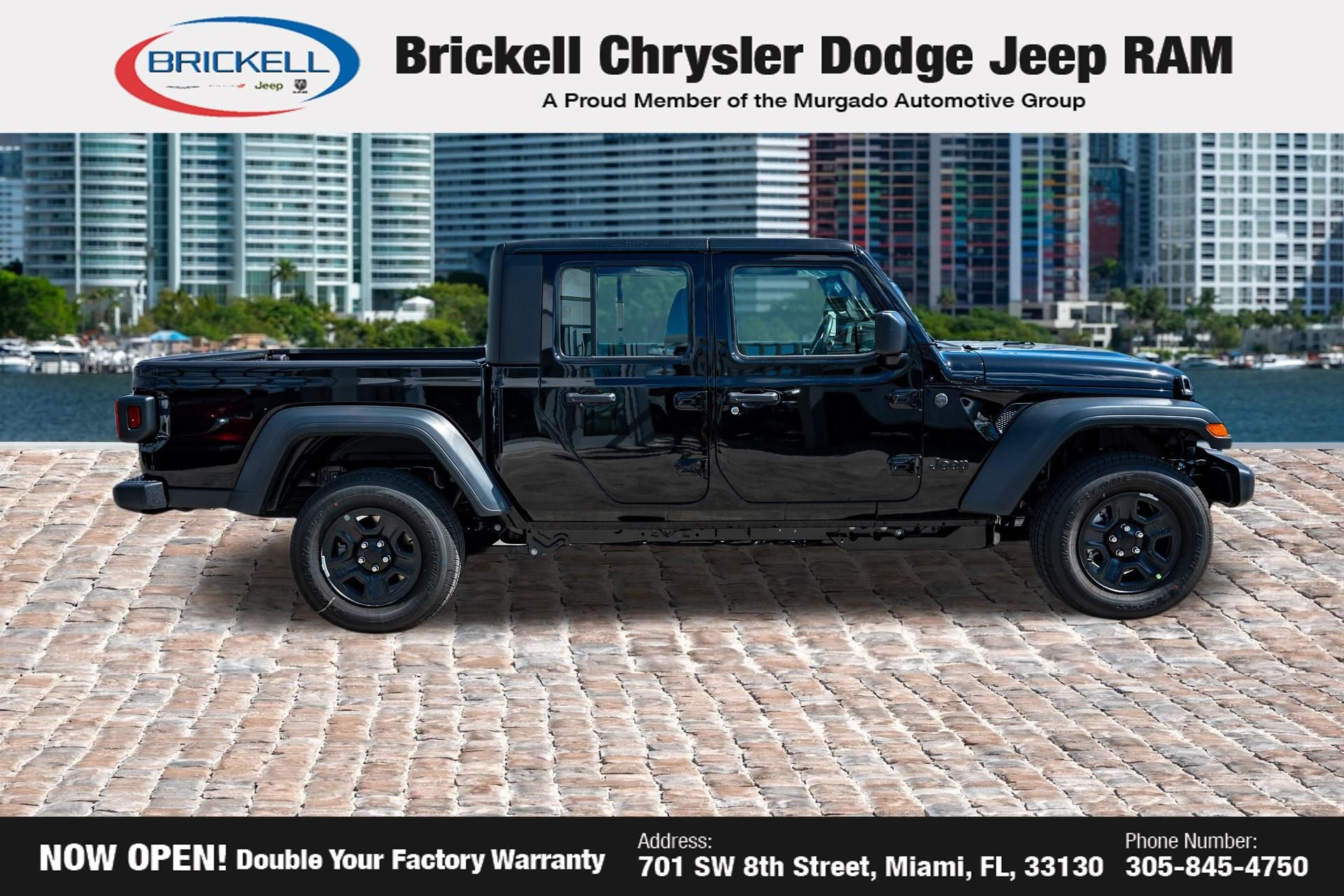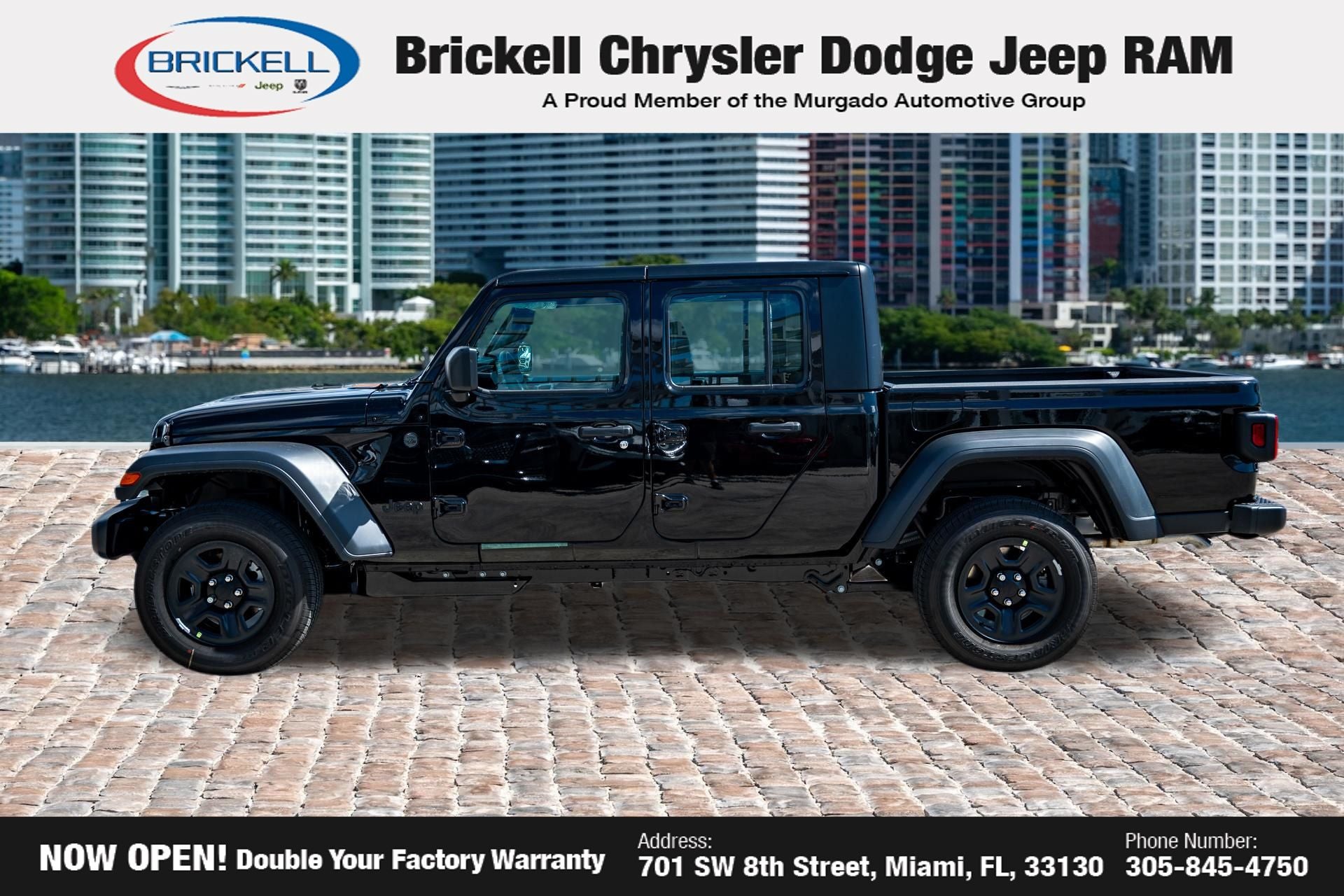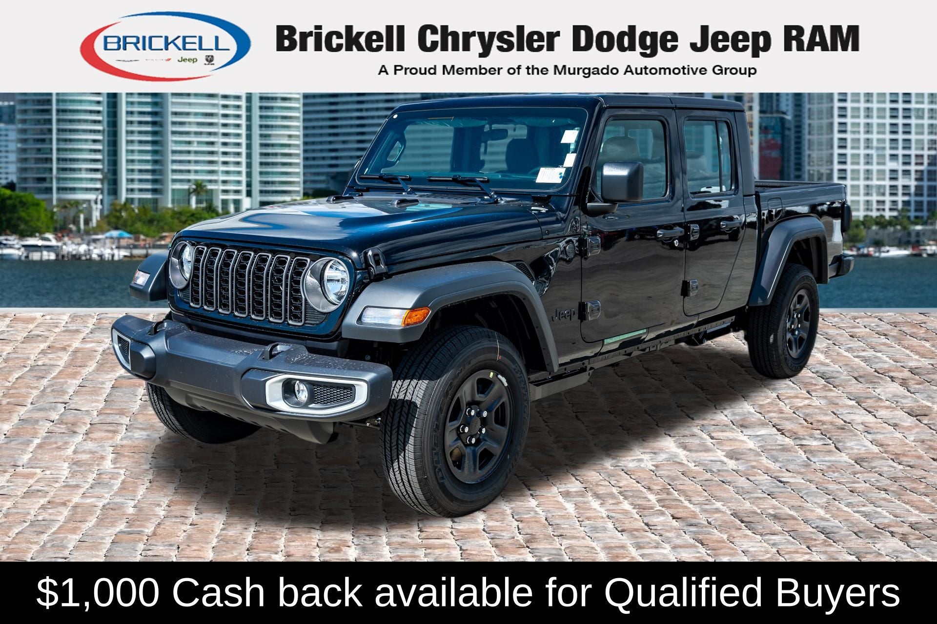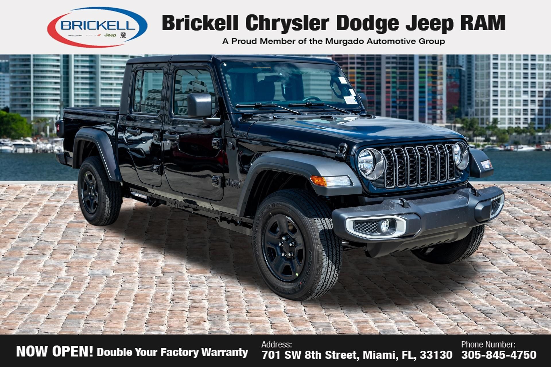Price includes: $1000 - 2026 National Retail Bonus Cash . Exp. 04/30/2026 $1000 - 2026 National Stellantis Loyalty Bonus Cash . Exp. 04/30/2026 $500 - 2026 National 2026 Military Bonus Cash . Exp. 01/04/2027 Discover Your Next Vehicle at Brickell Chrysler Dodge Jeep Ram Welcome to Brickell CDJR, where we go beyond selling cars. We double the factory powertrain warranty, giving you added peace of mind. Our dealership offers one of the largest new car inventories in the region, ensuring you find the right vehicle Prices displayed do not included our Perma-plate. Our state-of-the-art service department is the largest in the country and is open seven days a week from 7 AM to 9 PM. Visit us at 701 SW 8th St, Miami, FL 33130, or call 305-777-2800 to learn more and schedule a test drive. The displayed price includes an incentive for financing with Brickell CDJR Finance Company. Outside financing and bank drafts are not accepted. All pre-owned vehicle exports are subject to an export fee. Prices apply only to customers who live, work, or worship in Broward, Miami-Dade, Palm Beach, Monroe, Collier, Hendry, Lee, Glades, Martin, St. Lucie, Okeechobee, Manatee, Hillsborough, Osceola, or Orange County. Customers outside these counties will pay an additional $ Taxes, title, registration, and dealer fees apply. Factory MSRP: $44,040 Black Clearcoat 2026 Jeep Gladiator Sport 4WD 8-Speed Automatic 3.6L V6 24V VVT