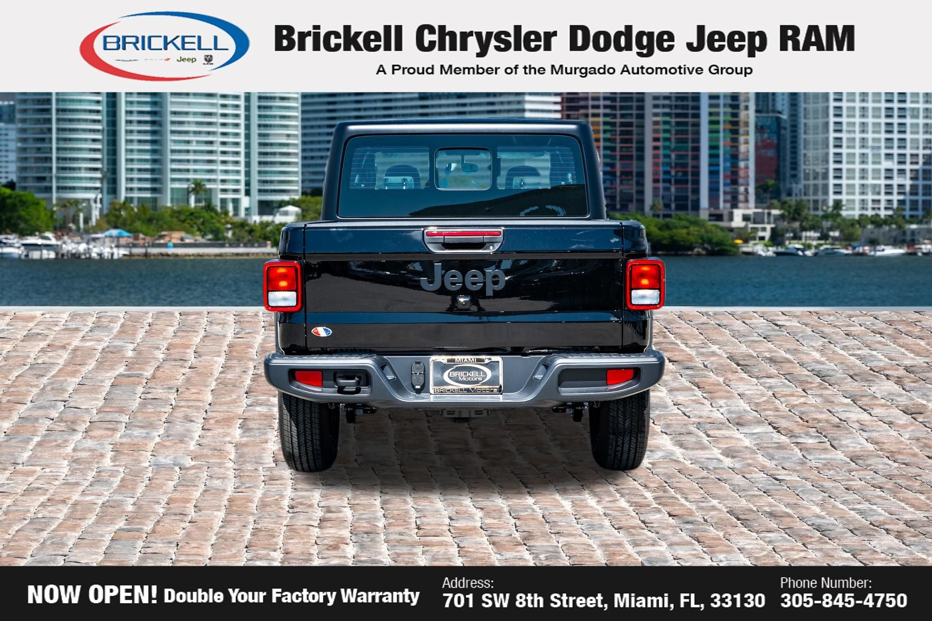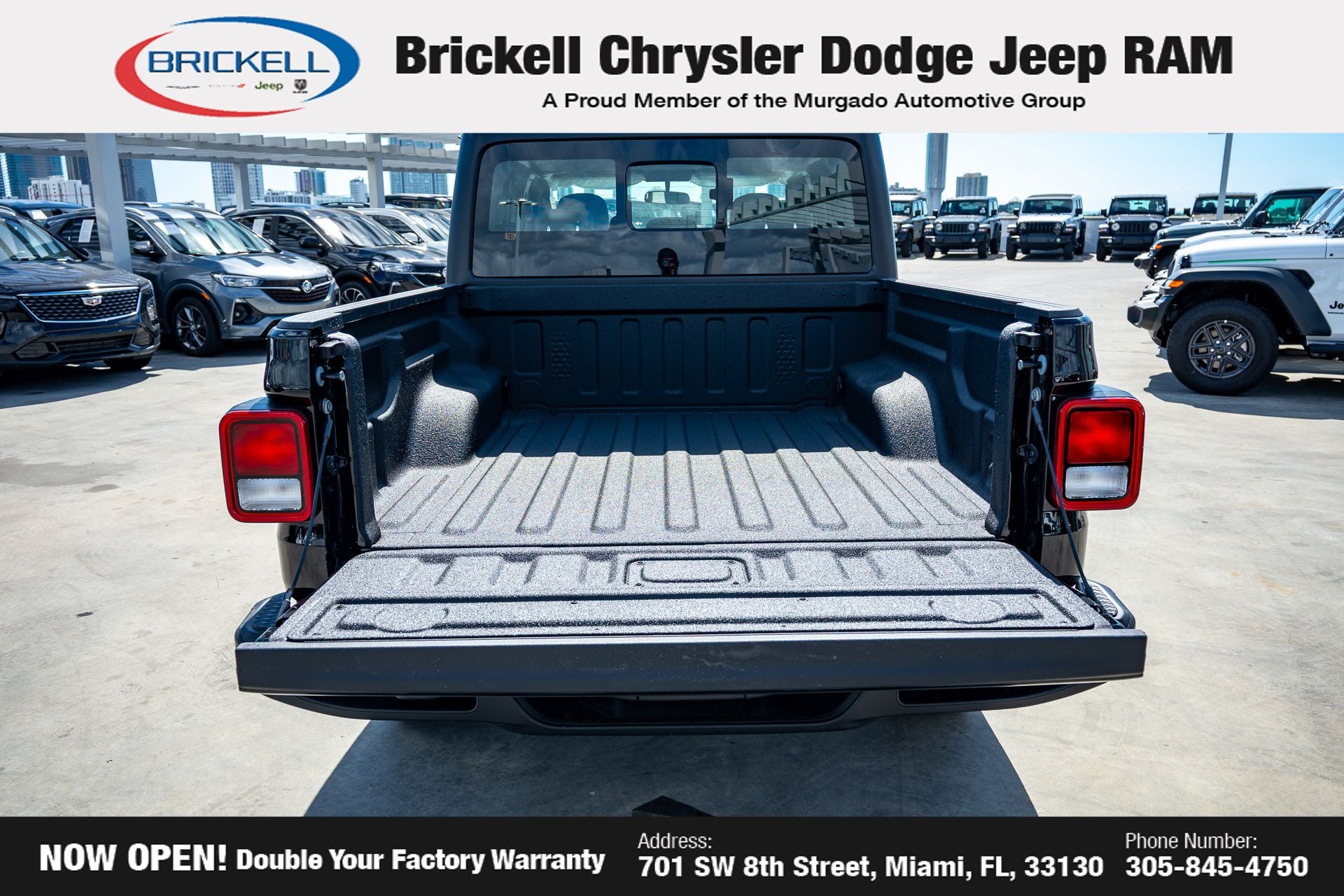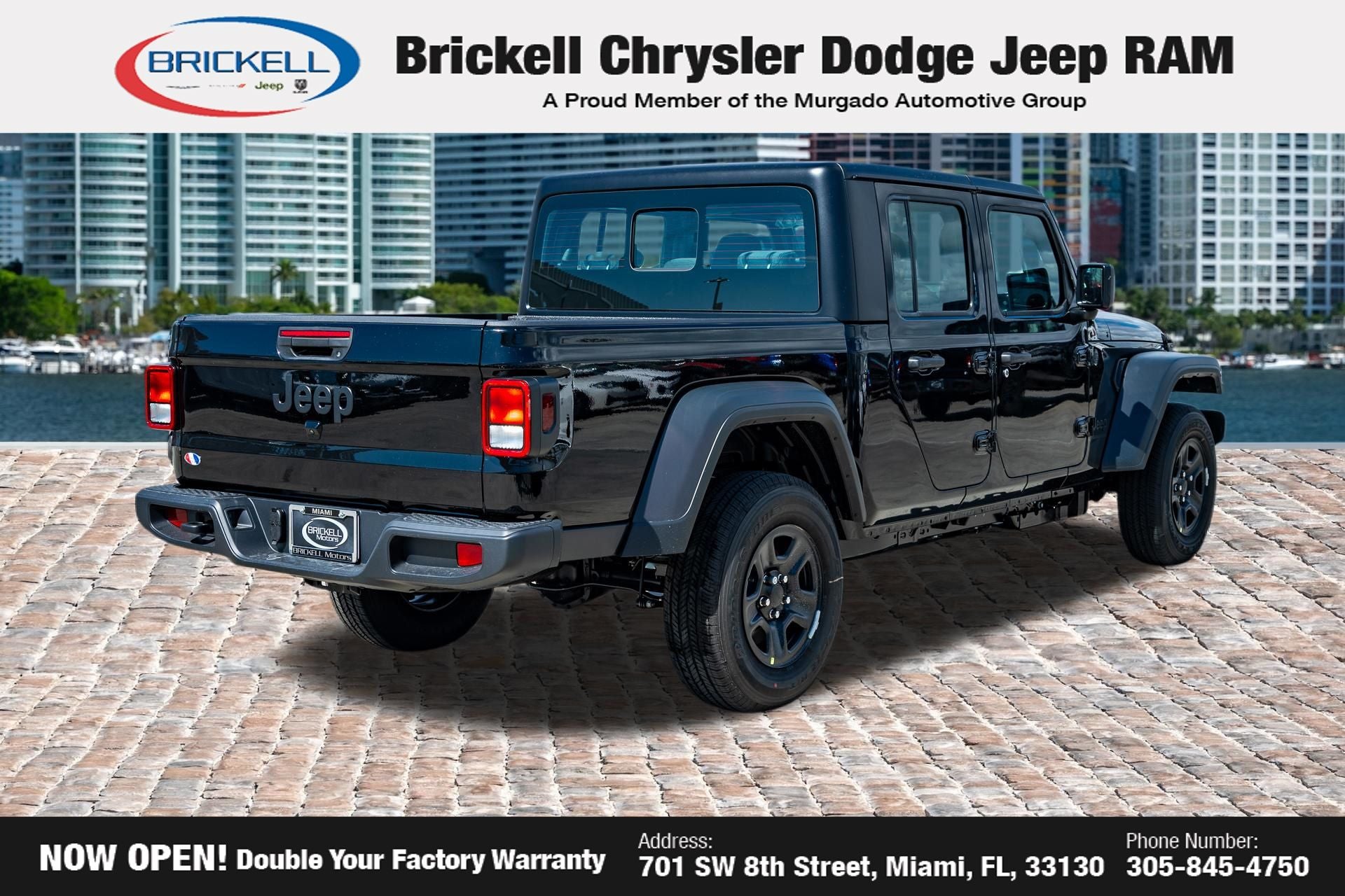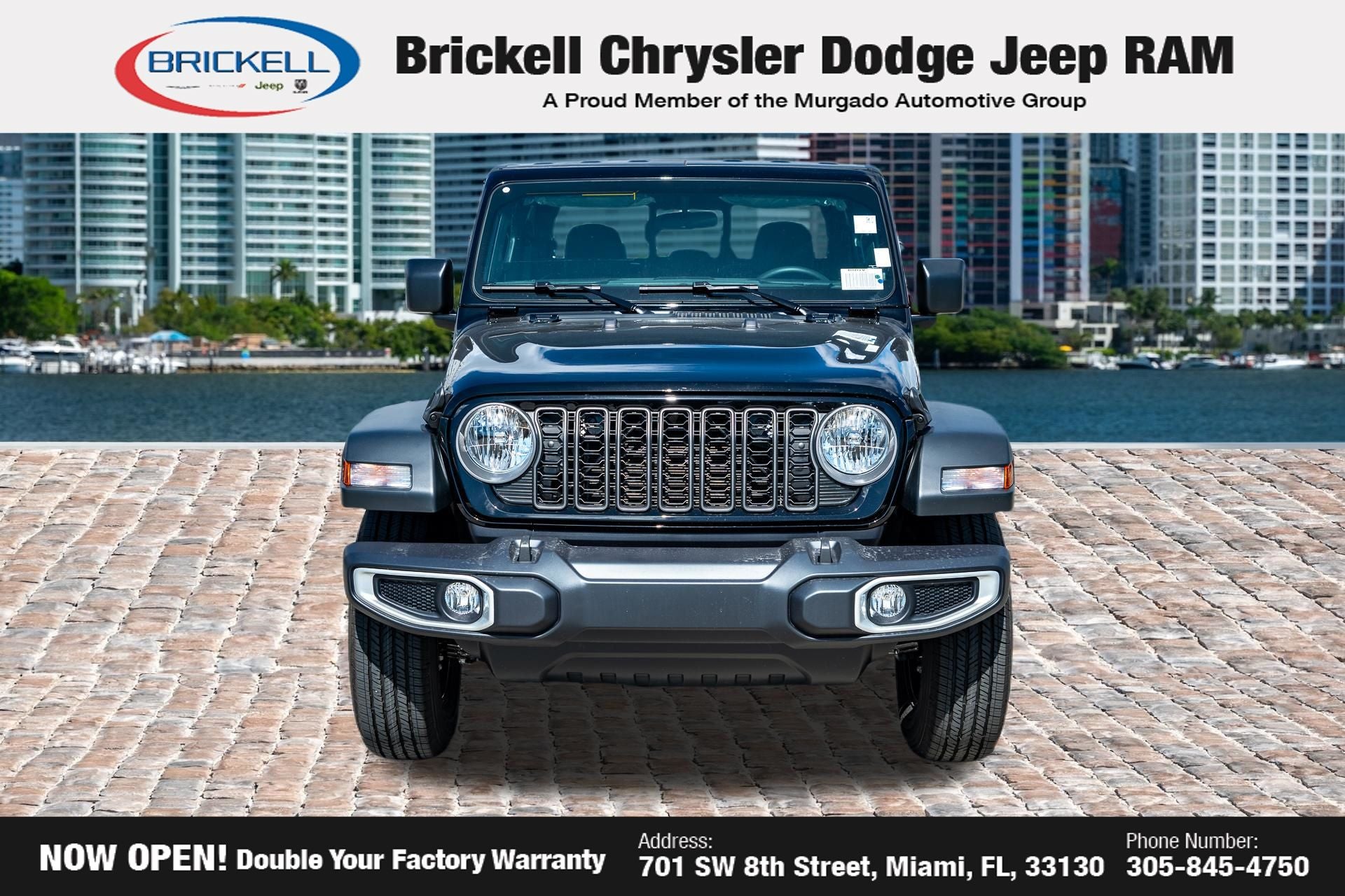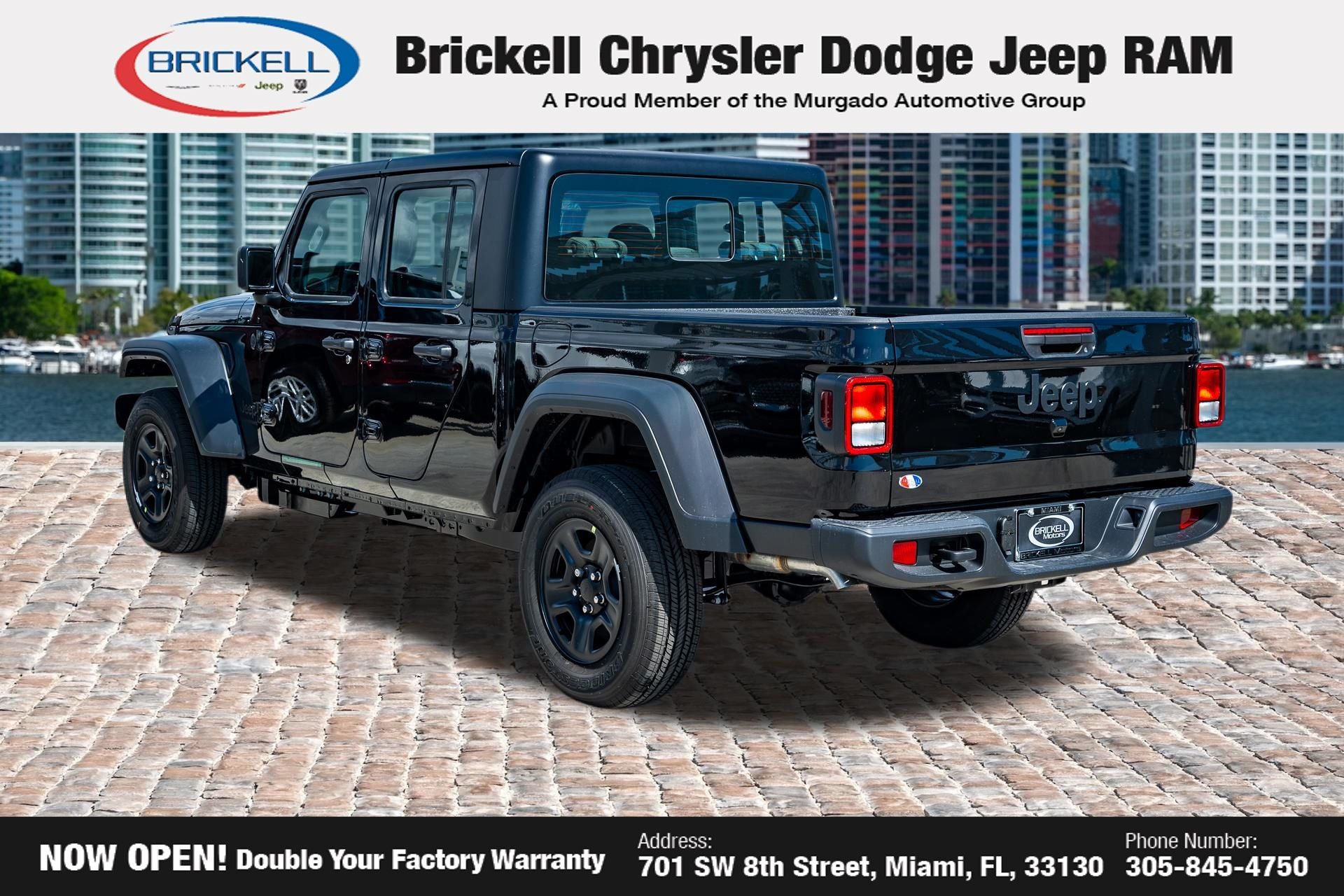 Price includes: $1000 - 2026 National Retail Bonus Cash . Exp. 04/30/2026 $1000 - 2026 National Stellantis Loyalty Bonus Cash . Exp. 04/30/2026 $500 - 2026 National 2026 Military Bonus Cash . Exp. 01/04/2027 Discover Your Next Vehicle at Brickell Chrysler Dodge Jeep Ram Welcome to Brickell CDJR, where we go beyond selling cars. We double the factory powertrain warranty, giving you added peace of mind. Our dealership offers one of the largest new car inventories in the region, ensuring you find the right vehicle Prices displayed do not included our Perma-plate. Our state-of-the-art service department is the largest in the country and is open seven days a week from 7 AM to 9 PM. Visit us at 701 SW 8th St, Miami, FL 33130, or call 305-777-2800 to learn more and schedule a test drive. The displayed price includes an incentive for financing with Brickell CDJR Finance Company. Outside financing and bank drafts are not accepted. All pre-owned vehicle exports are subject to an export fee. Prices apply only to customers who live, work, or worship in Broward, Miami-Dade, Palm Beach, Monroe, Collier, Hendry, Lee, Glades, Martin, St. Lucie, Okeechobee, Manatee, Hillsborough, Osceola, or Orange County. Customers outside these counties will pay an additional $ Taxes, title, registration, and dealer fees apply. Factory MSRP: $44,040 Black Clearcoat 2026 Jeep Gladiator Sport 4WD 8-Speed Automatic 3.6L V6 24V VVT