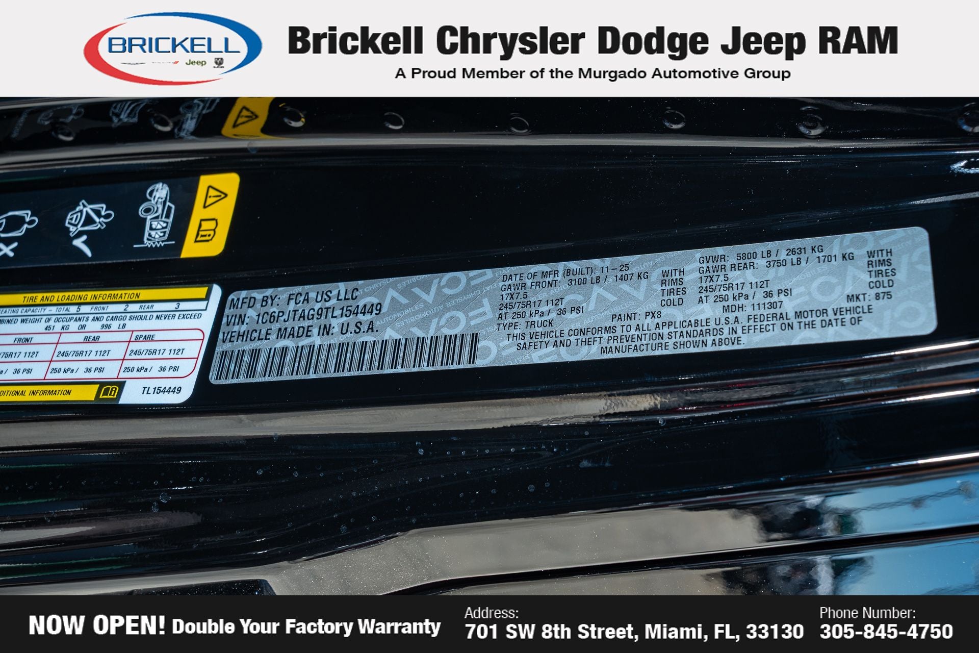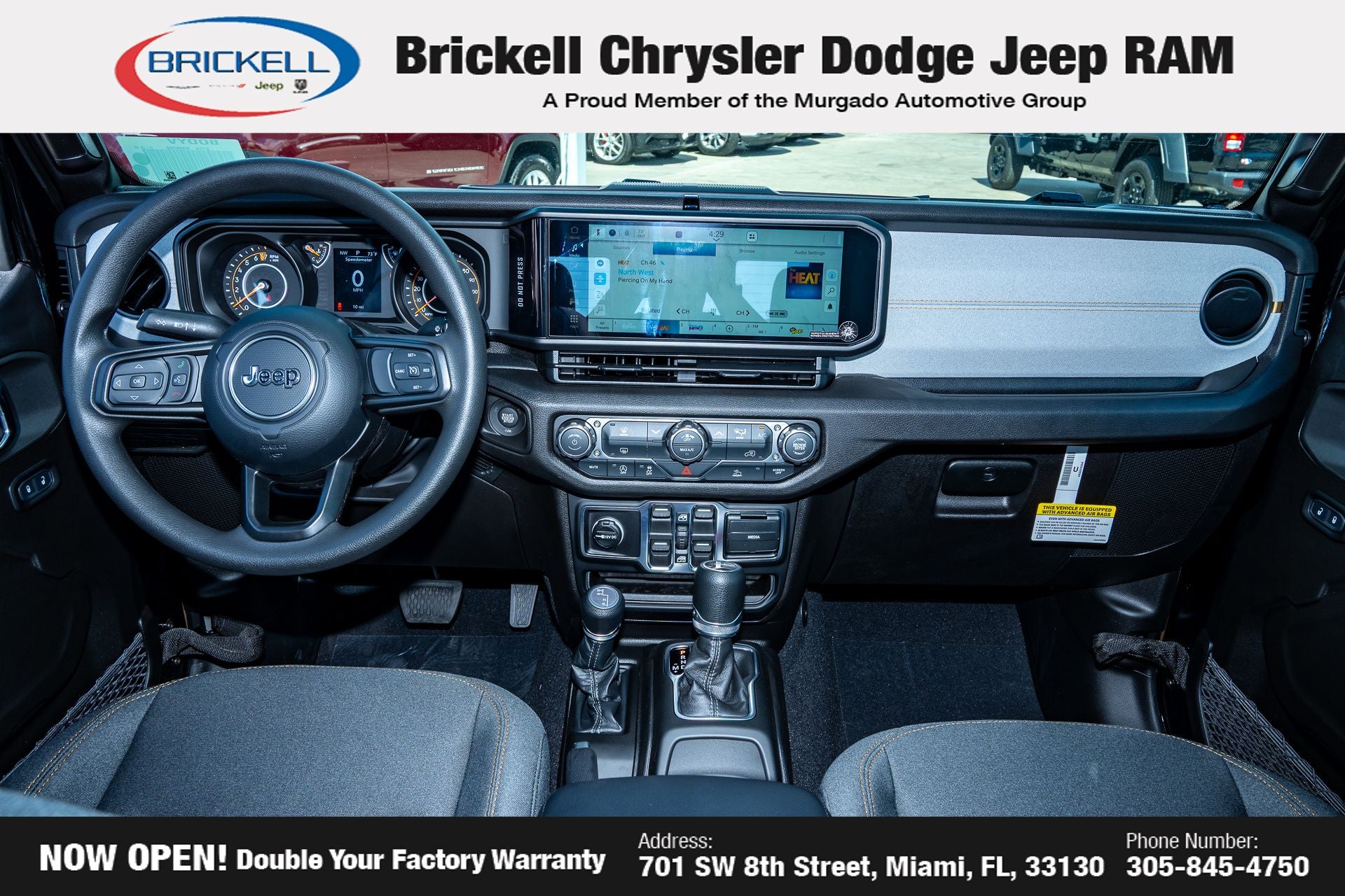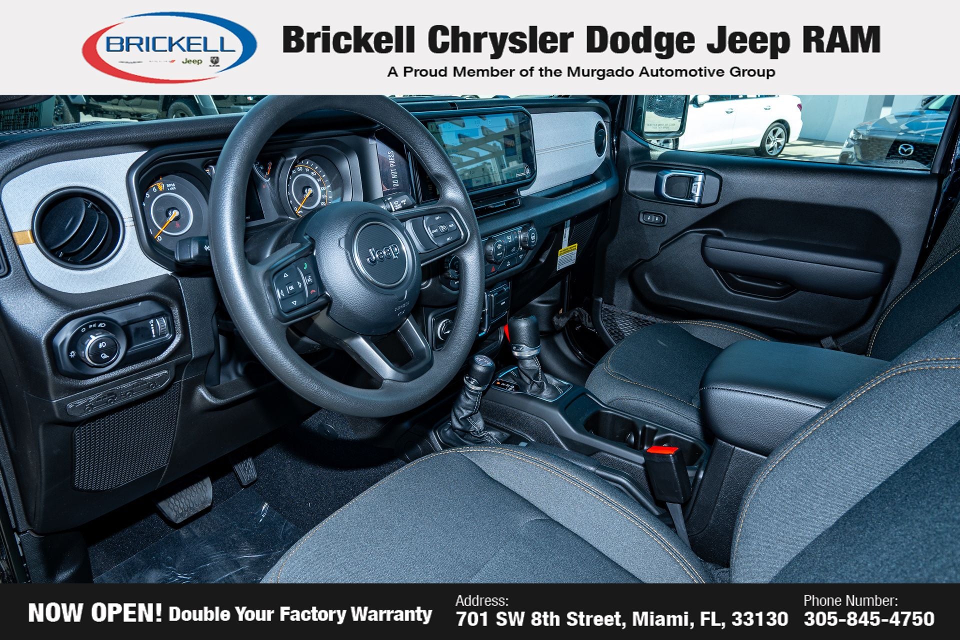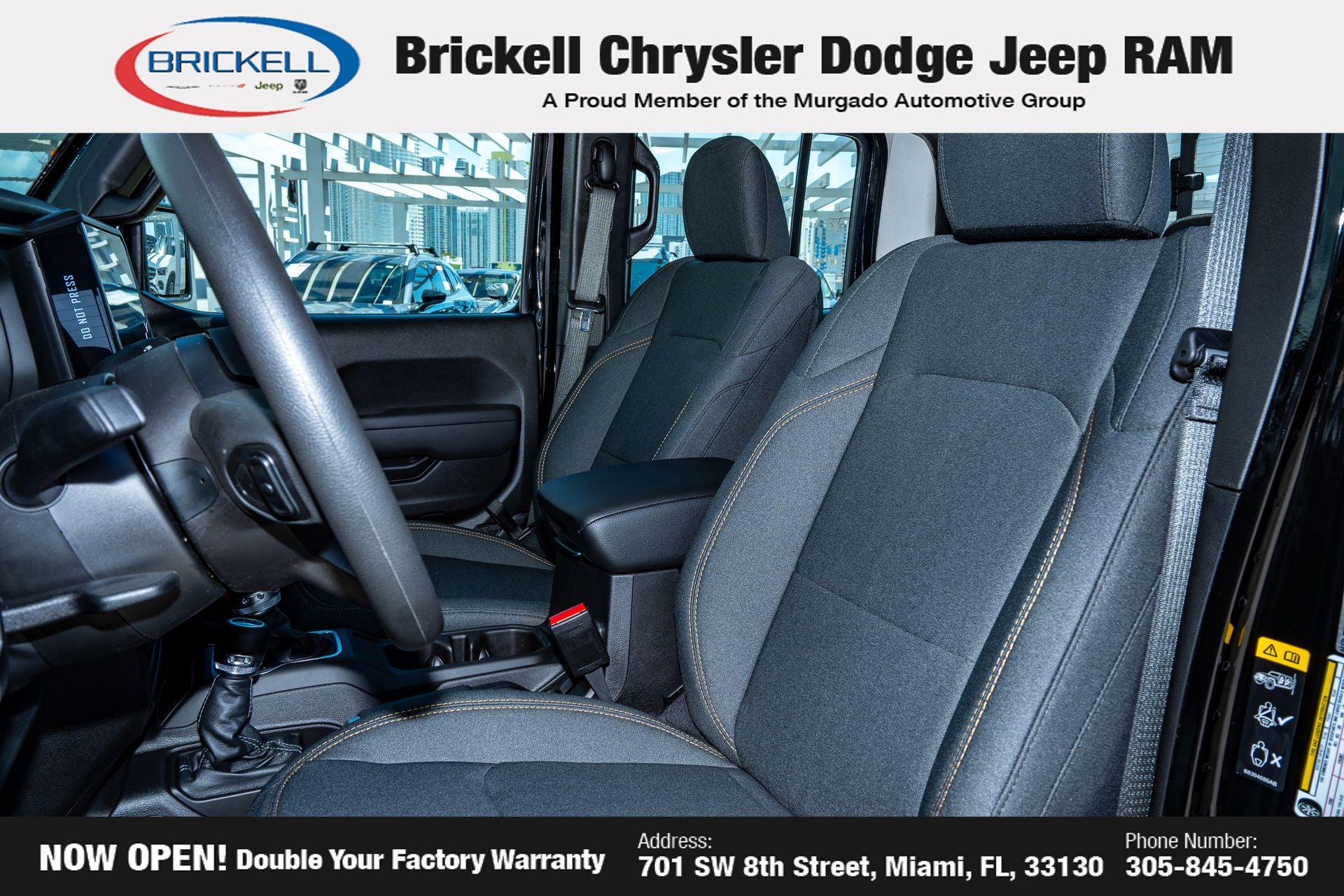 Price includes: $1000 - 2026 National Retail Bonus Cash . Exp. 04/30/2026 $1000 - 2026 National Stellantis Loyalty Bonus Cash . Exp. 04/30/2026 $500 - 2026 National 2026 Military Bonus Cash . Exp. 01/04/2027 Discover Your Next Vehicle at Brickell Chrysler Dodge Jeep Ram Welcome to Brickell CDJR, where we go beyond selling cars. We double the factory powertrain warranty, giving you added peace of mind. Our dealership offers one of the largest new car inventories in the region, ensuring you find the right vehicle Prices displayed do not included our Perma-plate. Our state-of-the-art service department is the largest in the country and is open seven days a week from 7 AM to 9 PM. Visit us at 701 SW 8th St, Miami, FL 33130, or call 305-777-2800 to learn more and schedule a test drive. The displayed price includes an incentive for financing with Brickell CDJR Finance Company. Outside financing and bank drafts are not accepted. All pre-owned vehicle exports are subject to an export fee. Prices apply only to customers who live, work, or worship in Broward, Miami-Dade, Palm Beach, Monroe, Collier, Hendry, Lee, Glades, Martin, St. Lucie, Okeechobee, Manatee, Hillsborough, Osceola, or Orange County. Customers outside these counties will pay an additional $ Taxes, title, registration, and dealer fees apply. Factory MSRP: $44,040 Black Clearcoat 2026 Jeep Gladiator Sport 4WD 8-Speed Automatic 3.6L V6 24V VVT
