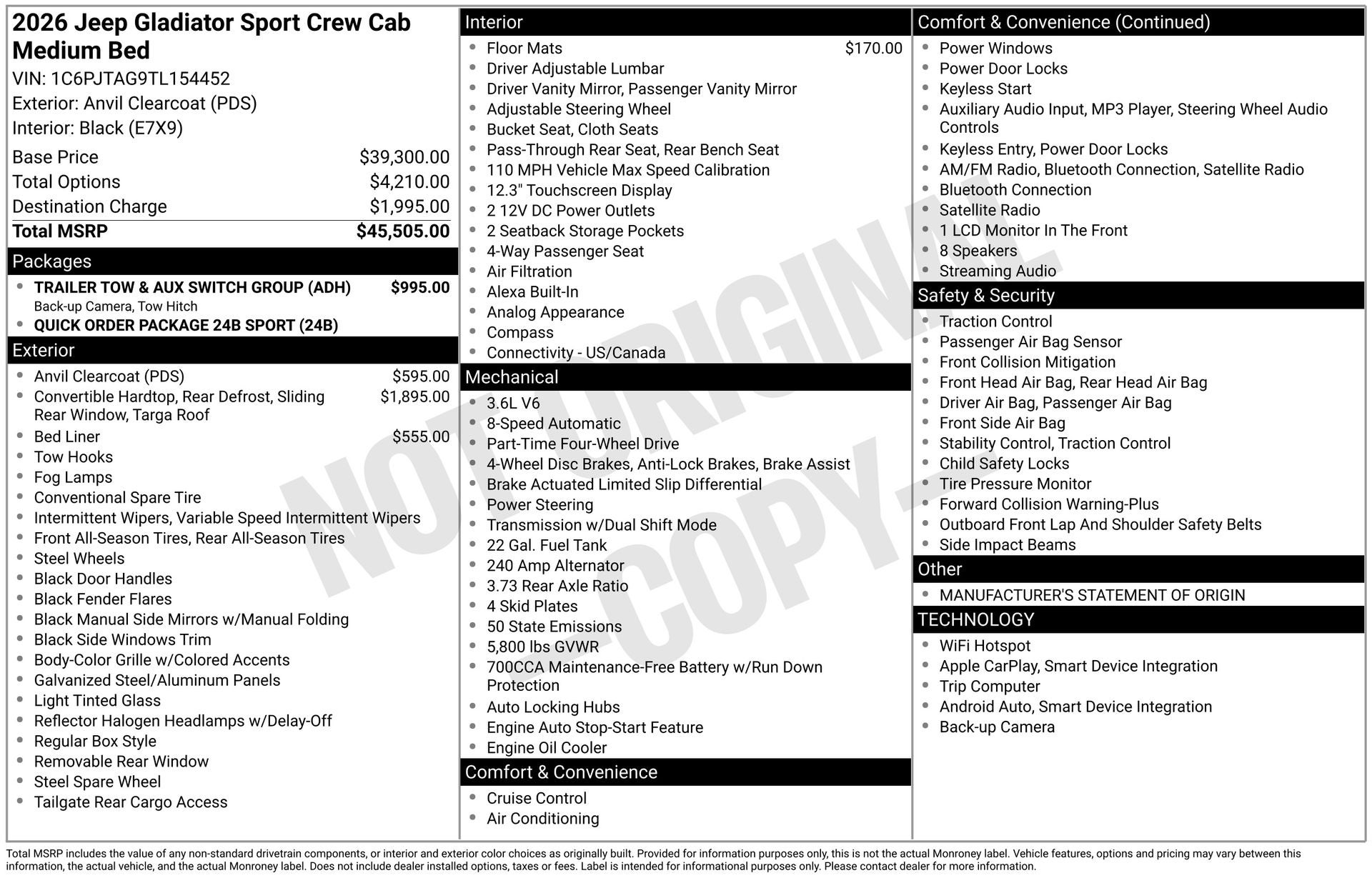 Price includes: $1000 - 2026 National Retail Bonus Cash . Exp. 04/30/2026 Discover Your Next Vehicle at Brickell Chrysler Dodge Jeep Ram Welcome to Brickell CDJR, where we go beyond selling cars. We double the factory powertrain warranty, giving you added peace of mind. Our dealership offers one of the largest new car inventories in the region, ensuring you find the right vehicle Prices displayed do not included our Perma-plate. Our state-of-the-art service department is the largest in the country and is open seven days a week from 7 AM to 9 PM. Visit us at 701 SW 8th St, Miami, FL 33130, or call 305-777-2800 to learn more and schedule a test drive. The displayed price includes an incentive for financing with Brickell CDJR Finance Company. Outside financing and bank drafts are not accepted. All pre-owned vehicle exports are subject to an export fee. Prices apply only to customers who live, work, or worship in Broward, Miami-Dade, Palm Beach, Monroe, Collier, Hendry, Lee, Glades, Martin, St. Lucie, Okeechobee, Manatee, Hillsborough, Osceola, or Orange County. Customers outside these counties will pay an additional $ Taxes, title, registration, and dealer fees apply. Factory MSRP: $45,035 Anvil Clearcoat 2026 Jeep Gladiator Sport 4WD 8-Speed Automatic 3.6L V6 24V VVT