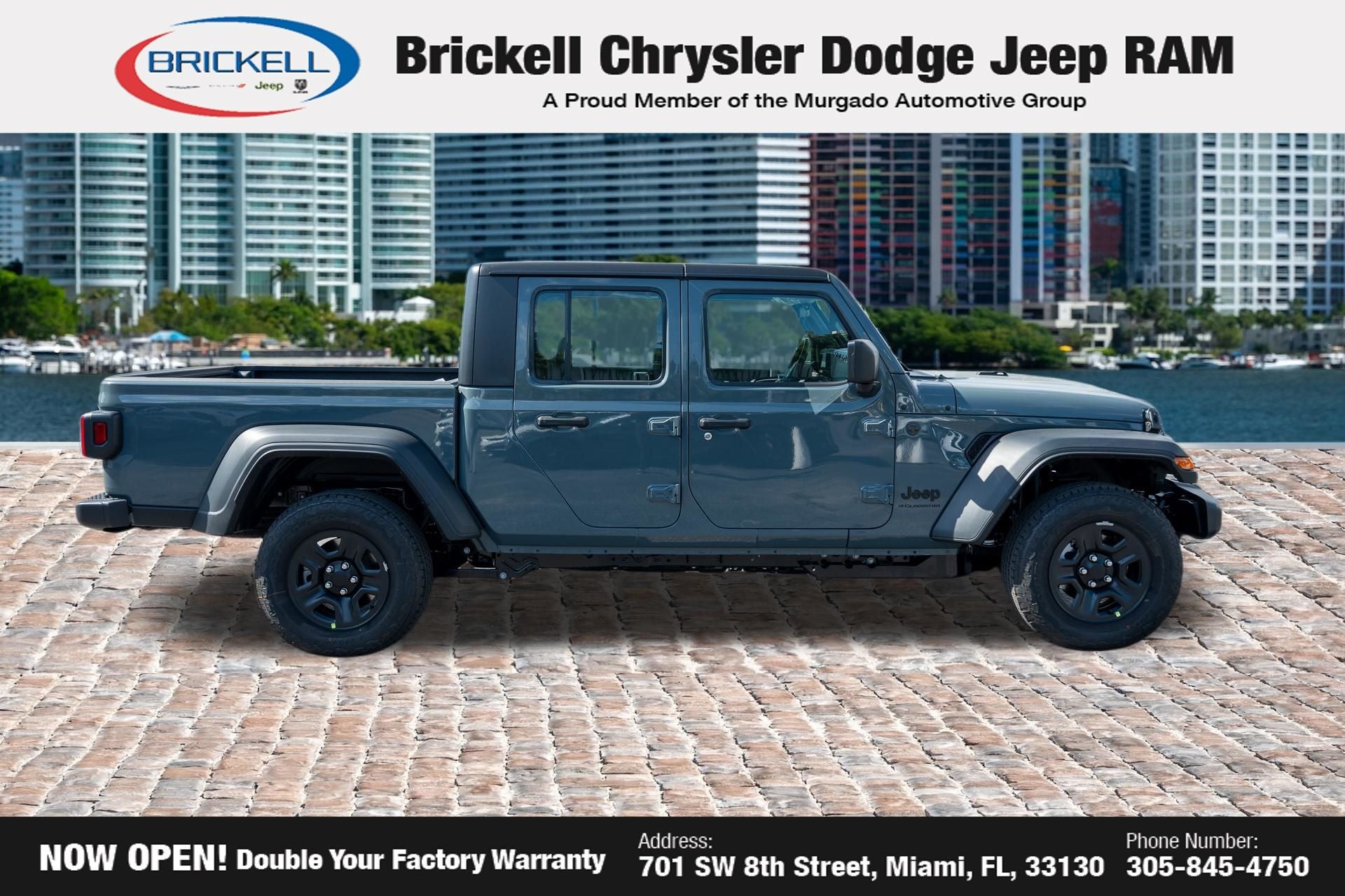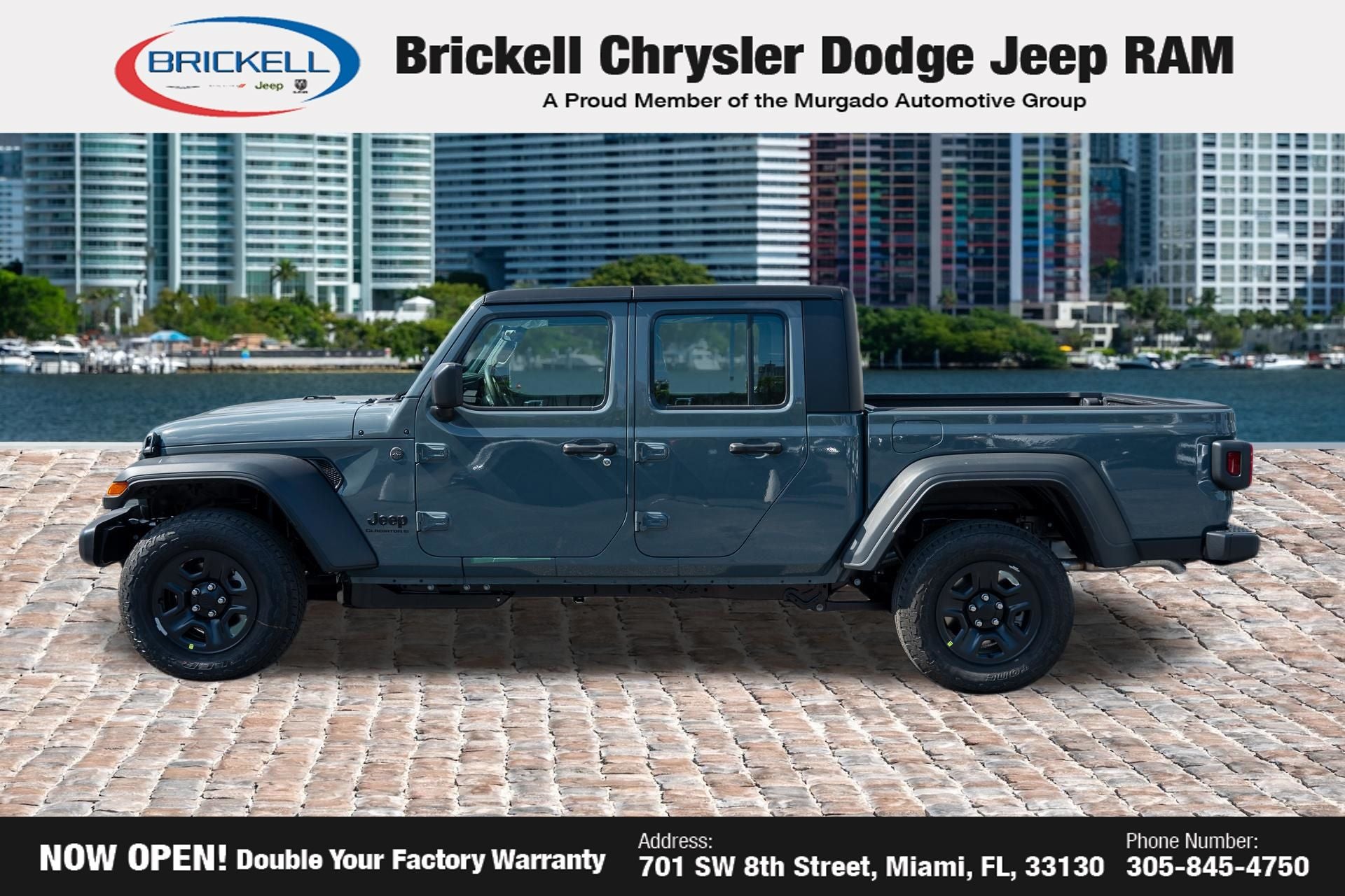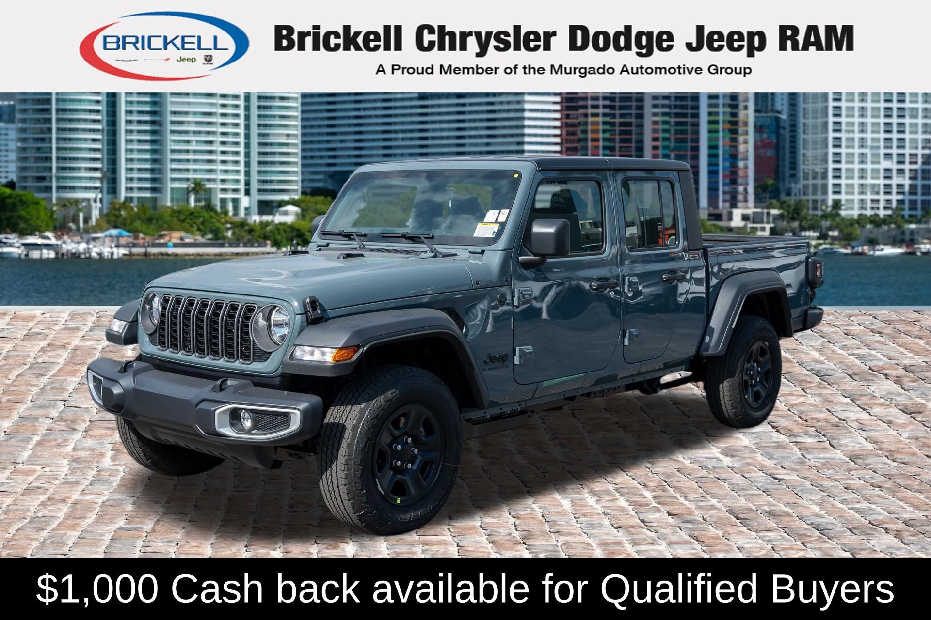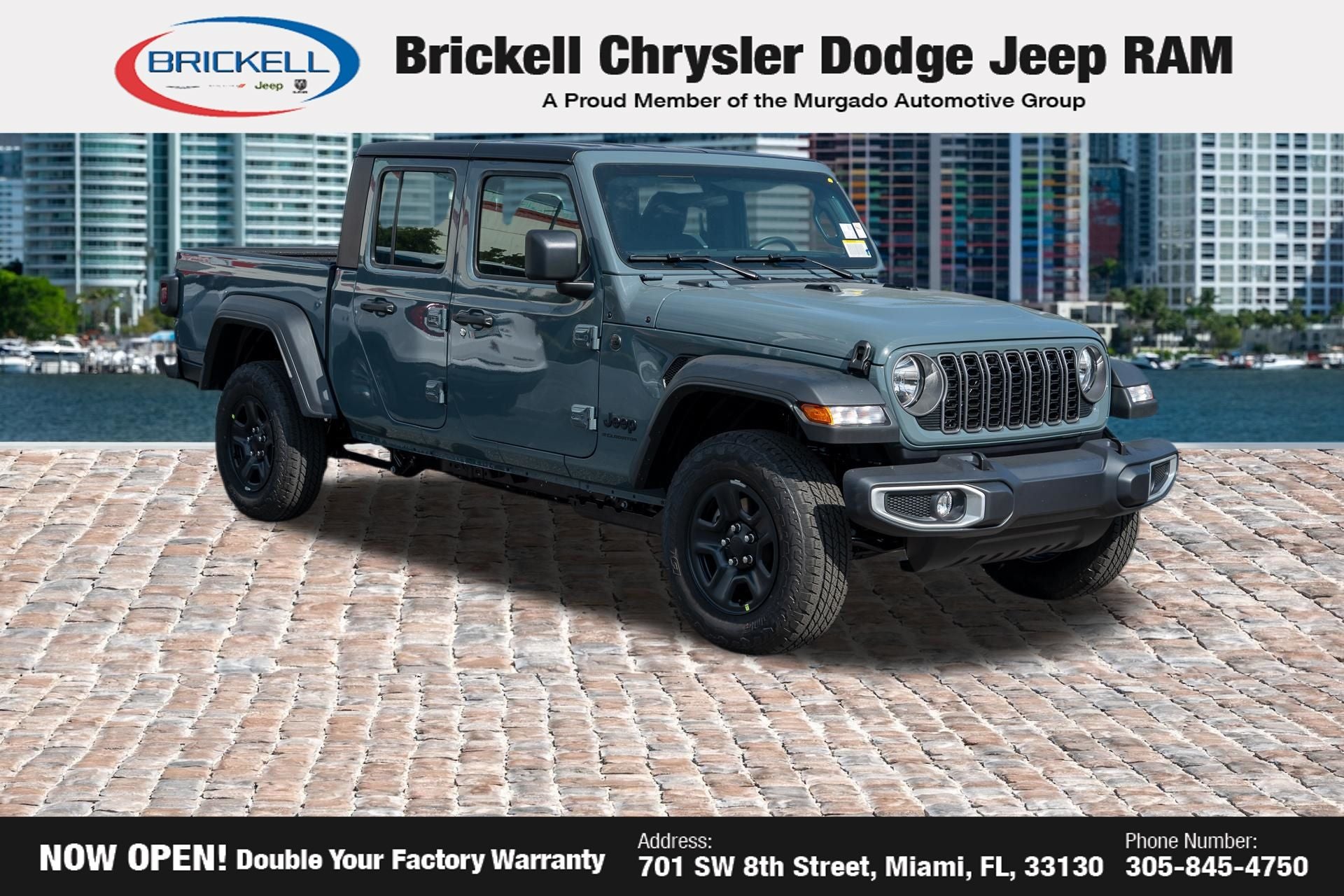 Price includes: $1000 - 2026 National Retail Bonus Cash . Exp. 04/30/2026 Discover Your Next Vehicle at Brickell Chrysler Dodge Jeep Ram Welcome to Brickell CDJR, where we go beyond selling cars. We double the factory powertrain warranty, giving you added peace of mind. Our dealership offers one of the largest new car inventories in the region, ensuring you find the right vehicle Prices displayed do not included our Perma-plate. Our state-of-the-art service department is the largest in the country and is open seven days a week from 7 AM to 9 PM. Visit us at 701 SW 8th St, Miami, FL 33130, or call 305-777-2800 to learn more and schedule a test drive. The displayed price includes an incentive for financing with Brickell CDJR Finance Company. Outside financing and bank drafts are not accepted. All pre-owned vehicle exports are subject to an export fee. Prices apply only to customers who live, work, or worship in Broward, Miami-Dade, Palm Beach, Monroe, Collier, Hendry, Lee, Glades, Martin, St. Lucie, Okeechobee, Manatee, Hillsborough, Osceola, or Orange County. Customers outside these counties will pay an additional $ Taxes, title, registration, and dealer fees apply. Factory MSRP: $46,035 Anvil Clearcoat 2026 Jeep Gladiator Sport 4WD 8-Speed Automatic 3.6L V6 24V VVT