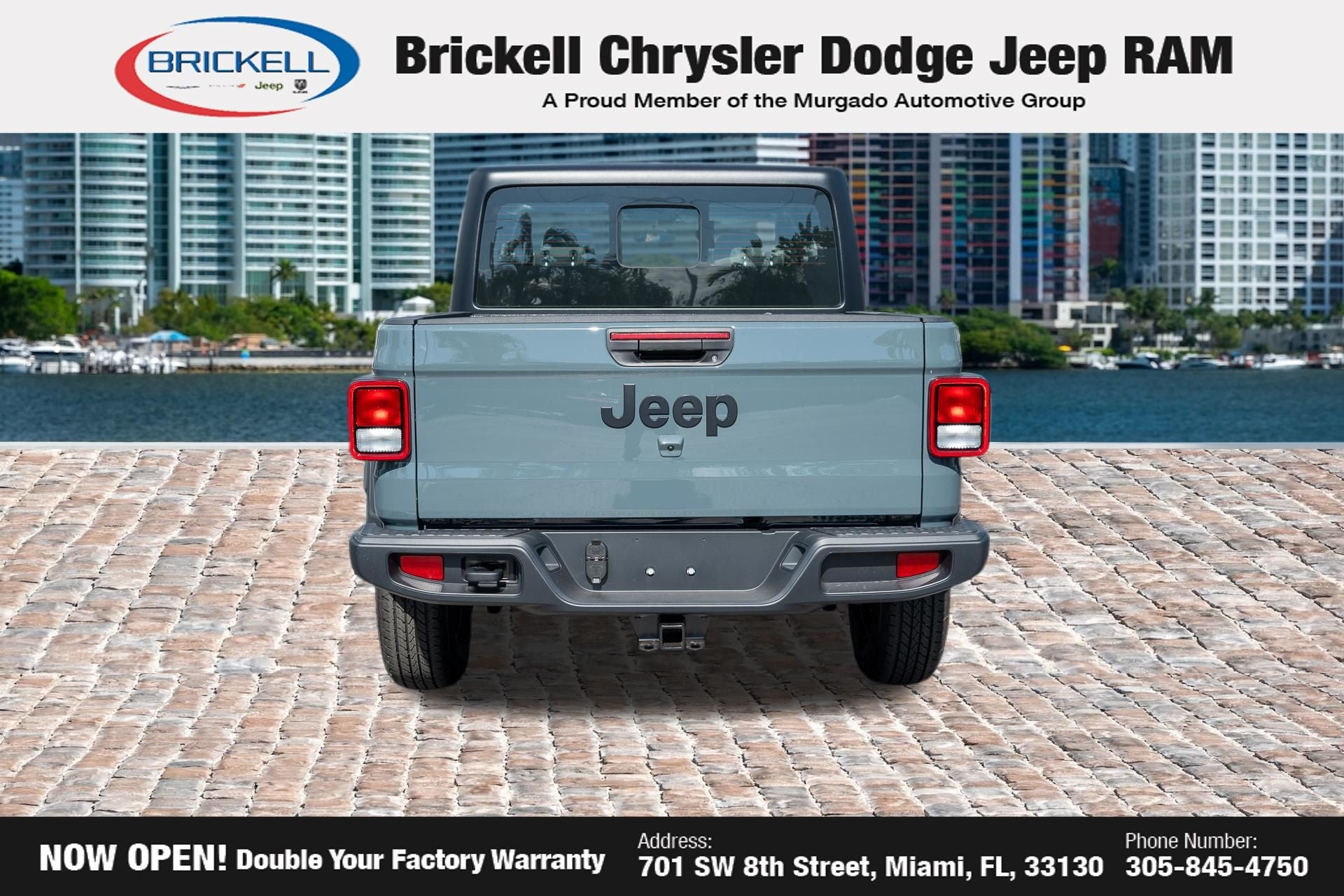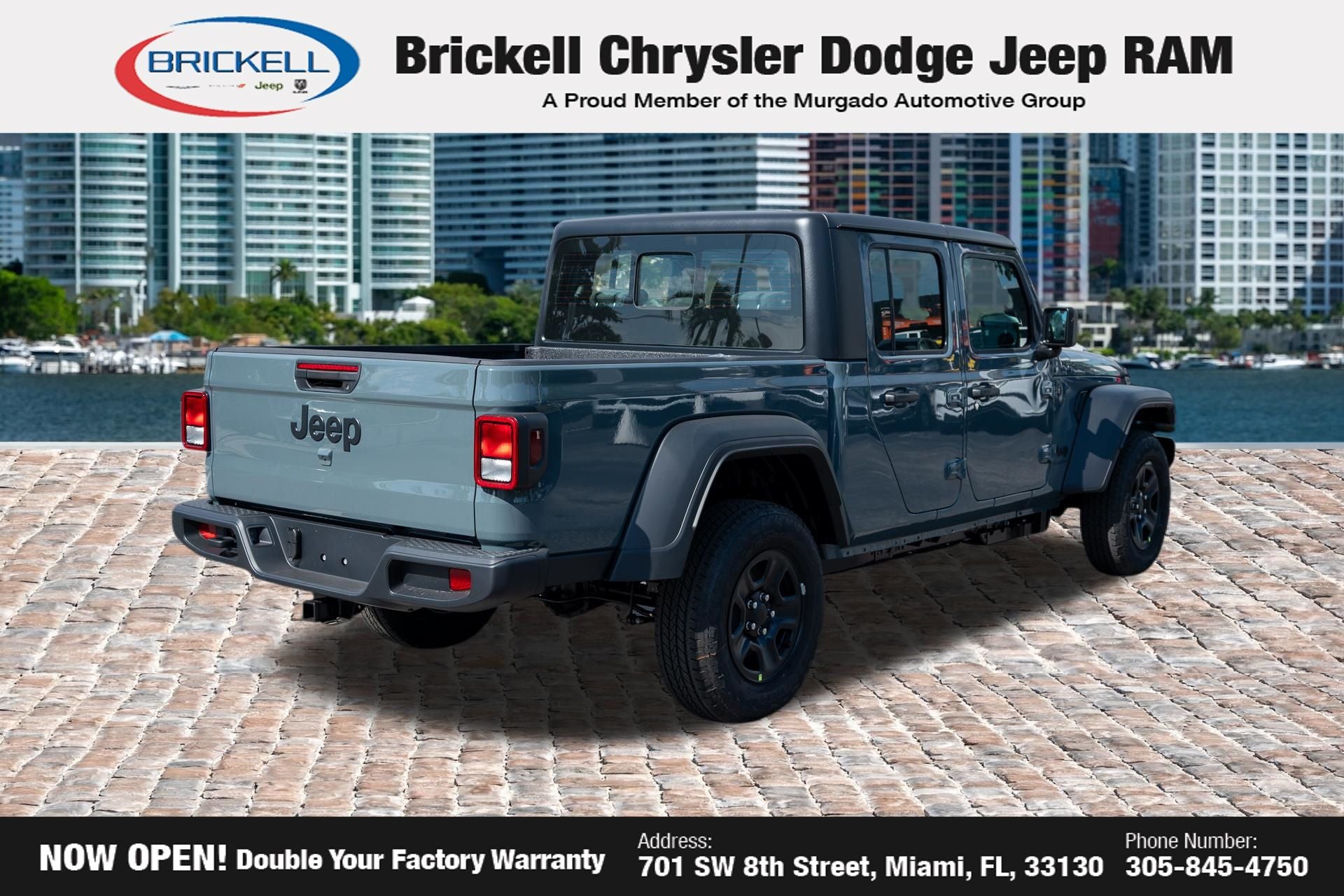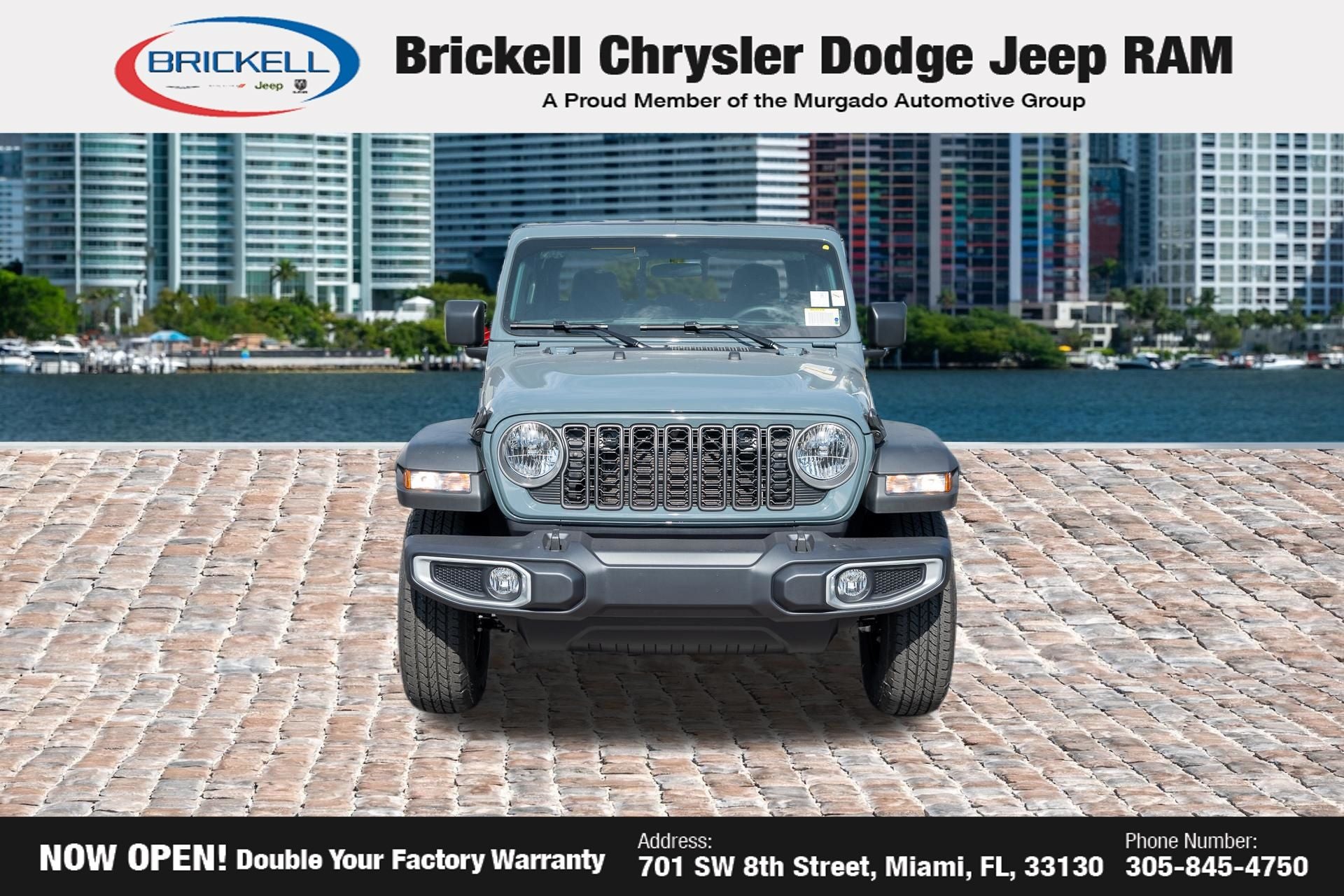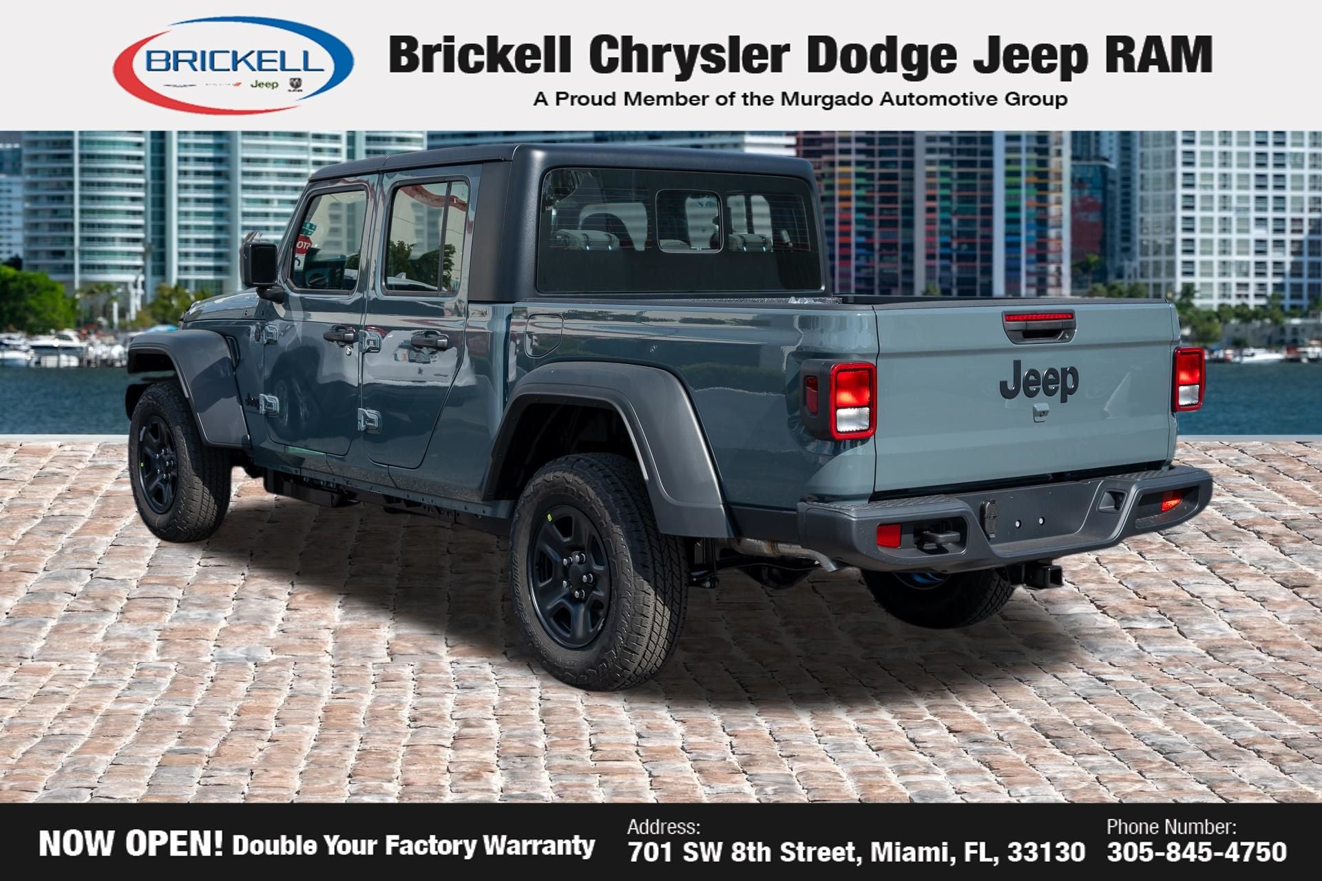 Price includes: $1000 - 2026 National Retail Bonus Cash . Exp. 04/30/2026 Discover Your Next Vehicle at Brickell Chrysler Dodge Jeep Ram Welcome to Brickell CDJR, where we go beyond selling cars. We double the factory powertrain warranty, giving you added peace of mind. Our dealership offers one of the largest new car inventories in the region, ensuring you find the right vehicle Prices displayed do not included our Perma-plate. Our state-of-the-art service department is the largest in the country and is open seven days a week from 7 AM to 9 PM. Visit us at 701 SW 8th St, Miami, FL 33130, or call 305-777-2800 to learn more and schedule a test drive. The displayed price includes an incentive for financing with Brickell CDJR Finance Company. Outside financing and bank drafts are not accepted. All pre-owned vehicle exports are subject to an export fee. Prices apply only to customers who live, work, or worship in Broward, Miami-Dade, Palm Beach, Monroe, Collier, Hendry, Lee, Glades, Martin, St. Lucie, Okeechobee, Manatee, Hillsborough, Osceola, or Orange County. Customers outside these counties will pay an additional $ Taxes, title, registration, and dealer fees apply. Factory MSRP: $46,035 Anvil Clearcoat 2026 Jeep Gladiator Sport 4WD 8-Speed Automatic 3.6L V6 24V VVT