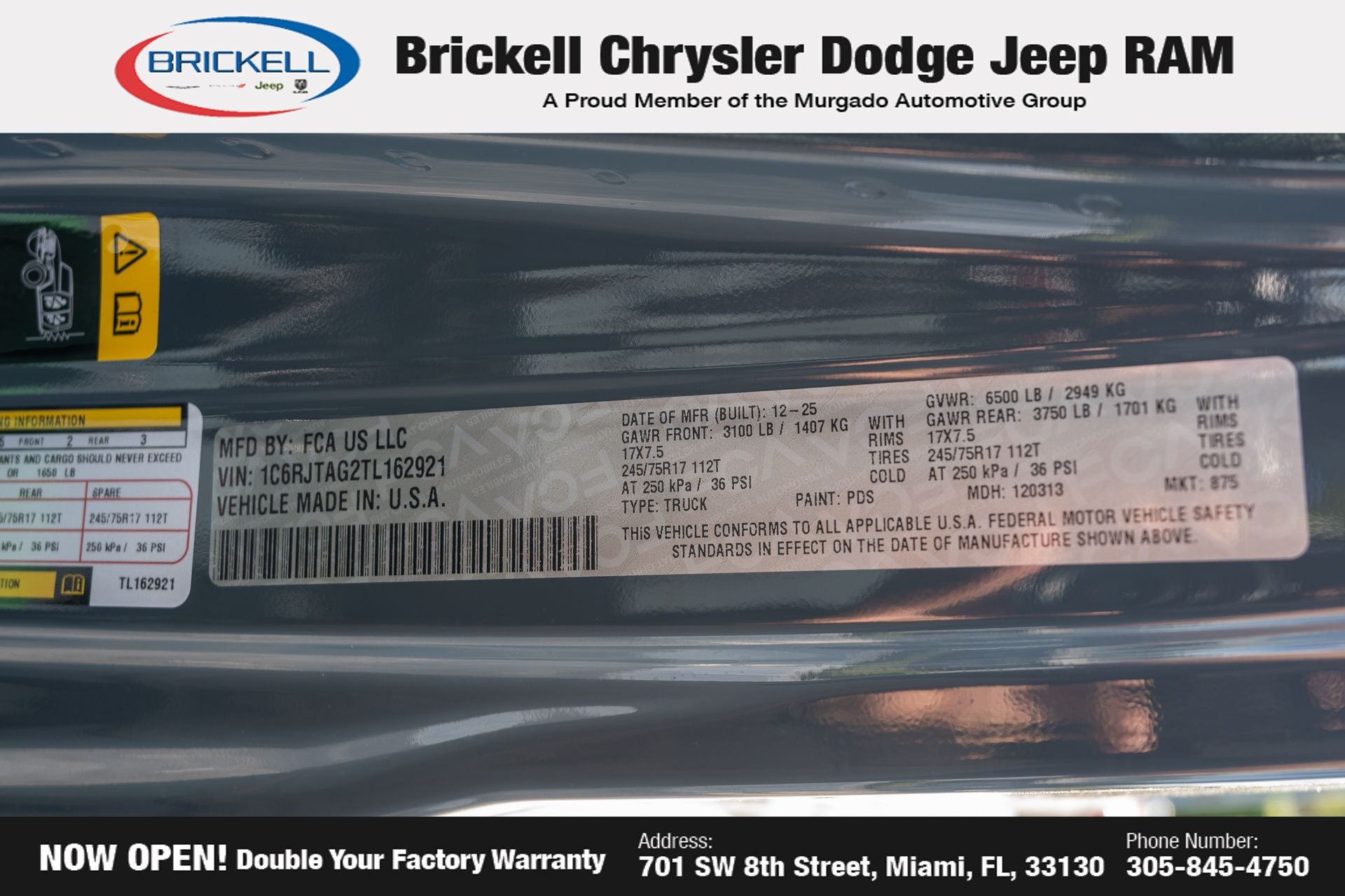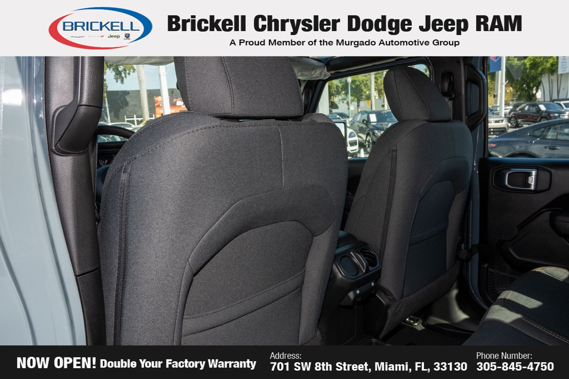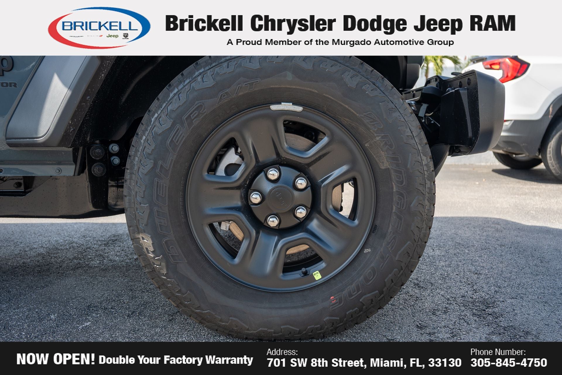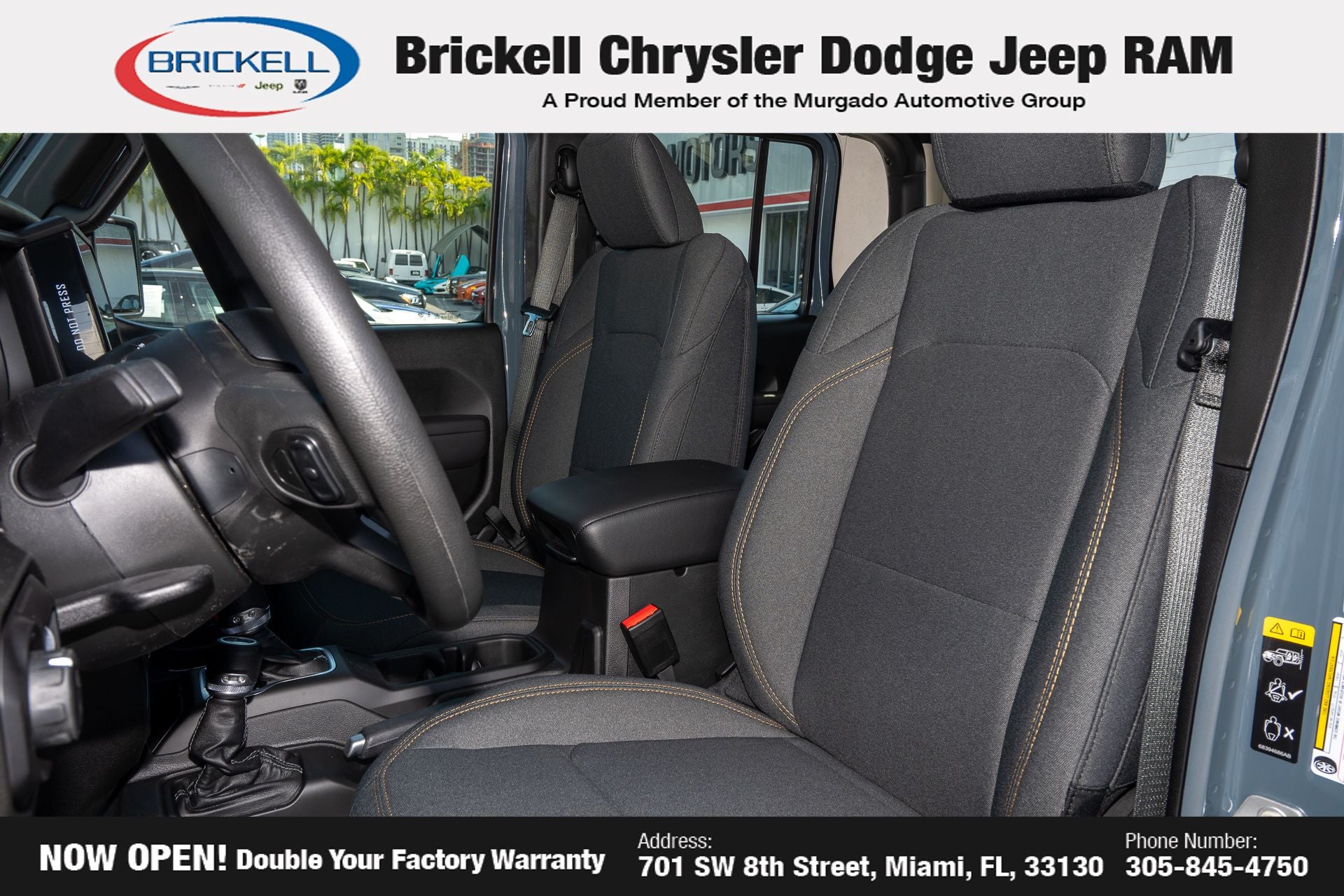 Price includes: $1000 - 2026 National Retail Bonus Cash . Exp. 04/30/2026 Discover Your Next Vehicle at Brickell Chrysler Dodge Jeep Ram Welcome to Brickell CDJR, where we go beyond selling cars. We double the factory powertrain warranty, giving you added peace of mind. Our dealership offers one of the largest new car inventories in the region, ensuring you find the right vehicle Prices displayed do not included our Perma-plate. Our state-of-the-art service department is the largest in the country and is open seven days a week from 7 AM to 9 PM. Visit us at 701 SW 8th St, Miami, FL 33130, or call 305-777-2800 to learn more and schedule a test drive. The displayed price includes an incentive for financing with Brickell CDJR Finance Company. Outside financing and bank drafts are not accepted. All pre-owned vehicle exports are subject to an export fee. Prices apply only to customers who live, work, or worship in Broward, Miami-Dade, Palm Beach, Monroe, Collier, Hendry, Lee, Glades, Martin, St. Lucie, Okeechobee, Manatee, Hillsborough, Osceola, or Orange County. Customers outside these counties will pay an additional $ Taxes, title, registration, and dealer fees apply. Factory MSRP: $46,035 Anvil Clearcoat 2026 Jeep Gladiator Sport 4WD 8-Speed Automatic 3.6L V6 24V VVT