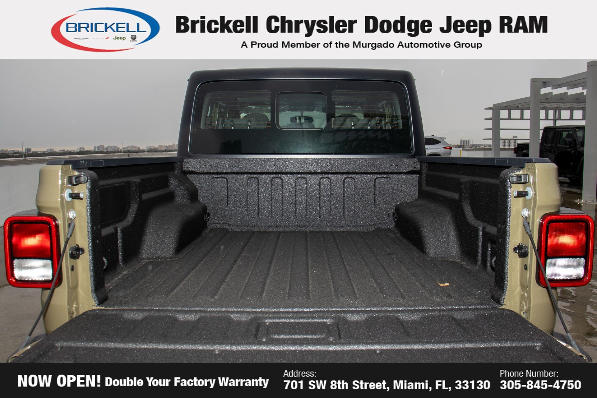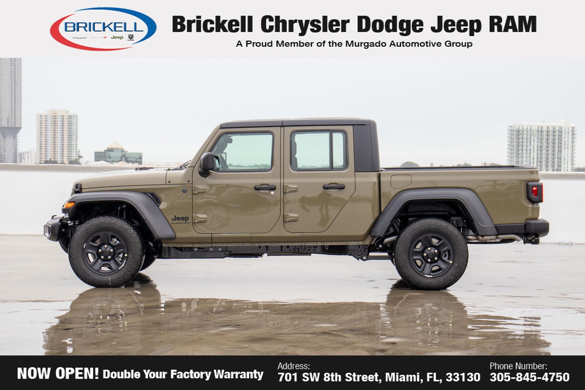 Price includes: $500 - 2026 National 2026 Military Bonus Cash . Exp. 01/04/2027 Discover Your Next Vehicle at Brickell Chrysler Dodge Jeep Ram Welcome to Brickell CDJR, where we go beyond selling cars. We double the factory powertrain warranty, giving you added peace of mind. Our dealership offers one of the largest new car inventories in the region, ensuring you find the right vehicle Prices displayed do not included our Perma-plate. Our state-of-the-art service department is the largest in the country and is open seven days a week from 7 AM to 9 PM. Visit us at 701 SW 8th St, Miami, FL 33130, or call 305-777-2800 to learn more and schedule a test drive. The displayed price includes an incentive for financing with Brickell CDJR Finance Company. Outside financing and bank drafts are not accepted. All pre-owned vehicle exports are subject to an export fee. Prices apply only to customers who live, work, or worship in Broward, Miami-Dade, Palm Beach, Monroe, Collier, Hendry, Lee, Glades, Martin, St. Lucie, Okeechobee, Manatee, Hillsborough, Osceola, or Orange County. Customers outside these counties will pay an additional $ Taxes, title, registration, and dealer fees apply. Factory MSRP: $46,035 41 2026 Jeep Gladiator Sport 4WD 8-Speed Automatic 3.6L V6 24V VVT