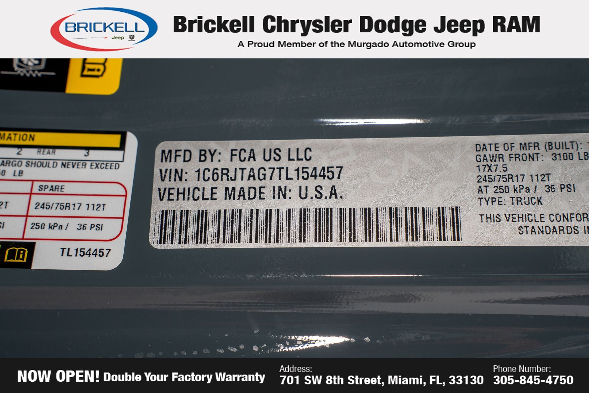 Price includes: $500 - 2026 National 2026 Military Bonus Cash . Exp. 01/04/2027 Discover Your Next Vehicle at Brickell Chrysler Dodge Jeep Ram Welcome to Brickell CDJR, where we go beyond selling cars. We double the factory powertrain warranty, giving you added peace of mind. Our dealership offers one of the largest new car inventories in the region, ensuring you find the right vehicle Prices displayed do not included our Perma-plate. Our state-of-the-art service department is the largest in the country and is open seven days a week from 7 AM to 9 PM. Visit us at 701 SW 8th St, Miami, FL 33130, or call 305-777-2800 to learn more and schedule a test drive. The displayed price includes an incentive for financing with Brickell CDJR Finance Company. Outside financing and bank drafts are not accepted. All pre-owned vehicle exports are subject to an export fee. Prices apply only to customers who live, work, or worship in Broward, Miami-Dade, Palm Beach, Monroe, Collier, Hendry, Lee, Glades, Martin, St. Lucie, Okeechobee, Manatee, Hillsborough, Osceola, or Orange County. Customers outside these counties will pay an additional $ Taxes, title, registration, and dealer fees apply. Factory MSRP: $46,035 Anvil Clearcoat 2026 Jeep Gladiator Sport 4WD 8-Speed Automatic 3.6L V6 24V VVT