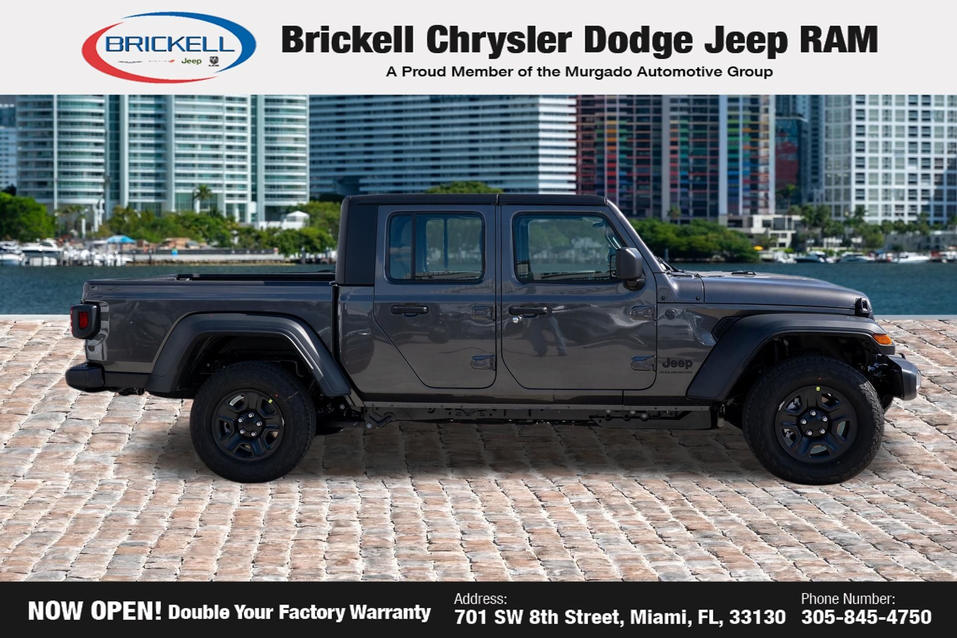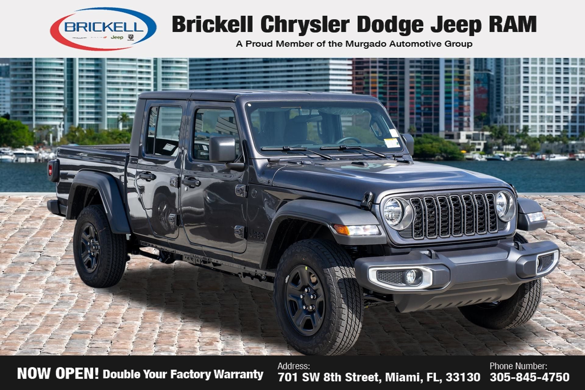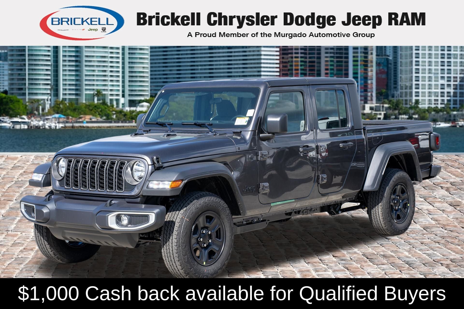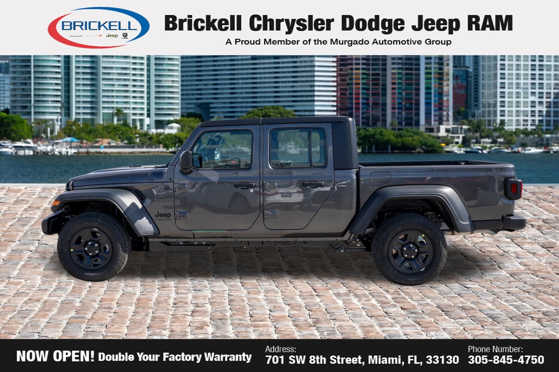 Price includes: $1000 - 2026 National Retail Bonus Cash . Exp. 04/30/2026 Discover Your Next Vehicle at Brickell Chrysler Dodge Jeep Ram Welcome to Brickell CDJR, where we go beyond selling cars. We double the factory powertrain warranty, giving you added peace of mind. Our dealership offers one of the largest new car inventories in the region, ensuring you find the right vehicle Prices displayed do not included our Perma-plate. Our state-of-the-art service department is the largest in the country and is open seven days a week from 7 AM to 9 PM. Visit us at 701 SW 8th St, Miami, FL 33130, or call 305-777-2800 to learn more and schedule a test drive. The displayed price includes an incentive for financing with Brickell CDJR Finance Company. Outside financing and bank drafts are not accepted. All pre-owned vehicle exports are subject to an export fee. Prices apply only to customers who live, work, or worship in Broward, Miami-Dade, Palm Beach, Monroe, Collier, Hendry, Lee, Glades, Martin, St. Lucie, Okeechobee, Manatee, Hillsborough, Osceola, or Orange County. Customers outside these counties will pay an additional $ Taxes, title, registration, and dealer fees apply. Factory MSRP: $46,035 Granite Crystal Metallic Clearcoat 2026 Jeep Gladiator Sport 4WD 8-Speed Automatic 3.6L V6 24V VVT