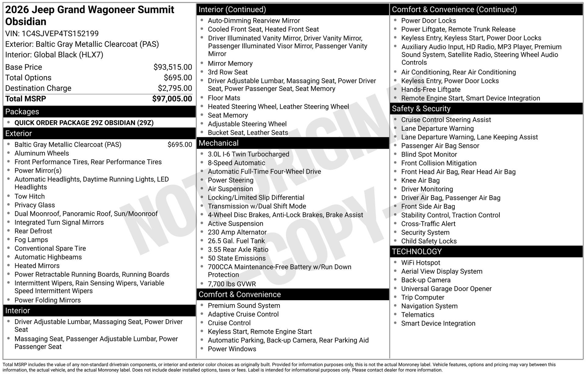 Discover Your Next Vehicle at Brickell Chrysler Dodge Jeep Ram Welcome to Brickell CDJR, where we go beyond selling cars. We double the factory powertrain warranty, giving you added peace of mind. Our dealership offers one of the largest new car inventories in the region, ensuring you find the right vehicle Prices displayed do not included our Perma-plate. Our state-of-the-art service department is the largest in the country and is open seven days a week from 7 AM to 9 PM. Visit us at 701 SW 8th St, Miami, FL 33130, or call 305-777-2800 to learn more and schedule a test drive. The displayed price includes an incentive for financing with Brickell CDJR Finance Company. Outside financing and bank drafts are not accepted. All pre-owned vehicle exports are subject to an export fee. Prices apply only to customers who live, work, or worship in Broward, Miami-Dade, Palm Beach, Monroe, Collier, Hendry, Lee, Glades, Martin, St. Lucie, Okeechobee, Manatee, Hillsborough, Osceola, or Orange County. Customers outside these counties will pay an additional $ Taxes, title, registration, and dealer fees apply. Factory MSRP: $96,680 Baltic Gray Metallic Clearcoat 2026 Jeep Grand Wagoneer Summit Obsidian 4WD 8-Speed Automatic 3.0L I6