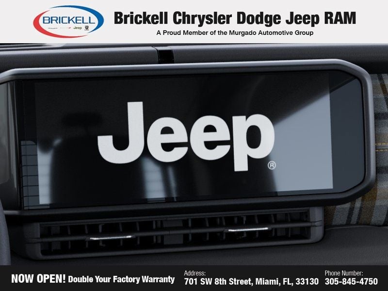 Price includes: $1000 - 2026 National Retail Bonus Cash . Exp. 04/30/2026 $1000 - 2026 National Stellantis Loyalty Bonus Cash . Exp. 04/30/2026 $500 - 2026 National 2026 Military Bonus Cash . Exp. 01/04/2027 Discover Your Next Vehicle at Brickell Chrysler Dodge Jeep Ram Welcome to Brickell CDJR, where we go beyond selling cars. We double the factory powertrain warranty, giving you added peace of mind. Our dealership offers one of the largest new car inventories in the region, ensuring you find the right vehicle Prices displayed do not included our Perma-plate. Our state-of-the-art service department is the largest in the country and is open seven days a week from 7 AM to 9 PM. Visit us at 701 SW 8th St, Miami, FL 33130, or call 305-777-2800 to learn more and schedule a test drive. The displayed price includes an incentive for financing with Brickell CDJR Finance Company. Outside financing and bank drafts are not accepted. All pre-owned vehicle exports are subject to an export fee. Prices apply only to customers who live, work, or worship in Broward, Miami-Dade, Palm Beach, Monroe, Collier, Hendry, Lee, Glades, Martin, St. Lucie, Okeechobee, Manatee, Hillsborough, Osceola, or Orange County. Customers outside these counties will pay an additional $ Taxes, title, registration, and dealer fees apply. Factory MSRP: $54,125 Black Clearcoat 2026 Jeep Wrangler 4WD 8-Speed Automatic 2.0L I4 DOHC