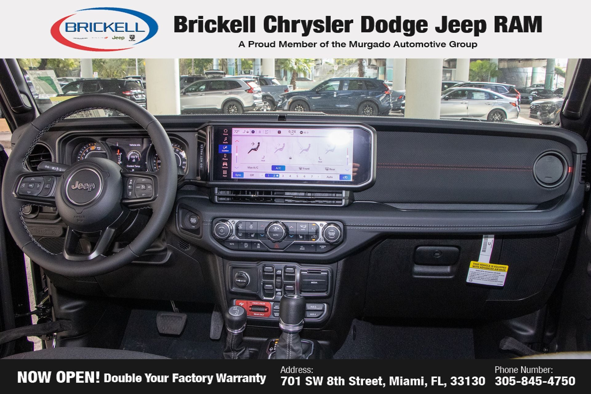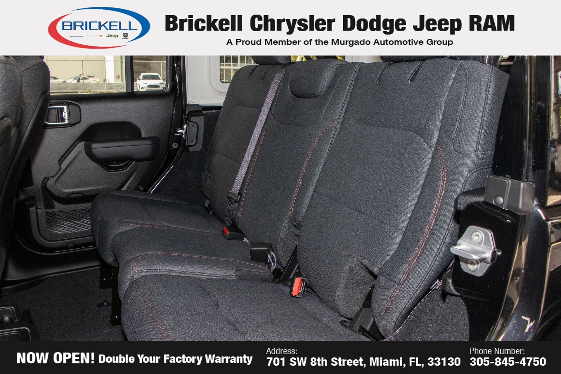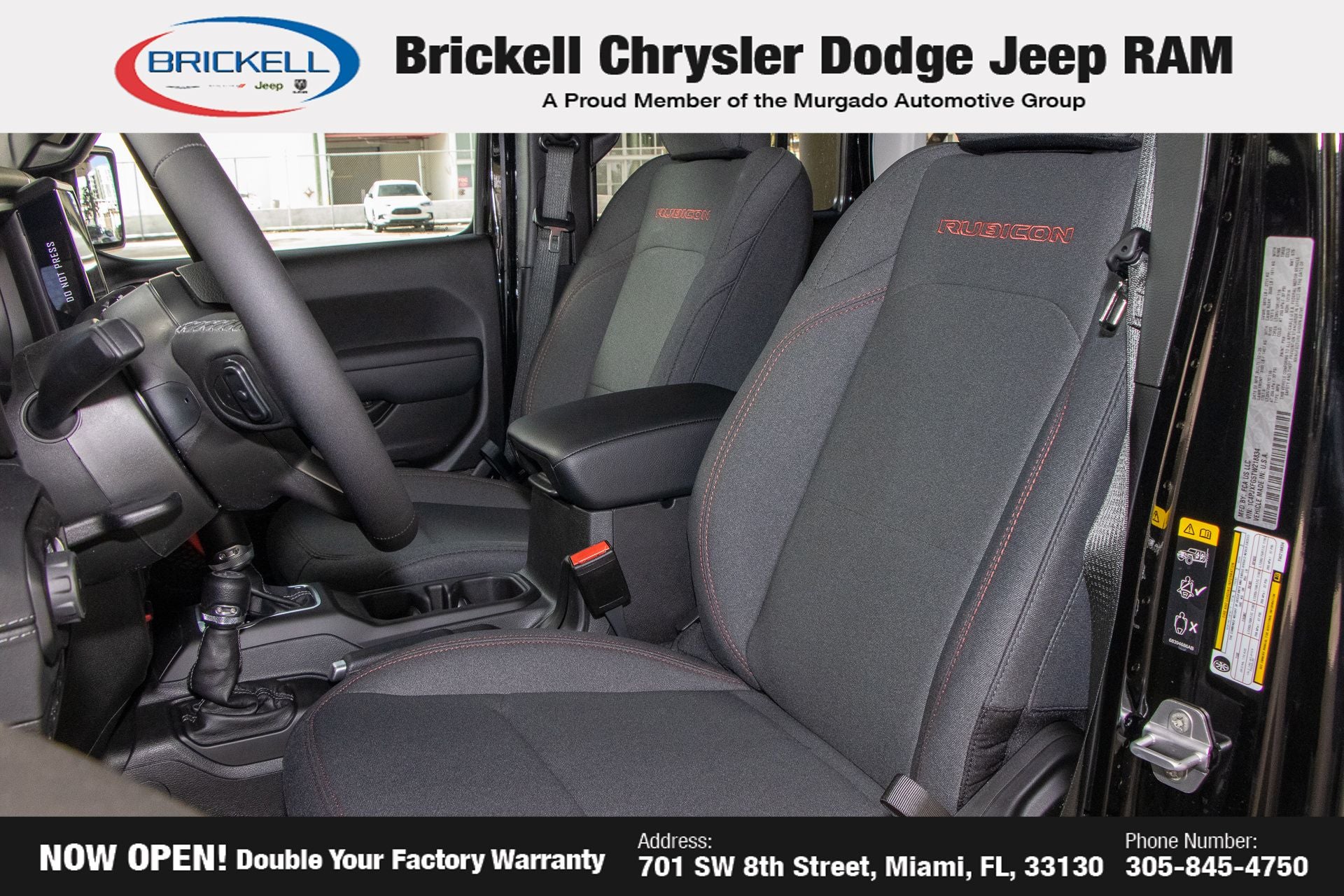 Price includes: $1000 - 2026 National Retail Bonus Cash . Exp. 04/30/2026 Discover Your Next Vehicle at Brickell Chrysler Dodge Jeep Ram Welcome to Brickell CDJR, where we go beyond selling cars. We double the factory powertrain warranty, giving you added peace of mind. Our dealership offers one of the largest new car inventories in the region, ensuring you find the right vehicle Prices displayed do not included our Perma-plate. Our state-of-the-art service department is the largest in the country and is open seven days a week from 7 AM to 9 PM. Visit us at 701 SW 8th St, Miami, FL 33130, or call 305-777-2800 to learn more and schedule a test drive. The displayed price includes an incentive for financing with Brickell CDJR Finance Company. Outside financing and bank drafts are not accepted. All pre-owned vehicle exports are subject to an export fee. Prices apply only to customers who live, work, or worship in Broward, Miami-Dade, Palm Beach, Monroe, Collier, Hendry, Lee, Glades, Martin, St. Lucie, Okeechobee, Manatee, Hillsborough, Osceola, or Orange County. Customers outside these counties will pay an additional $ Taxes, title, registration, and dealer fees apply. Factory MSRP: $57,580 black clearcoat 2026 Jeep Wrangler Rubicon 4WD 8-Speed Automatic 3.6L V6 24V VVT