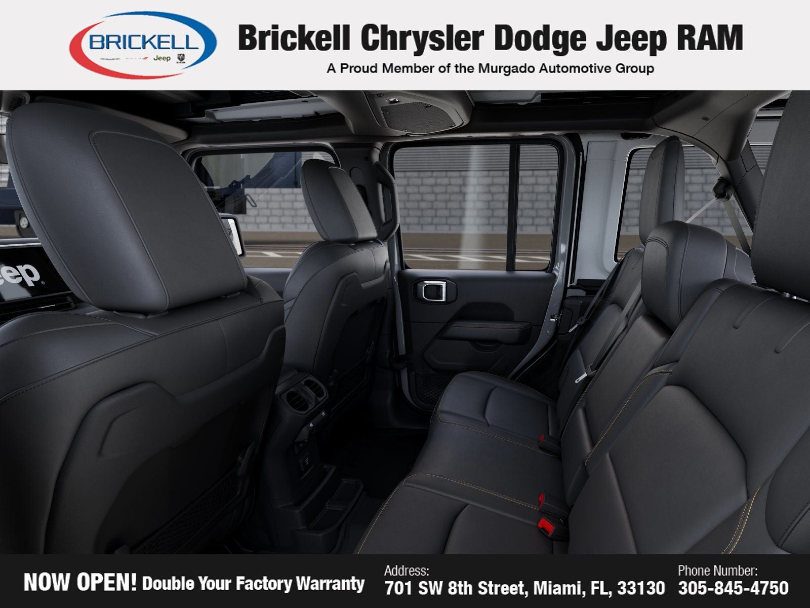 Price includes: $1000 - 2026 National Retail Bonus Cash . Exp. 04/30/2026 Discover Your Next Vehicle at Brickell Chrysler Dodge Jeep Ram Welcome to Brickell CDJR, where we go beyond selling cars. We double the factory powertrain warranty, giving you added peace of mind. Our dealership offers one of the largest new car inventories in the region, ensuring you find the right vehicle Prices displayed do not included our Perma-plate. Our state-of-the-art service department is the largest in the country and is open seven days a week from 7 AM to 9 PM. Visit us at 701 SW 8th St, Miami, FL 33130, or call 305-777-2800 to learn more and schedule a test drive. The displayed price includes an incentive for financing with Brickell CDJR Finance Company. Outside financing and bank drafts are not accepted. All pre-owned vehicle exports are subject to an export fee. Prices apply only to customers who live, work, or worship in Broward, Miami-Dade, Palm Beach, Monroe, Collier, Hendry, Lee, Glades, Martin, St. Lucie, Okeechobee, Manatee, Hillsborough, Osceola, or Orange County. Customers outside these counties will pay an additional $ Taxes, title, registration, and dealer fees apply. Factory MSRP: $57,460 Bright White Clearcoat 2026 Jeep Wrangler Sahara 4WD 8-Speed Automatic 2.0L I4 DOHC