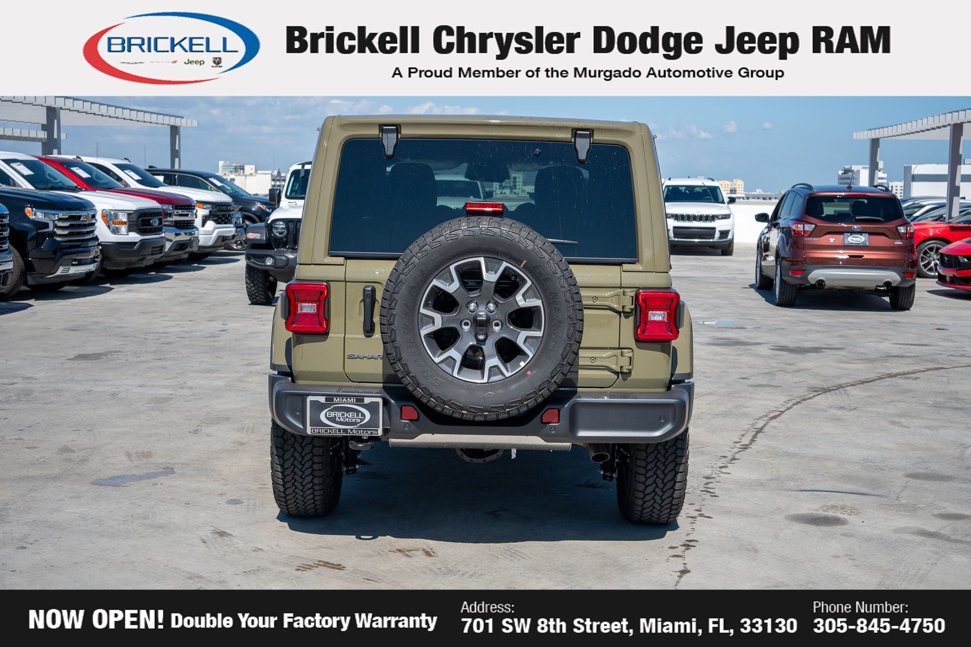 Price includes: $500 - 2026 National 2026 Military Bonus Cash . Exp. 01/04/2027 Discover Your Next Vehicle at Brickell Chrysler Dodge Jeep Ram Welcome to Brickell CDJR, where we go beyond selling cars. We double the factory powertrain warranty, giving you added peace of mind. Our dealership offers one of the largest new car inventories in the region, ensuring you find the right vehicle Prices displayed do not included our Perma-plate. Our state-of-the-art service department is the largest in the country and is open seven days a week from 7 AM to 9 PM. Visit us at 701 SW 8th St, Miami, FL 33130, or call 305-777-2800 to learn more and schedule a test drive. The displayed price includes an incentive for financing with Brickell CDJR Finance Company. Outside financing and bank drafts are not accepted. All pre-owned vehicle exports are subject to an export fee. Prices apply only to customers who live, work, or worship in Broward, Miami-Dade, Palm Beach, Monroe, Collier, Hendry, Lee, Glades, Martin, St. Lucie, Okeechobee, Manatee, Hillsborough, Osceola, or Orange County. Customers outside these counties will pay an additional $ Taxes, title, registration, and dealer fees apply. Factory MSRP: $57,315 41 2026 Jeep Wrangler Sahara 4WD 8-Speed Automatic 2.0L I4 DOHC