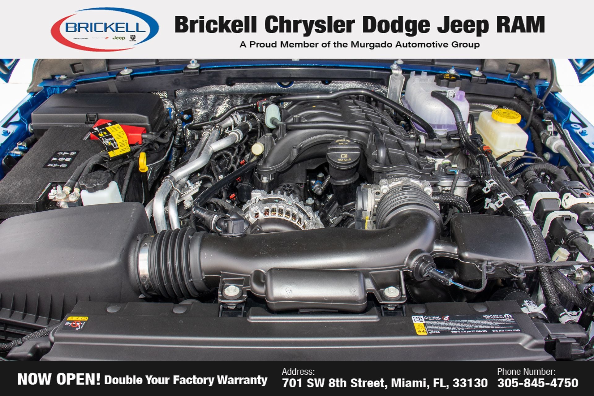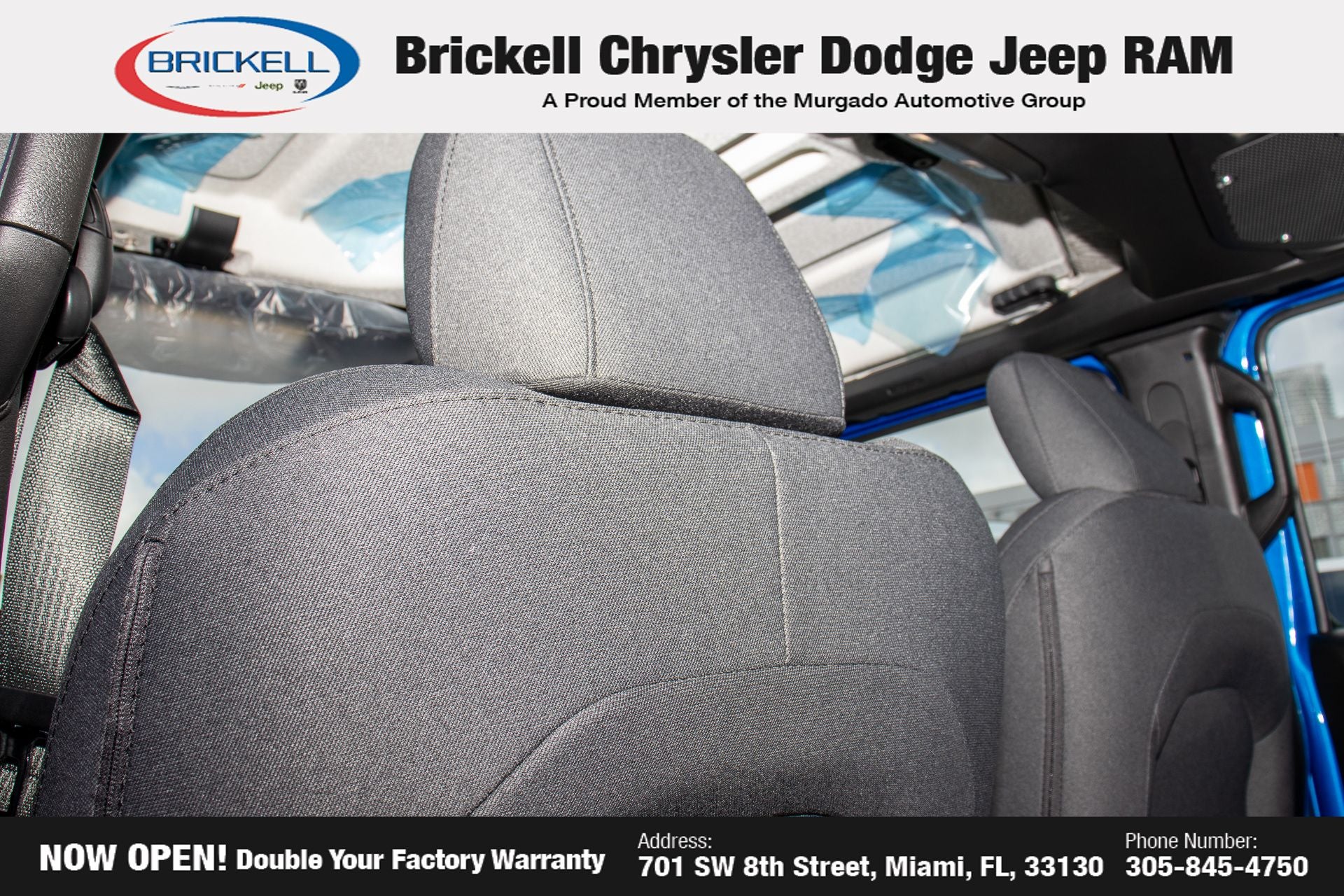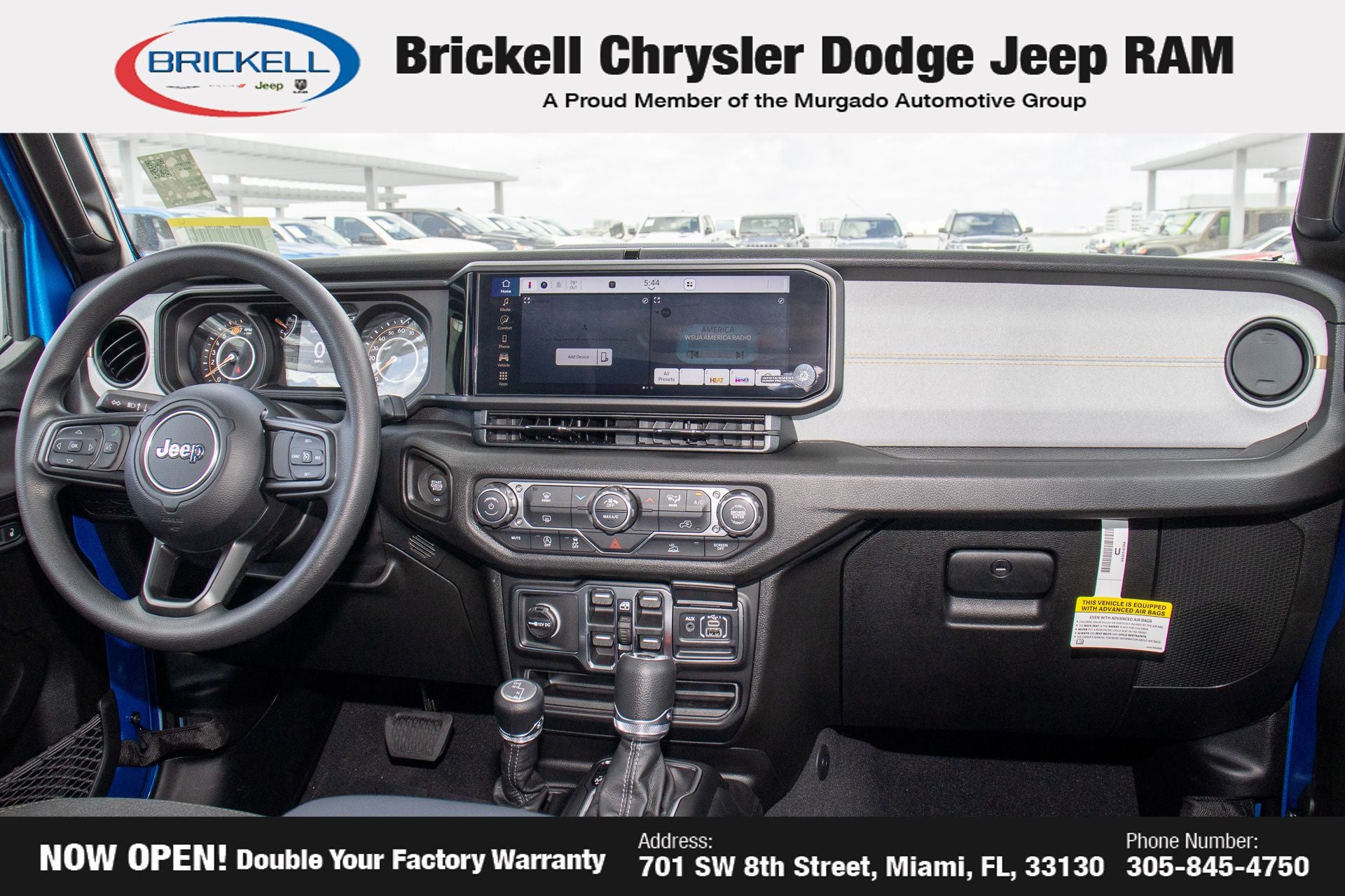 Price includes: $1000 - 2026 National Retail Bonus Cash . Exp. 04/30/2026 Discover Your Next Vehicle at Brickell Chrysler Dodge Jeep Ram Welcome to Brickell CDJR, where we go beyond selling cars. We double the factory powertrain warranty, giving you added peace of mind. Our dealership offers one of the largest new car inventories in the region, ensuring you find the right vehicle Prices displayed do not included our Perma-plate. Our state-of-the-art service department is the largest in the country and is open seven days a week from 7 AM to 9 PM. Visit us at 701 SW 8th St, Miami, FL 33130, or call 305-777-2800 to learn more and schedule a test drive. The displayed price includes an incentive for financing with Brickell CDJR Finance Company. Outside financing and bank drafts are not accepted. All pre-owned vehicle exports are subject to an export fee. Prices apply only to customers who live, work, or worship in Broward, Miami-Dade, Palm Beach, Monroe, Collier, Hendry, Lee, Glades, Martin, St. Lucie, Okeechobee, Manatee, Hillsborough, Osceola, or Orange County. Customers outside these counties will pay an additional $ Taxes, title, registration, and dealer fees apply. Factory MSRP: $45,490 Hydro Blue Pearl Coat 2026 Jeep Wrangler Sport 4WD 8-Speed Automatic 3.6L V6 24V VVT