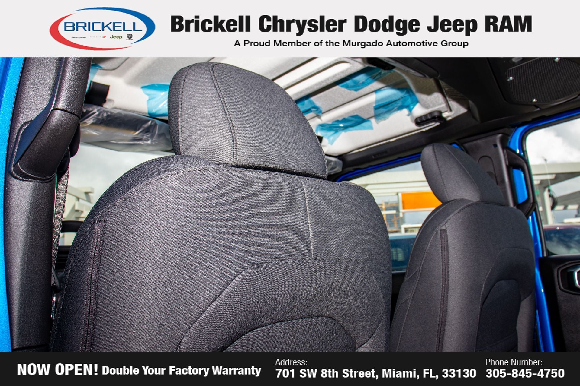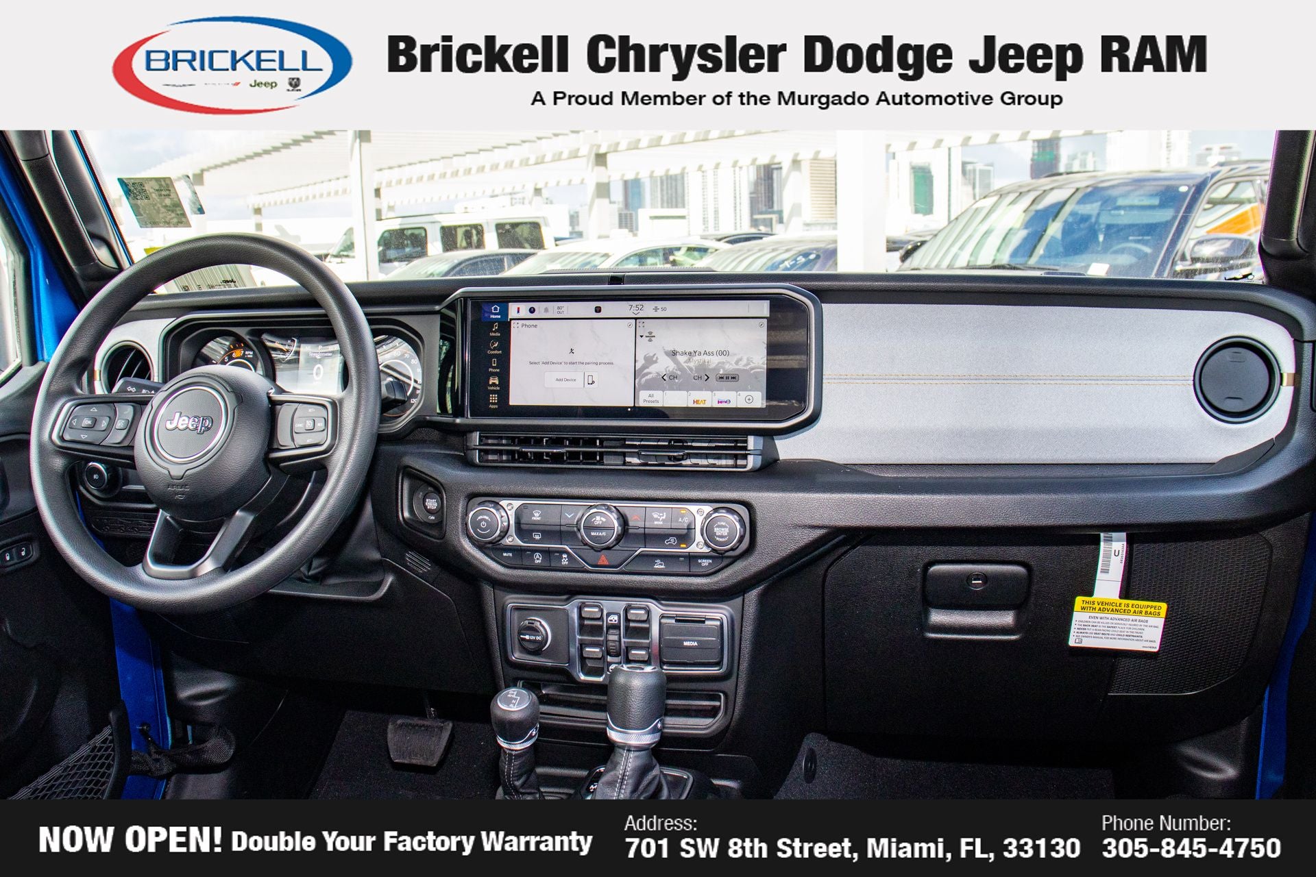 Price includes: $1000 - 2026 National Retail Bonus Cash . Exp. 04/30/2026 Discover Your Next Vehicle at Brickell Chrysler Dodge Jeep Ram Welcome to Brickell CDJR, where we go beyond selling cars. We double the factory powertrain warranty, giving you added peace of mind. Our dealership offers one of the largest new car inventories in the region, ensuring you find the right vehicle Prices displayed do not included our Perma-plate. Our state-of-the-art service department is the largest in the country and is open seven days a week from 7 AM to 9 PM. Visit us at 701 SW 8th St, Miami, FL 33130, or call 305-777-2800 to learn more and schedule a test drive. The displayed price includes an incentive for financing with Brickell CDJR Finance Company. Outside financing and bank drafts are not accepted. All pre-owned vehicle exports are subject to an export fee. Prices apply only to customers who live, work, or worship in Broward, Miami-Dade, Palm Beach, Monroe, Collier, Hendry, Lee, Glades, Martin, St. Lucie, Okeechobee, Manatee, Hillsborough, Osceola, or Orange County. Customers outside these counties will pay an additional $ Taxes, title, registration, and dealer fees apply. Factory MSRP: $44,990 Hydro Blue Pearl Coat 2026 Jeep Wrangler Sport 4WD 8-Speed Automatic 2.0L I4 DOHC