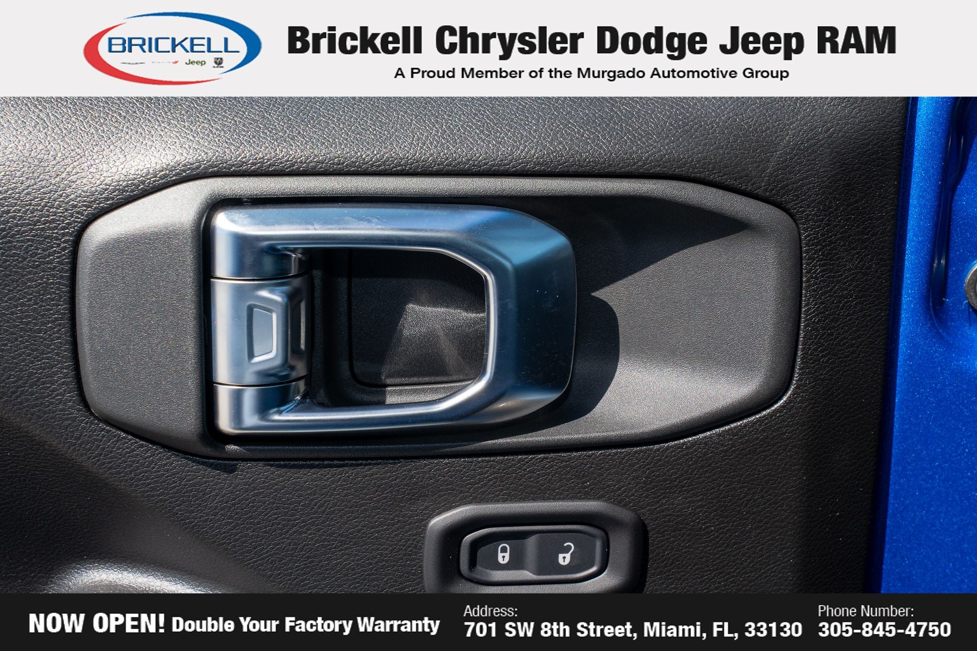 Price includes: $1000 - 2026 National Retail Bonus Cash . Exp. 04/30/2026 Discover Your Next Vehicle at Brickell Chrysler Dodge Jeep Ram Welcome to Brickell CDJR, where we go beyond selling cars. We double the factory powertrain warranty, giving you added peace of mind. Our dealership offers one of the largest new car inventories in the region, ensuring you find the right vehicle Prices displayed do not included our Perma-plate. Our state-of-the-art service department is the largest in the country and is open seven days a week from 7 AM to 9 PM. Visit us at 701 SW 8th St, Miami, FL 33130, or call 305-777-2800 to learn more and schedule a test drive. The displayed price includes an incentive for financing with Brickell CDJR Finance Company. Outside financing and bank drafts are not accepted. All pre-owned vehicle exports are subject to an export fee. Prices apply only to customers who live, work, or worship in Broward, Miami-Dade, Palm Beach, Monroe, Collier, Hendry, Lee, Glades, Martin, St. Lucie, Okeechobee, Manatee, Hillsborough, Osceola, or Orange County. Customers outside these counties will pay an additional $ Taxes, title, registration, and dealer fees apply. Factory MSRP: $42,670 Hydro Blue Pearl Coat 2026 Jeep Wrangler Sport 4WD 8-Speed Automatic 2.0L I4 DOHC