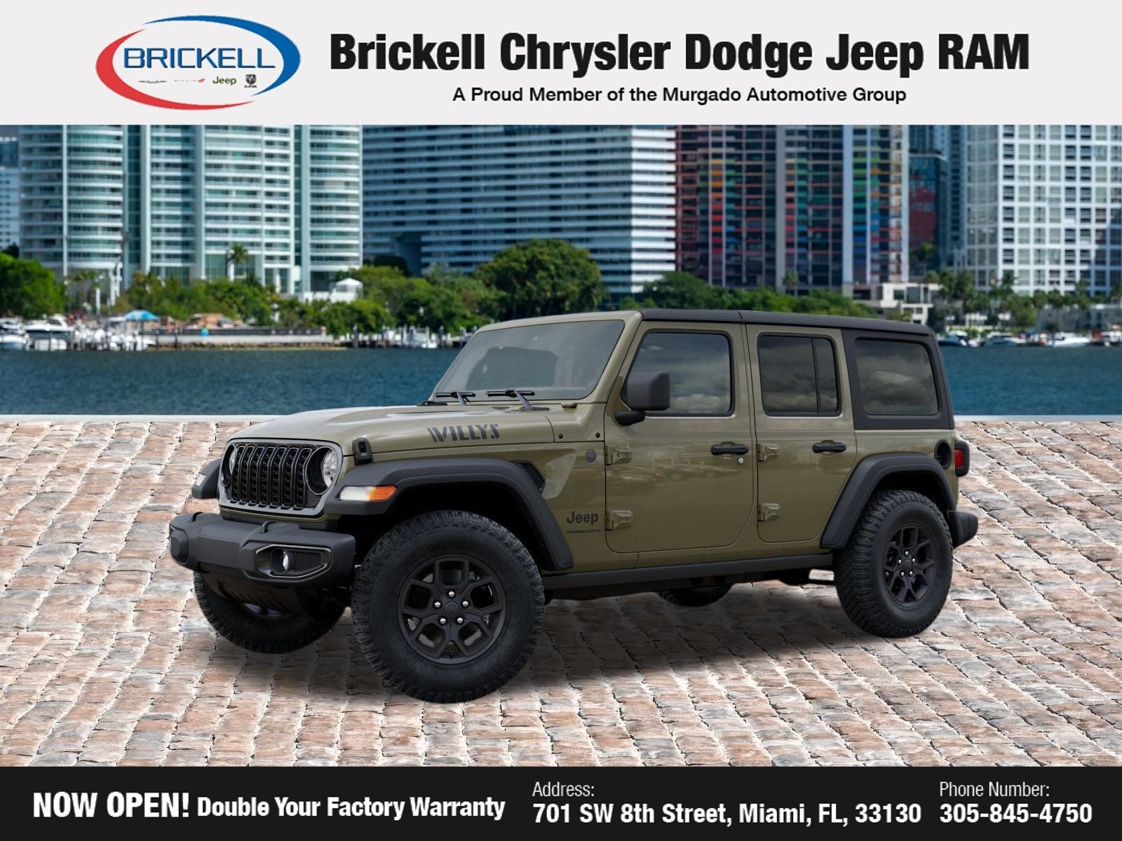 Price includes: $1000 - 2026 National Retail Bonus Cash . Exp. 04/30/2026 $1000 - 2026 National Stellantis Loyalty Bonus Cash . Exp. 04/30/2026 $500 - 2026 National 2026 Military Bonus Cash . Exp. 01/04/2027 Discover Your Next Vehicle at Brickell Chrysler Dodge Jeep Ram Welcome to Brickell CDJR, where we go beyond selling cars. We double the factory powertrain warranty, giving you added peace of mind. Our dealership offers one of the largest new car inventories in the region, ensuring you find the right vehicle Prices displayed do not included our Perma-plate. Our state-of-the-art service department is the largest in the country and is open seven days a week from 7 AM to 9 PM. Visit us at 701 SW 8th St, Miami, FL 33130, or call 305-777-2800 to learn more and schedule a test drive. The displayed price includes an incentive for financing with Brickell CDJR Finance Company. Outside financing and bank drafts are not accepted. All pre-owned vehicle exports are subject to an export fee. Prices apply only to customers who live, work, or worship in Broward, Miami-Dade, Palm Beach, Monroe, Collier, Hendry, Lee, Glades, Martin, St. Lucie, Okeechobee, Manatee, Hillsborough, Osceola, or Orange County. Customers outside these counties will pay an additional $ Taxes, title, registration, and dealer fees apply. Factory MSRP: $52,680 41 2026 Jeep Wrangler Willys 4WD 8-Speed Automatic 3.6L V6 24V VVT