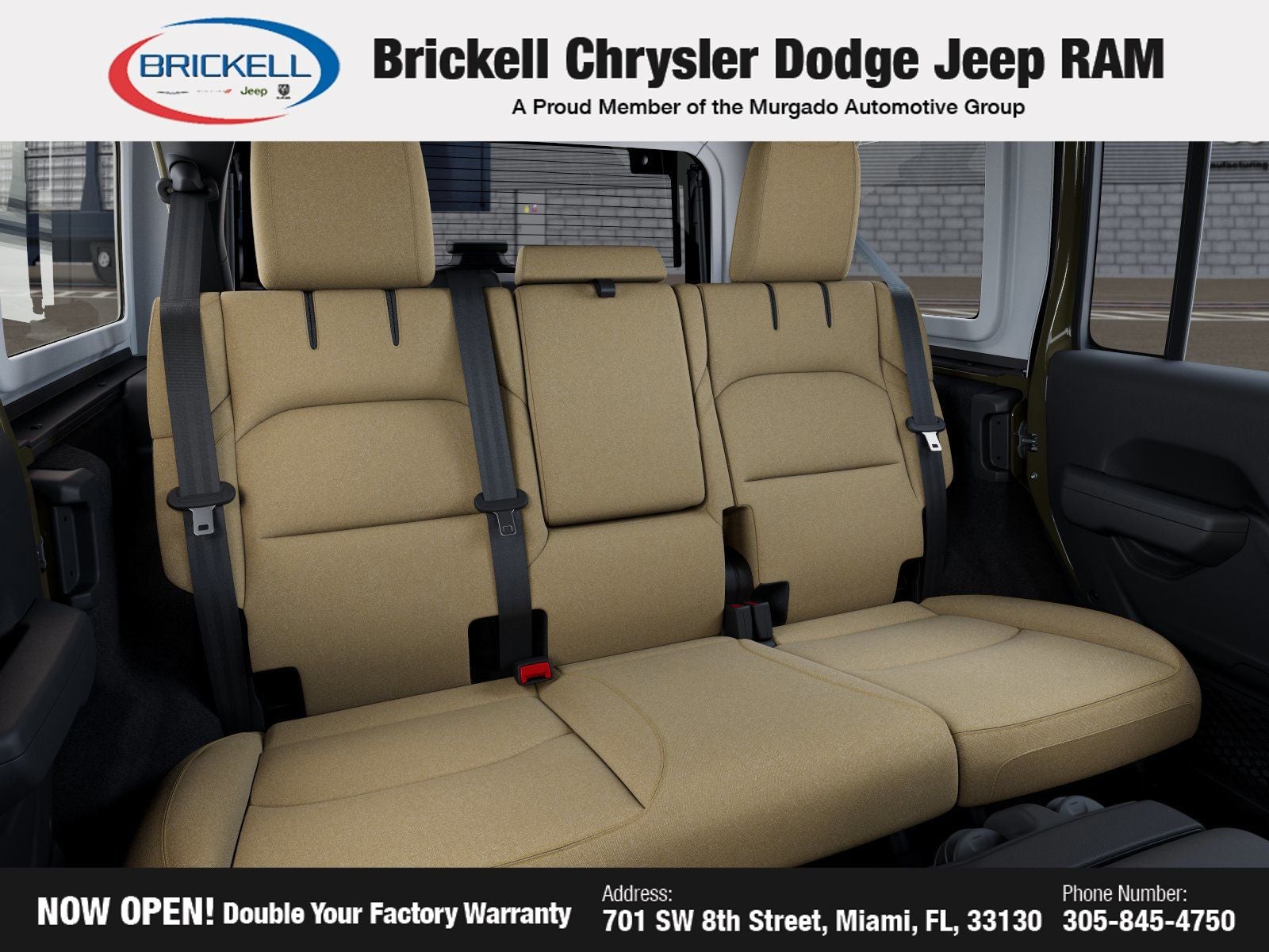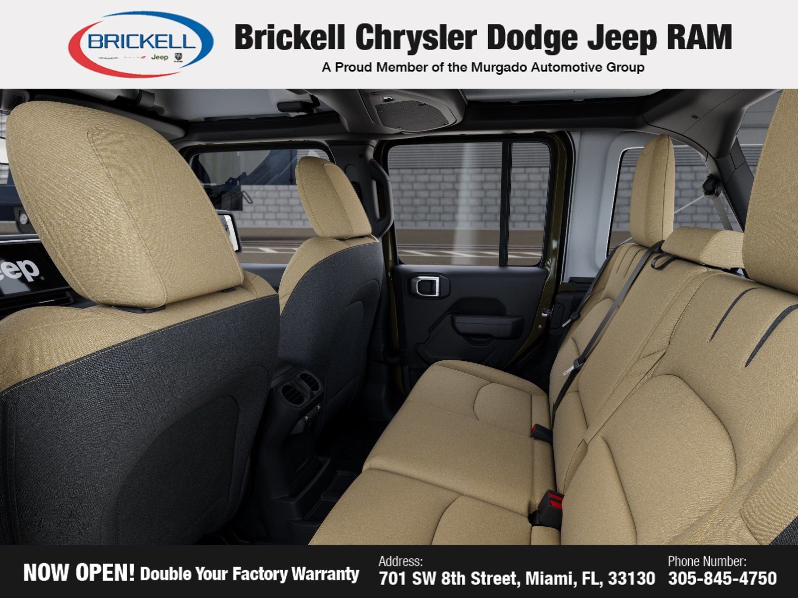 Price includes: $1000 - 2026 National Retail Bonus Cash . Exp. 04/30/2026 Discover Your Next Vehicle at Brickell Chrysler Dodge Jeep Ram Welcome to Brickell CDJR, where we go beyond selling cars. We double the factory powertrain warranty, giving you added peace of mind. Our dealership offers one of the largest new car inventories in the region, ensuring you find the right vehicle Prices displayed do not included our Perma-plate. Our state-of-the-art service department is the largest in the country and is open seven days a week from 7 AM to 9 PM. Visit us at 701 SW 8th St, Miami, FL 33130, or call 305-777-2800 to learn more and schedule a test drive. The displayed price includes an incentive for financing with Brickell CDJR Finance Company. Outside financing and bank drafts are not accepted. All pre-owned vehicle exports are subject to an export fee. Prices apply only to customers who live, work, or worship in Broward, Miami-Dade, Palm Beach, Monroe, Collier, Hendry, Lee, Glades, Martin, St. Lucie, Okeechobee, Manatee, Hillsborough, Osceola, or Orange County. Customers outside these counties will pay an additional $ Taxes, title, registration, and dealer fees apply. Factory MSRP: $54,680 41 2026 Jeep Wrangler Willys 4WD 8-Speed Automatic 2.0L I4 DOHC
