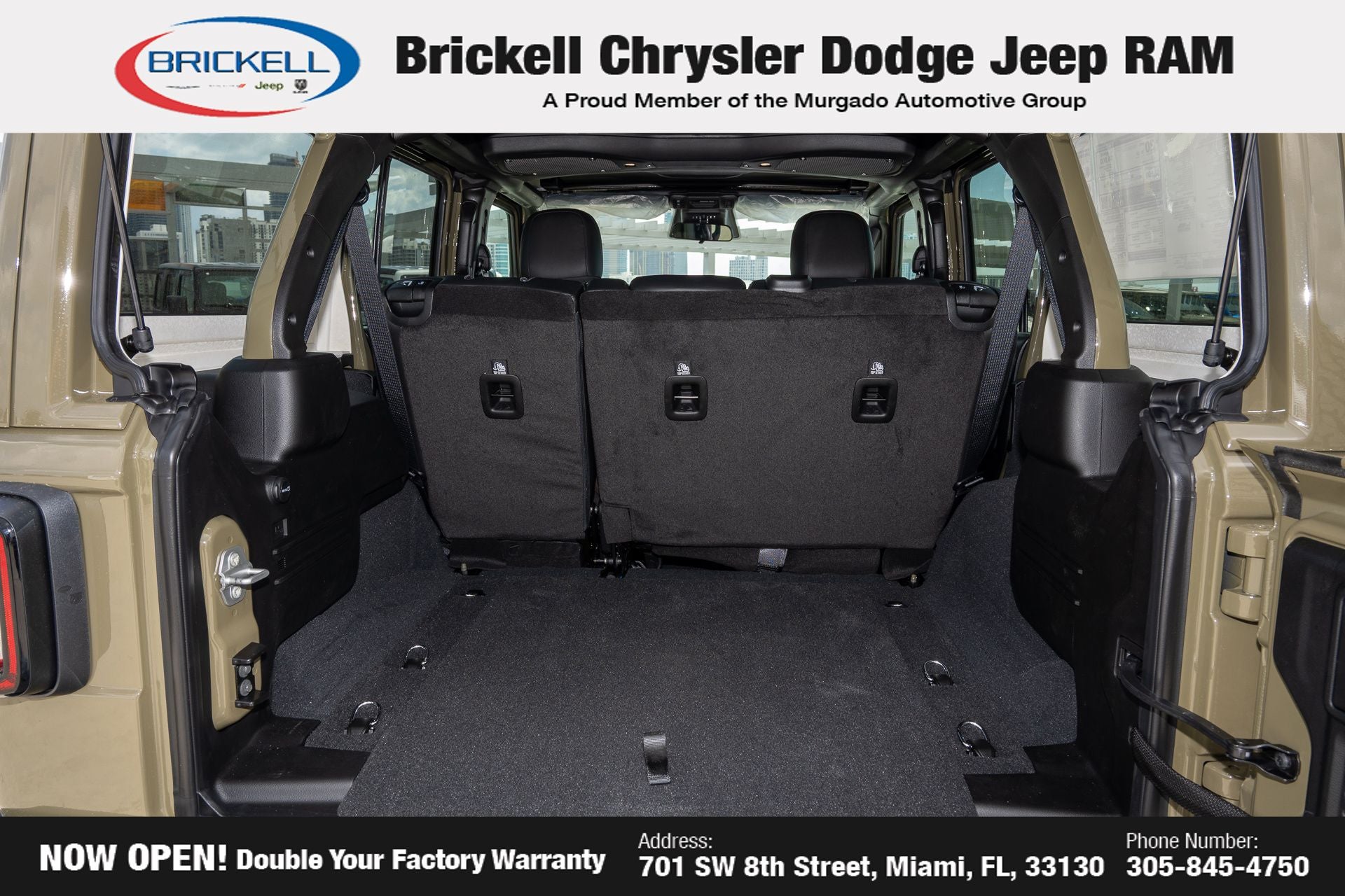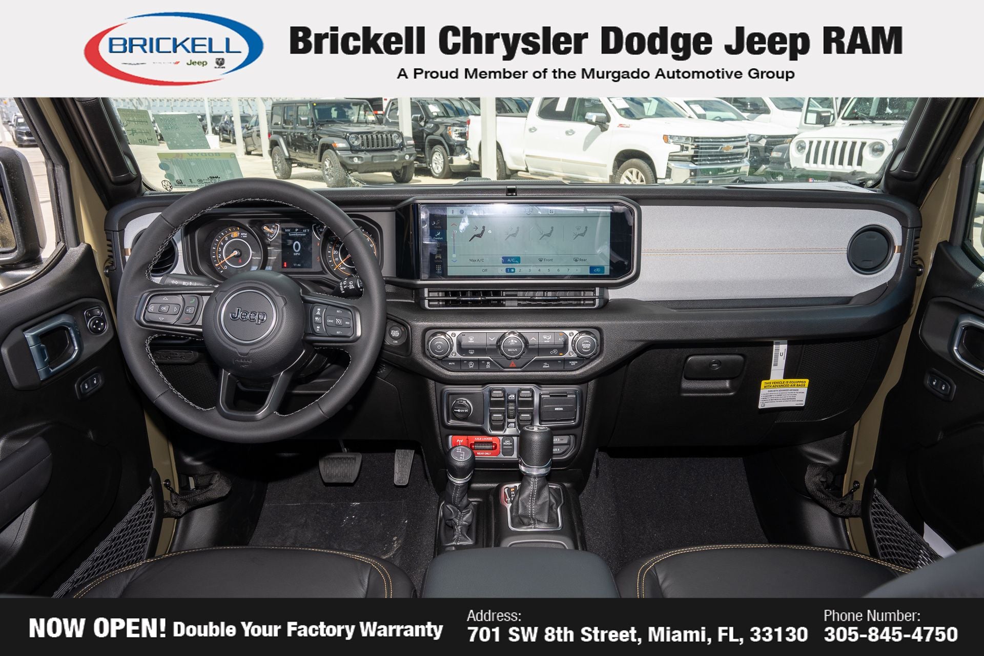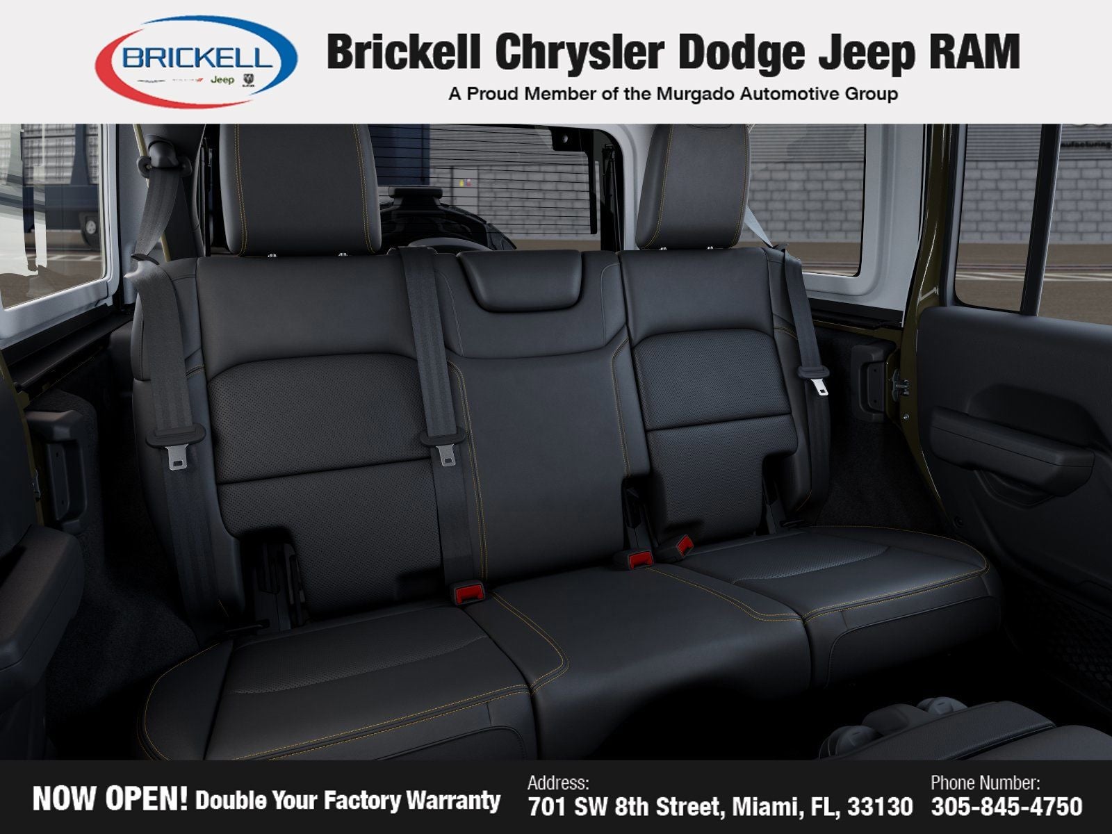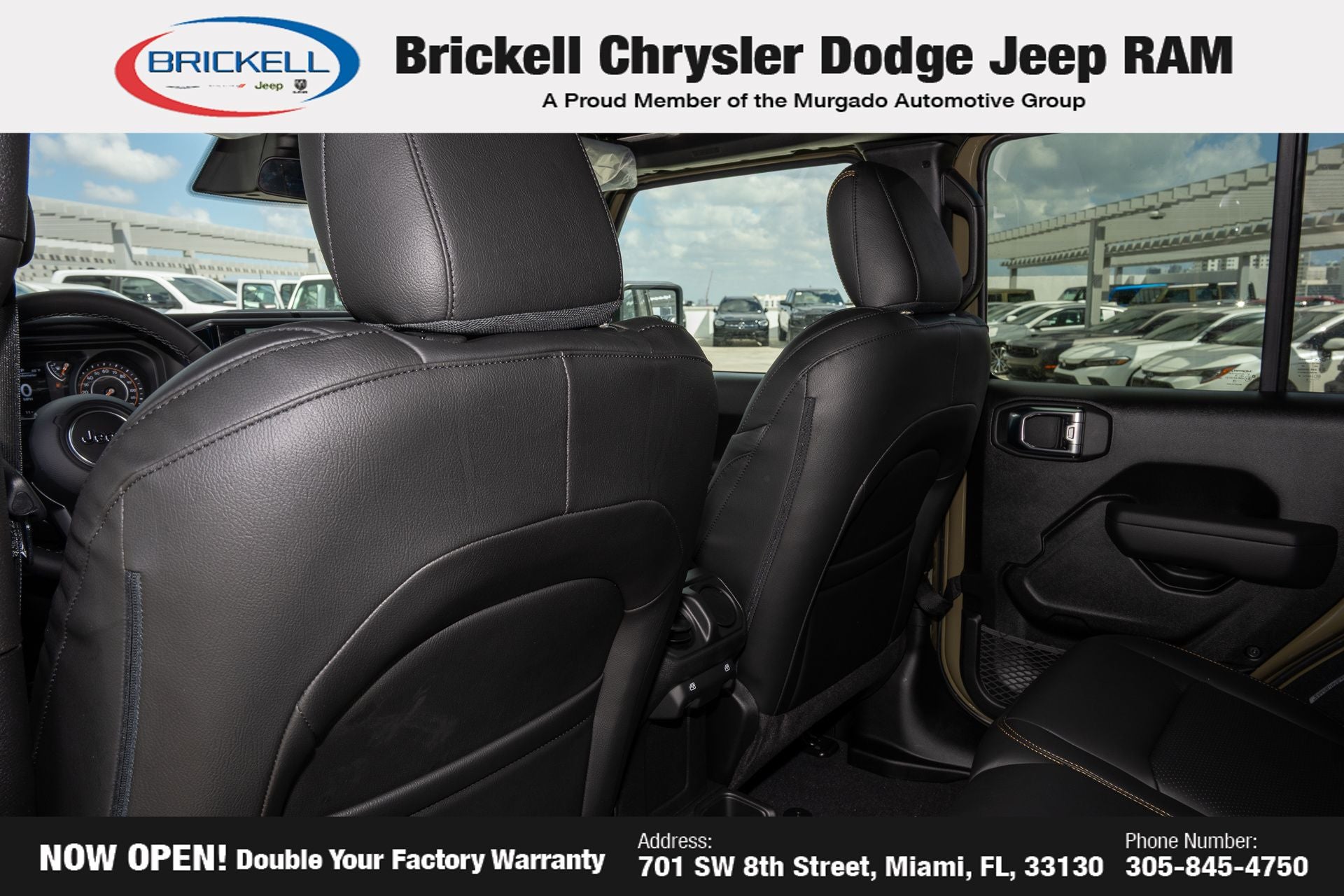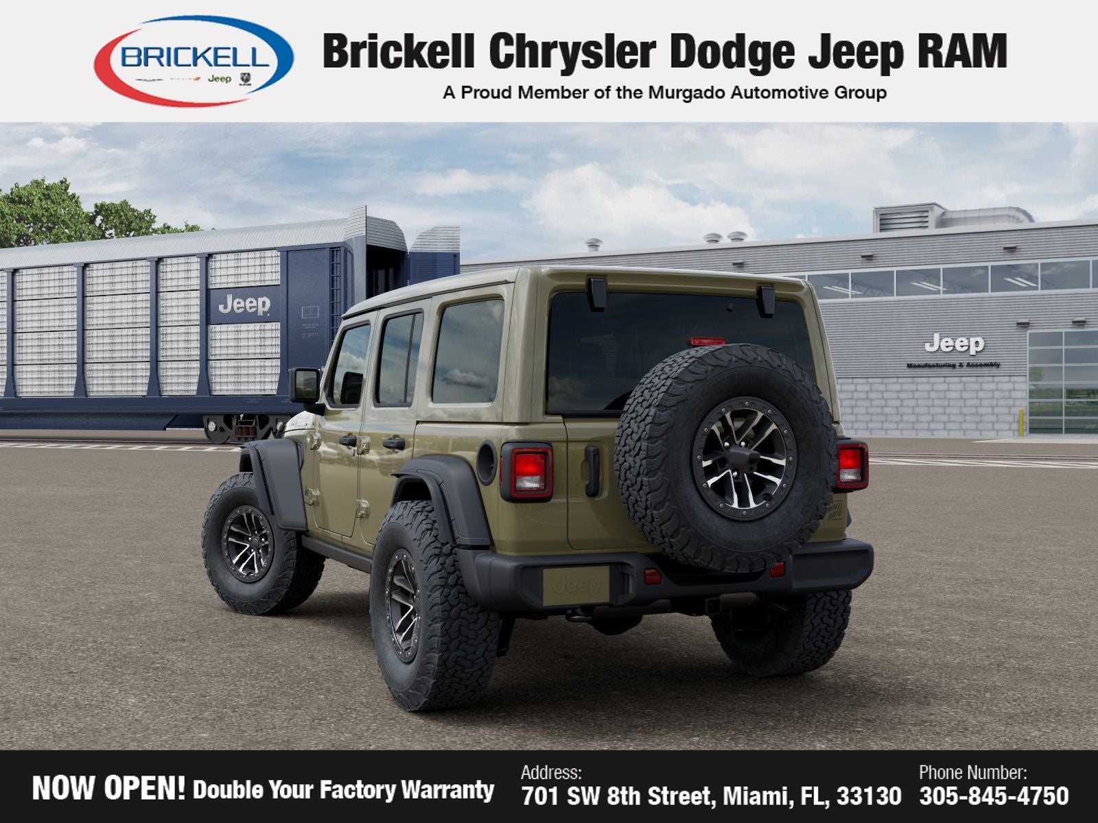 Price includes: $1000 - 2026 National Retail Bonus Cash . Exp. 03/31/2026 $1000 - 2026 National Stellantis Loyalty Bonus Cash . Exp. 03/31/2026 $500 - 2026 National 2026 Military Bonus Cash . Exp. 01/04/2027 Discover Your Next Vehicle at Brickell Chrysler Dodge Jeep Ram Welcome to Brickell CDJR, where we go beyond selling cars. We double the factory powertrain warranty, giving you added peace of mind. Our dealership offers one of the largest new car inventories in the region, ensuring you find the right vehicle Prices displayed do not included our Perma-plate. Our state-of-the-art service department is the largest in the country and is open seven days a week from 7 AM to 9 PM. Visit us at 701 SW 8th St, Miami, FL 33130, or call 305-777-2800 to learn more and schedule a test drive. The displayed price includes an incentive for financing with Brickell CDJR Finance Company. Outside financing and bank drafts are not accepted. All pre-owned vehicle exports are subject to an export fee. Prices apply only to customers who live, work, or worship in Broward, Miami-Dade, Palm Beach, Monroe, Collier, Hendry, Lee, Glades, Martin, St. Lucie, Okeechobee, Manatee, Hillsborough, Osceola, or Orange County. Customers outside these counties will pay an additional $ Taxes, title, registration, and dealer fees apply. Factory MSRP: $58,075 41 2026 Jeep Wrangler Willys 4WD 8-Speed Automatic 3.6L V6 24V VVT