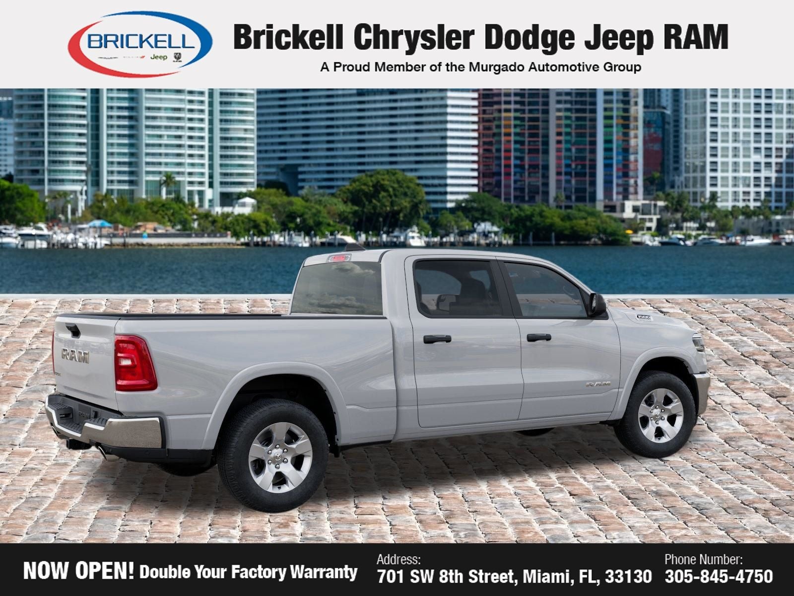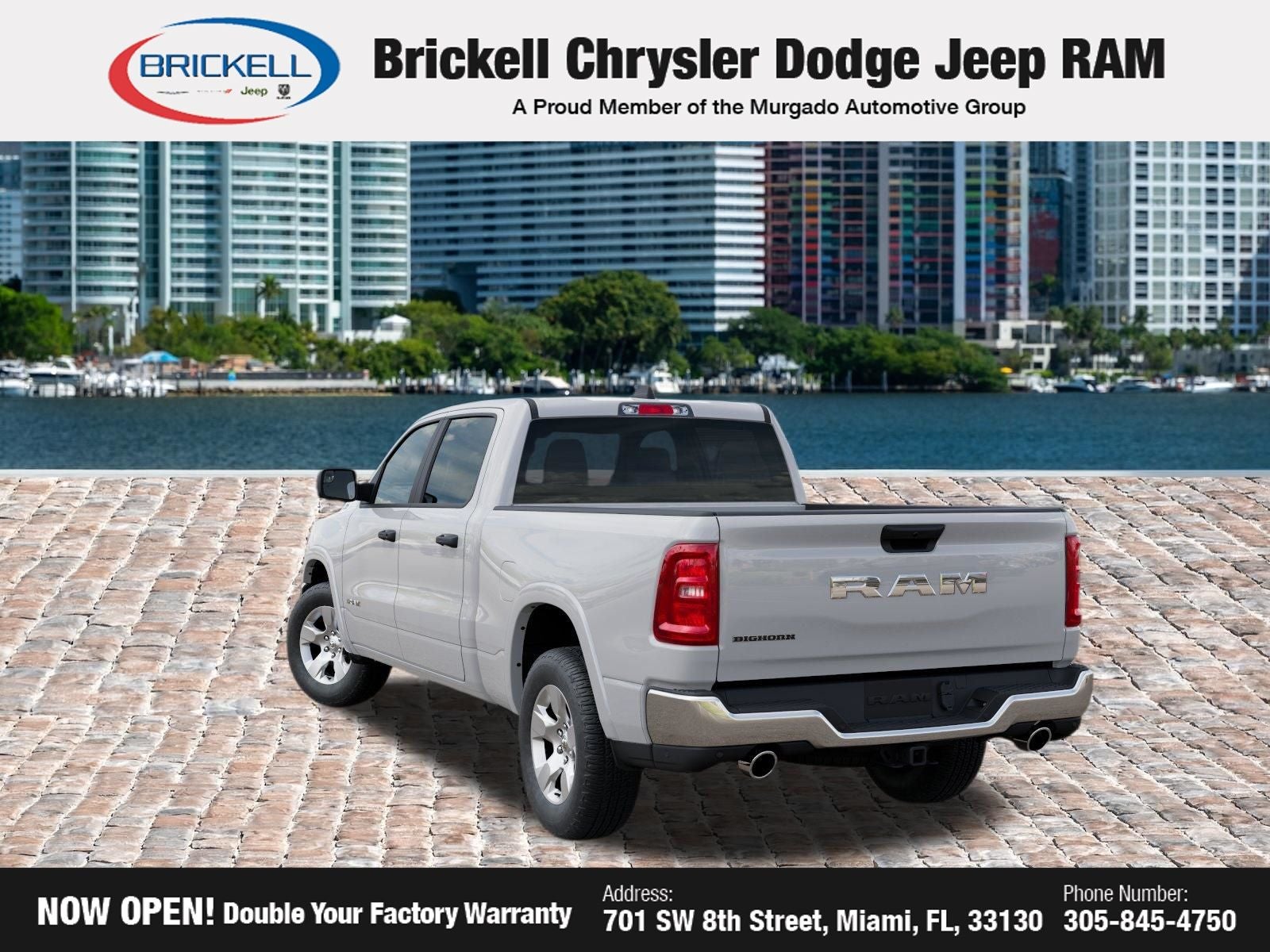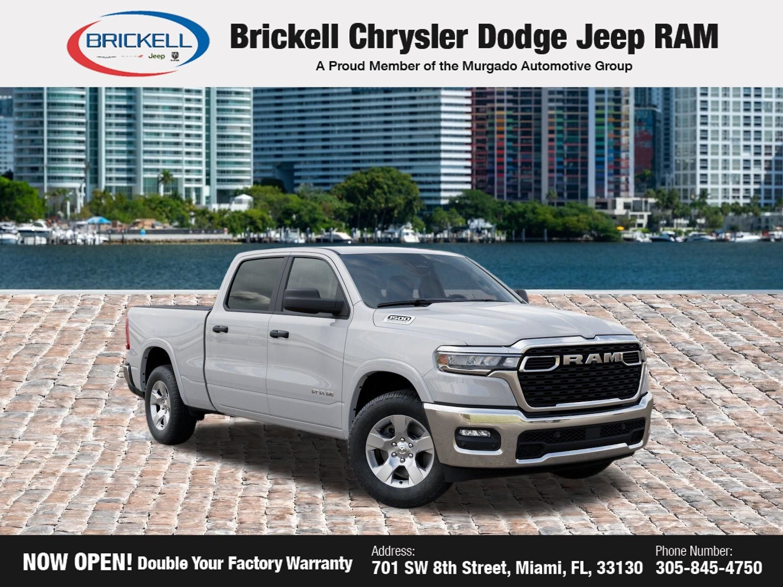 Price includes: $1000 - 2026 Southeast BC Retail Bonus Cash. Exp. 04/30/2026 $3500 - 2026 National Retail Bonus Cash . Exp. 04/30/2026 Discover Your Next Vehicle at Brickell Chrysler Dodge Jeep Ram Welcome to Brickell CDJR, where we go beyond selling cars. We double the factory powertrain warranty, giving you added peace of mind. Our dealership offers one of the largest new car inventories in the region, ensuring you find the right vehicle Prices displayed do not included our Perma-plate. Our state-of-the-art service department is the largest in the country and is open seven days a week from 7 AM to 9 PM. Visit us at 701 SW 8th St, Miami, FL 33130, or call 305-777-2800 to learn more and schedule a test drive. The displayed price includes an incentive for financing with Brickell CDJR Finance Company. Outside financing and bank drafts are not accepted. All pre-owned vehicle exports are subject to an export fee. Prices apply only to customers who live, work, or worship in Broward, Miami-Dade, Palm Beach, Monroe, Collier, Hendry, Lee, Glades, Martin, St. Lucie, Okeechobee, Manatee, Hillsborough, Osceola, or Orange County. Customers outside these counties will pay an additional $ Taxes, title, registration, and dealer fees apply. Factory MSRP: $55,960 Bright White Clearcoat 2026 Ram 1500 Big Horn/Lone Star RWD 8-Speed Automatic 3.0L I6