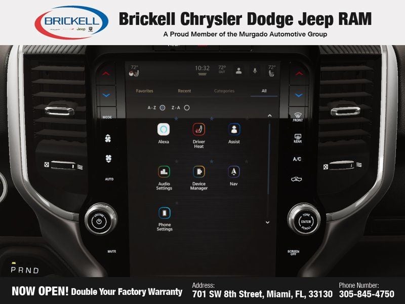 Price includes: $1000 - 2026 Southeast BC Retail Bonus Cash. Exp. 04/30/2026 $3500 - 2026 National Retail Bonus Cash . Exp. 04/30/2026 Discover Your Next Vehicle at Brickell Chrysler Dodge Jeep Ram Welcome to Brickell CDJR, where we go beyond selling cars. We double the factory powertrain warranty, giving you added peace of mind. Our dealership offers one of the largest new car inventories in the region, ensuring you find the right vehicle Prices displayed do not included our Perma-plate. Our state-of-the-art service department is the largest in the country and is open seven days a week from 7 AM to 9 PM. Visit us at 701 SW 8th St, Miami, FL 33130, or call 305-777-2800 to learn more and schedule a test drive. The displayed price includes an incentive for financing with Brickell CDJR Finance Company. Outside financing and bank drafts are not accepted. All pre-owned vehicle exports are subject to an export fee. Prices apply only to customers who live, work, or worship in Broward, Miami-Dade, Palm Beach, Monroe, Collier, Hendry, Lee, Glades, Martin, St. Lucie, Okeechobee, Manatee, Hillsborough, Osceola, or Orange County. Customers outside these counties will pay an additional $ Taxes, title, registration, and dealer fees apply. Factory MSRP: $63,770 Forged Blue Metallic 2026 Ram 1500 Big Horn/Lone Star 4WD 8-Speed Automatic 3.0L I6