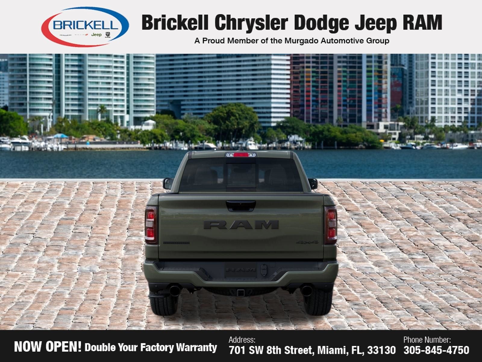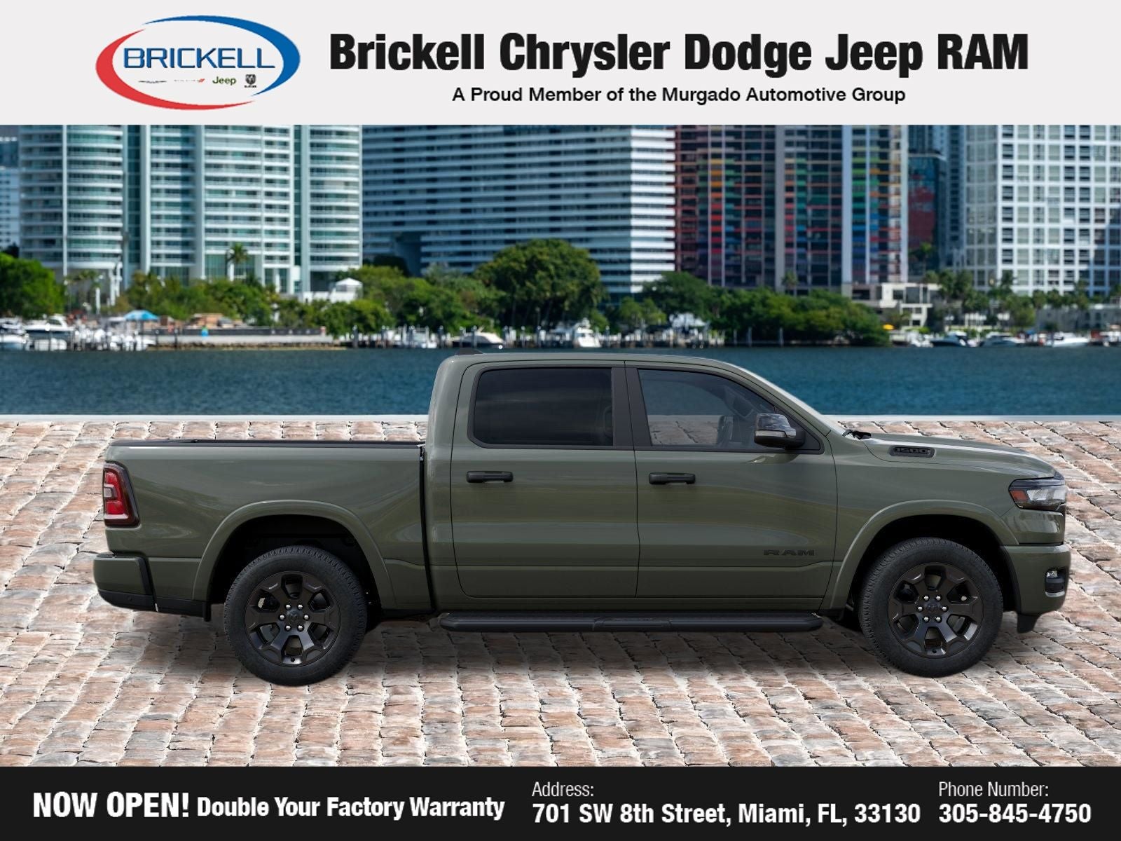 Price includes: $1000 - 2026 Southeast BC Retail Bonus Cash. Exp. 04/30/2026 $3500 - 2026 National Retail Bonus Cash . Exp. 04/30/2026 Discover Your Next Vehicle at Brickell Chrysler Dodge Jeep Ram Welcome to Brickell CDJR, where we go beyond selling cars. We double the factory powertrain warranty, giving you added peace of mind. Our dealership offers one of the largest new car inventories in the region, ensuring you find the right vehicle Prices displayed do not included our Perma-plate. Our state-of-the-art service department is the largest in the country and is open seven days a week from 7 AM to 9 PM. Visit us at 701 SW 8th St, Miami, FL 33130, or call 305-777-2800 to learn more and schedule a test drive. The displayed price includes an incentive for financing with Brickell CDJR Finance Company. Outside financing and bank drafts are not accepted. All pre-owned vehicle exports are subject to an export fee. Prices apply only to customers who live, work, or worship in Broward, Miami-Dade, Palm Beach, Monroe, Collier, Hendry, Lee, Glades, Martin, St. Lucie, Okeechobee, Manatee, Hillsborough, Osceola, or Orange County. Customers outside these counties will pay an additional $ Taxes, title, registration, and dealer fees apply. Factory MSRP: $65,230 Canyon Lake 2026 Ram 1500 Big Horn/Lone Star 4WD 8-Speed Automatic 3.0L I6