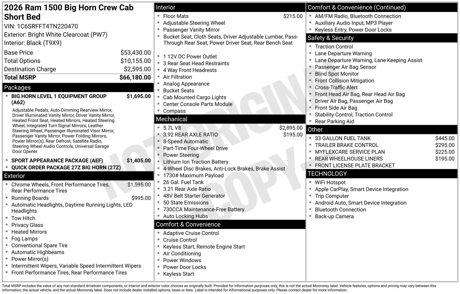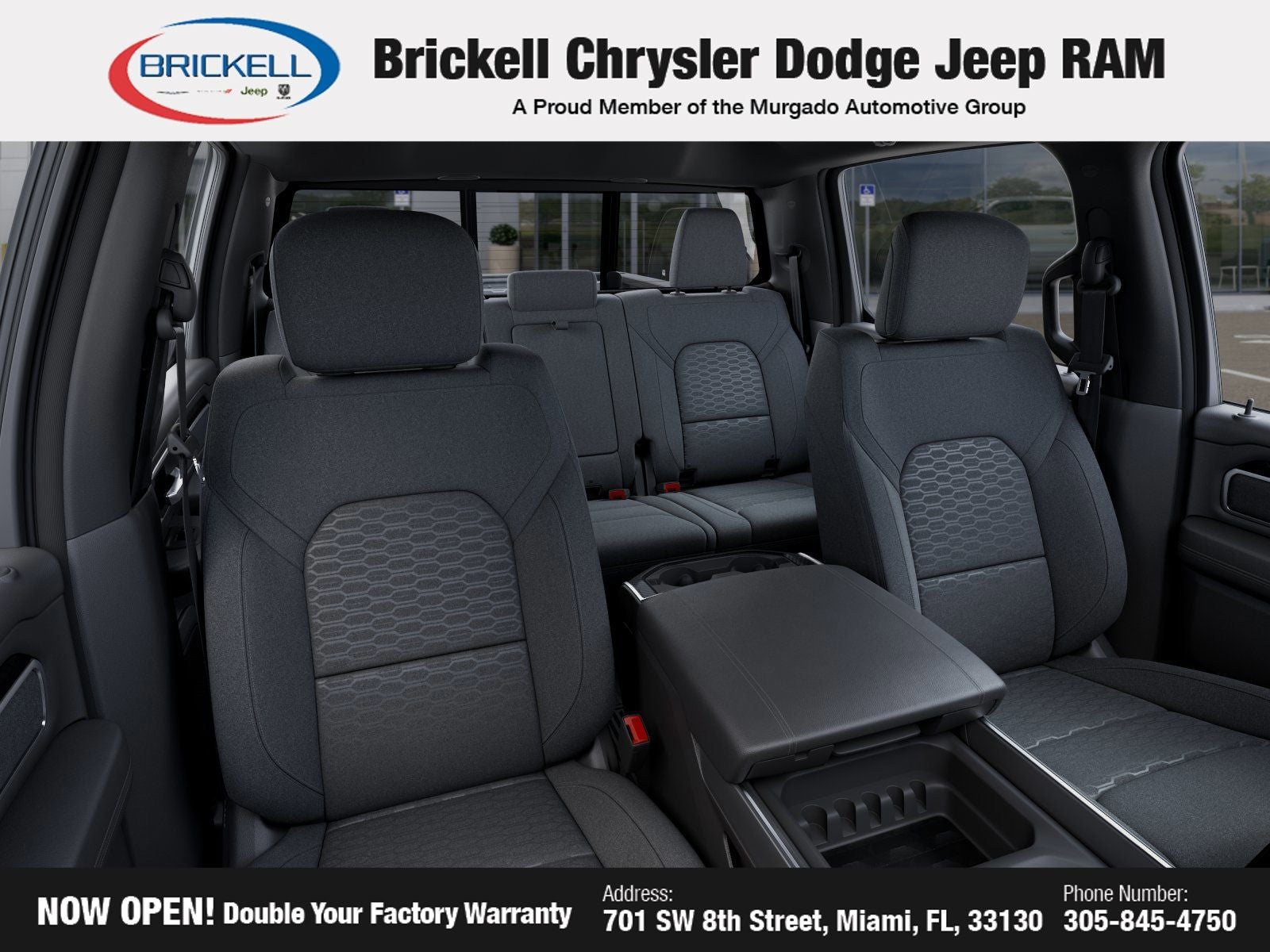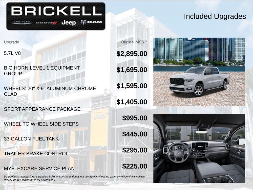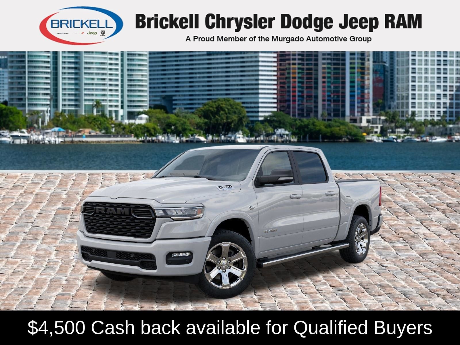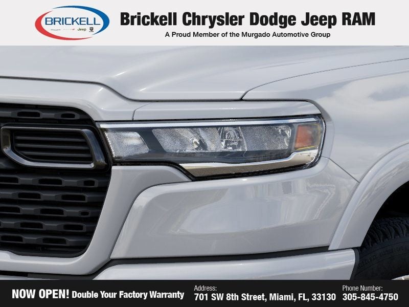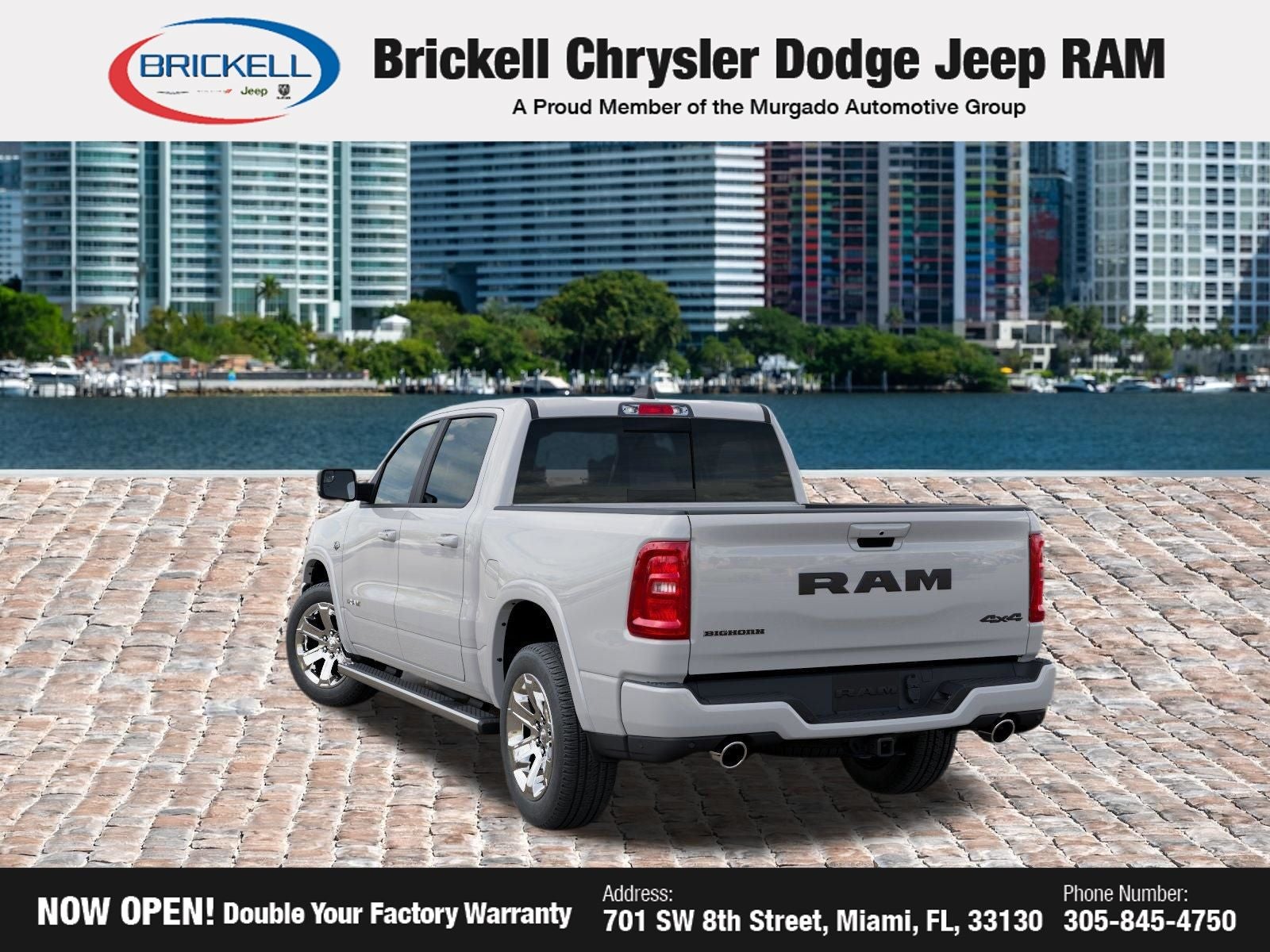 Price includes: $1000 - 2026 Southeast BC Retail Bonus Cash. Exp. 04/30/2026 $3500 - 2026 National Retail Bonus Cash . Exp. 04/30/2026 Discover Your Next Vehicle at Brickell Chrysler Dodge Jeep Ram Welcome to Brickell CDJR, where we go beyond selling cars. We double the factory powertrain warranty, giving you added peace of mind. Our dealership offers one of the largest new car inventories in the region, ensuring you find the right vehicle Prices displayed do not included our Perma-plate. Our state-of-the-art service department is the largest in the country and is open seven days a week from 7 AM to 9 PM. Visit us at 701 SW 8th St, Miami, FL 33130, or call 305-777-2800 to learn more and schedule a test drive. The displayed price includes an incentive for financing with Brickell CDJR Finance Company. Outside financing and bank drafts are not accepted. All pre-owned vehicle exports are subject to an export fee. Prices apply only to customers who live, work, or worship in Broward, Miami-Dade, Palm Beach, Monroe, Collier, Hendry, Lee, Glades, Martin, St. Lucie, Okeechobee, Manatee, Hillsborough, Osceola, or Orange County. Customers outside these counties will pay an additional $ Taxes, title, registration, and dealer fees apply. Factory MSRP: $64,090 Bright White Clearcoat 2026 Ram 1500 Big Horn/Lone Star 4WD 8-Speed Automatic HEMI 5.7L V8 Multi Displacement VVT eTorque