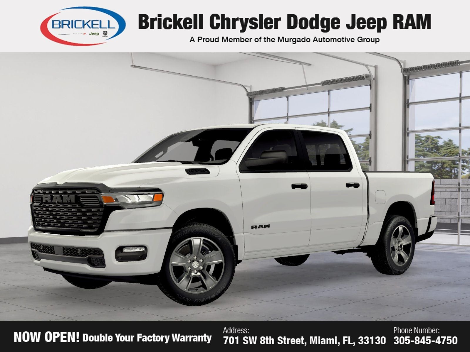 Price includes: $3500 - 2026 National Retail Consumer Cash . Exp. 03/02/2026 $500 - 2026 National 2026 Military Bonus Cash . Exp. 01/04/2027 Discover Your Next Vehicle at Brickell Chrysler Dodge Jeep Ram Welcome to Brickell CDJR, where we go beyond selling cars. We double the factory powertrain warranty, giving you added peace of mind. Our dealership offers one of the largest new car inventories in the region, ensuring you find the right vehicle Prices displayed do not included our Perma-plate. Our state-of-the-art service department is the largest in the country and is open seven days a week from 7 AM to 9 PM. Visit us at 701 SW 8th St, Miami, FL 33130, or call 305-777-2800 to learn more and schedule a test drive. The displayed price includes an incentive for financing with Brickell CDJR Finance Company. Outside financing and bank drafts are not accepted. All pre-owned vehicle exports are subject to an export fee. Prices apply only to customers who live, work, or worship in Broward, Miami-Dade, Palm Beach, Monroe, Collier, Hendry, Lee, Glades, Martin, St. Lucie, Okeechobee, Manatee, Hillsborough, Osceola, or Orange County. Customers outside these counties will pay an additional $ Taxes, title, registration, and dealer fees apply. Factory MSRP: $51,425 Bright White Clearcoat 2026 Ram 1500 Express RWD 8-Speed Automatic 3.0L I6