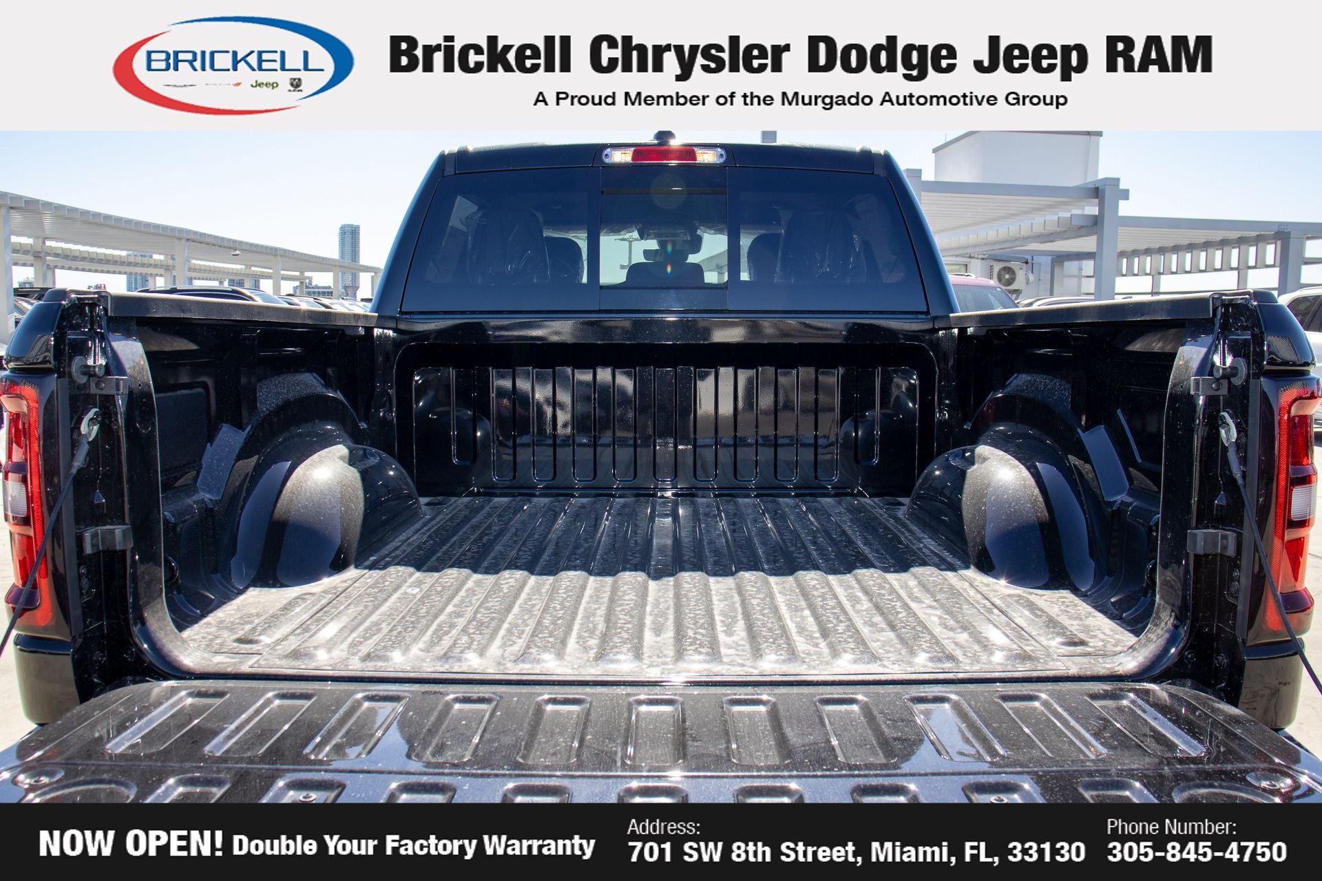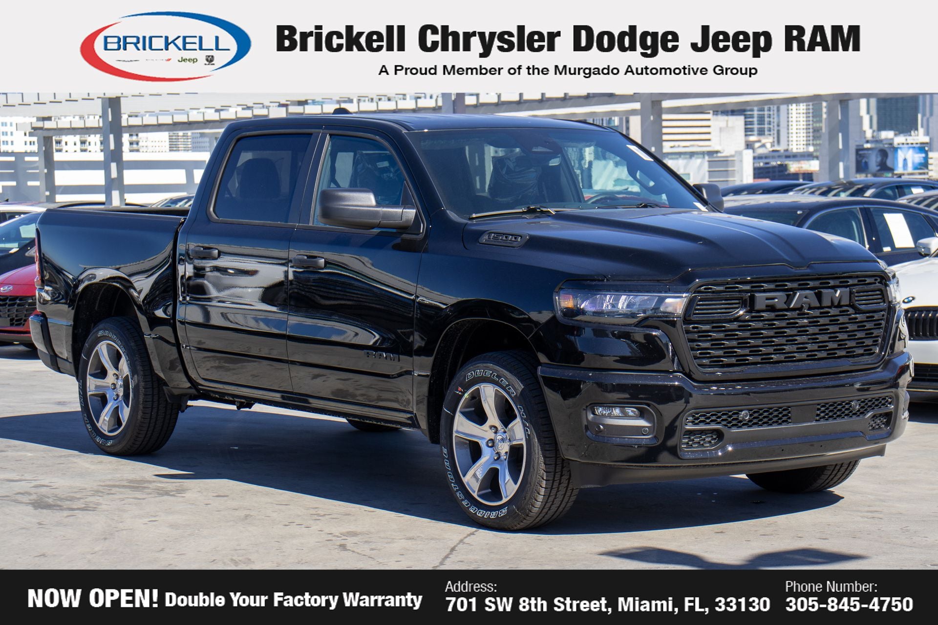 Price includes: $2000 - 2026 National Select Inventory Bonus Cash. Exp. 03/02/2026 $3500 - 2026 National Retail Consumer Cash . Exp. 03/02/2026 $500 - 2026 National 2026 Military Bonus Cash . Exp. 01/04/2027 Discover Your Next Vehicle at Brickell Chrysler Dodge Jeep Ram Welcome to Brickell CDJR, where we go beyond selling cars. We double the factory powertrain warranty, giving you added peace of mind. Our dealership offers one of the largest new car inventories in the region, ensuring you find the right vehicle Prices displayed do not included our Perma-plate. Our state-of-the-art service department is the largest in the country and is open seven days a week from 7 AM to 9 PM. Visit us at 701 SW 8th St, Miami, FL 33130, or call 305-777-2800 to learn more and schedule a test drive. The displayed price includes an incentive for financing with Brickell CDJR Finance Company. Outside financing and bank drafts are not accepted. All pre-owned vehicle exports are subject to an export fee. Prices apply only to customers who live, work, or worship in Broward, Miami-Dade, Palm Beach, Monroe, Collier, Hendry, Lee, Glades, Martin, St. Lucie, Okeechobee, Manatee, Hillsborough, Osceola, or Orange County. Customers outside these counties will pay an additional $ Taxes, title, registration, and dealer fees apply. Factory MSRP: $51,425 Diamond Black Crystal Pearlcoat 2026 Ram 1500 Express RWD 8-Speed Automatic 3.0L I6