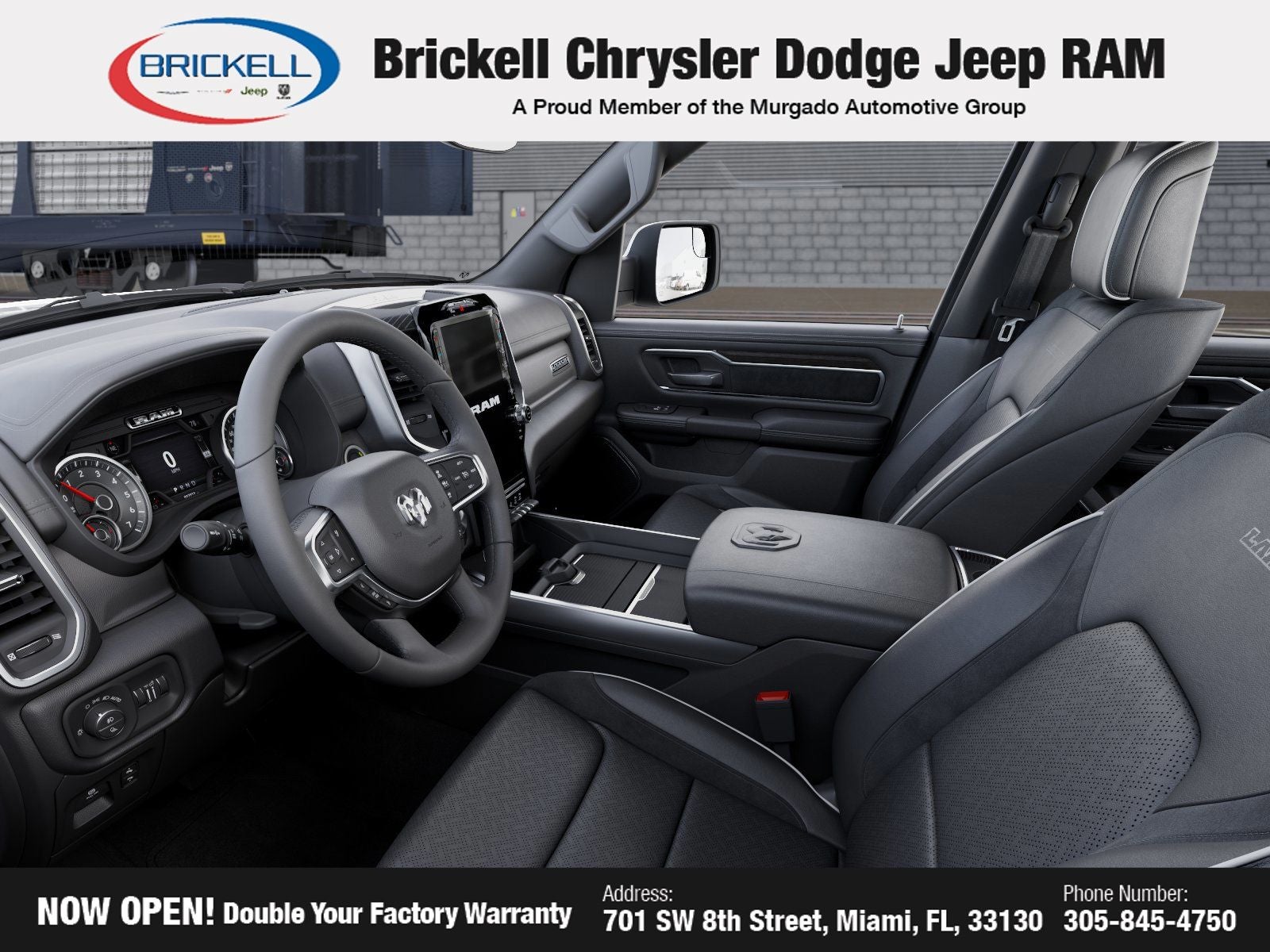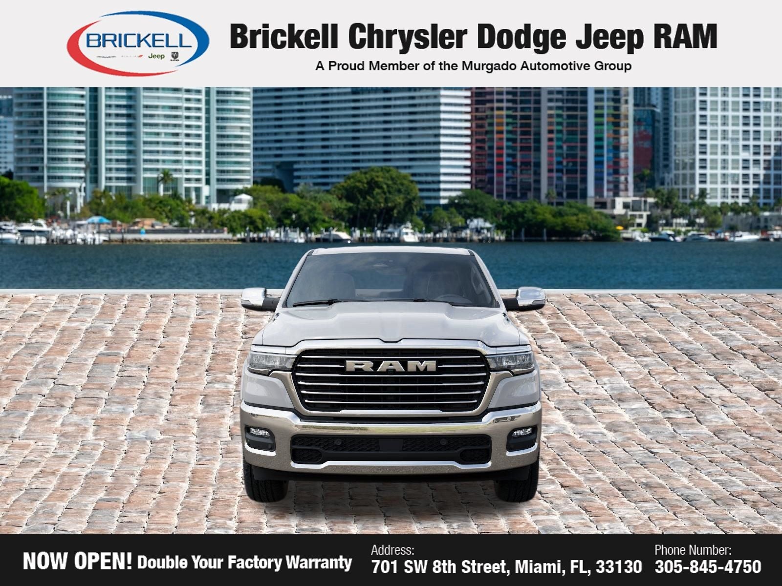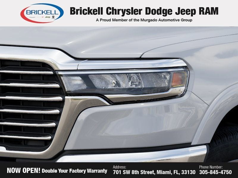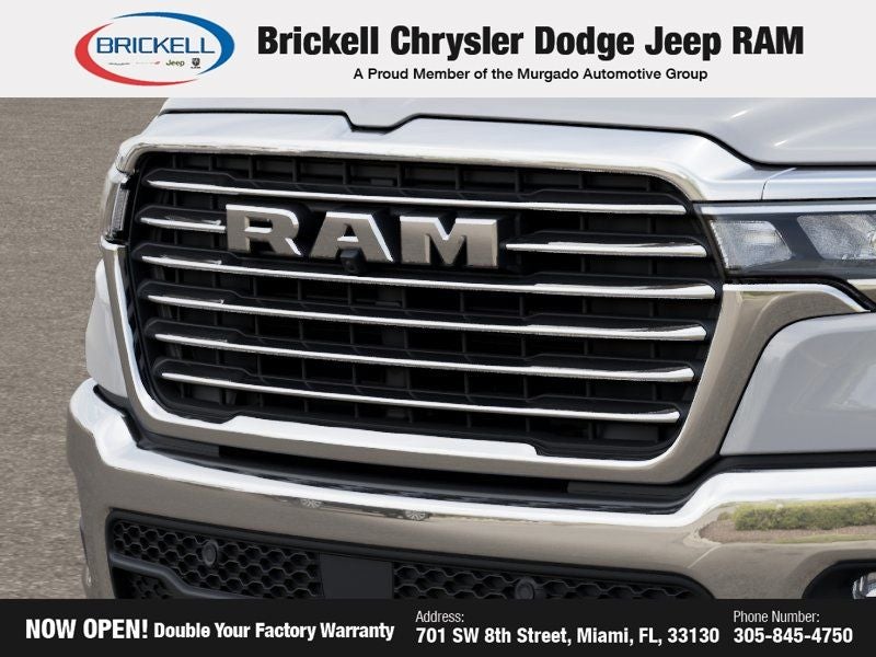 Price includes: $3500 - 2026 National Retail Bonus Cash . Exp. 04/30/2026 $750 - 2026 Southeast BC Retail Bonus Cash. Exp. 04/30/2026 Discover Your Next Vehicle at Brickell Chrysler Dodge Jeep Ram Welcome to Brickell CDJR, where we go beyond selling cars. We double the factory powertrain warranty, giving you added peace of mind. Our dealership offers one of the largest new car inventories in the region, ensuring you find the right vehicle Prices displayed do not included our Perma-plate. Our state-of-the-art service department is the largest in the country and is open seven days a week from 7 AM to 9 PM. Visit us at 701 SW 8th St, Miami, FL 33130, or call 305-777-2800 to learn more and schedule a test drive. The displayed price includes an incentive for financing with Brickell CDJR Finance Company. Outside financing and bank drafts are not accepted. All pre-owned vehicle exports are subject to an export fee. Prices apply only to customers who live, work, or worship in Broward, Miami-Dade, Palm Beach, Monroe, Collier, Hendry, Lee, Glades, Martin, St. Lucie, Okeechobee, Manatee, Hillsborough, Osceola, or Orange County. Customers outside these counties will pay an additional $ Taxes, title, registration, and dealer fees apply. Factory MSRP: $65,305 Bright White Clearcoat 2026 Ram 1500 Laramie RWD 8-Speed Automatic 3.0L I6