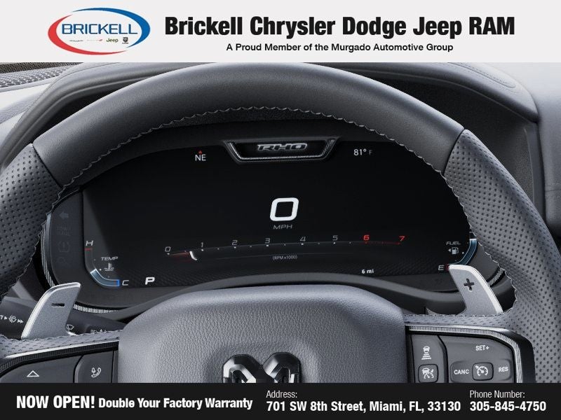 Price includes: $500 - 2026 National 2026 Military Bonus Cash . Exp. 01/04/2027 Discover Your Next Vehicle at Brickell Chrysler Dodge Jeep Ram Welcome to Brickell CDJR, where we go beyond selling cars. We double the factory powertrain warranty, giving you added peace of mind. Our dealership offers one of the largest new car inventories in the region, ensuring you find the right vehicle Prices displayed do not included our Perma-plate. Our state-of-the-art service department is the largest in the country and is open seven days a week from 7 AM to 9 PM. Visit us at 701 SW 8th St, Miami, FL 33130, or call 305-777-2800 to learn more and schedule a test drive. The displayed price includes an incentive for financing with Brickell CDJR Finance Company. Outside financing and bank drafts are not accepted. All pre-owned vehicle exports are subject to an export fee. Prices apply only to customers who live, work, or worship in Broward, Miami-Dade, Palm Beach, Monroe, Collier, Hendry, Lee, Glades, Martin, St. Lucie, Okeechobee, Manatee, Hillsborough, Osceola, or Orange County. Customers outside these counties will pay an additional $ Taxes, title, registration, and dealer fees apply. Factory MSRP: $76,685 Forged Blue Metallic 2026 Ram 1500 RHO 4WD 8-Speed Automatic 3.0L I6