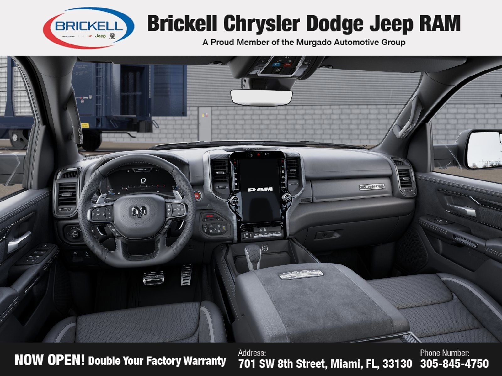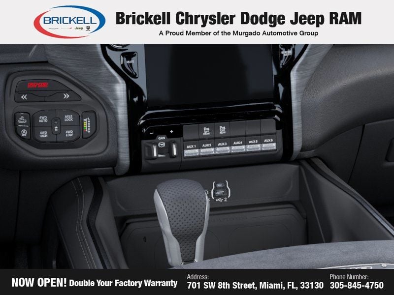 Price includes: $500 - 2026 National 2026 Military Bonus Cash . Exp. 01/04/2027 Discover Your Next Vehicle at Brickell Chrysler Dodge Jeep Ram Welcome to Brickell CDJR, where we go beyond selling cars. We double the factory powertrain warranty, giving you added peace of mind. Our dealership offers one of the largest new car inventories in the region, ensuring you find the right vehicle Prices displayed do not included our Perma-plate. Our state-of-the-art service department is the largest in the country and is open seven days a week from 7 AM to 9 PM. Visit us at 701 SW 8th St, Miami, FL 33130, or call 305-777-2800 to learn more and schedule a test drive. The displayed price includes an incentive for financing with Brickell CDJR Finance Company. Outside financing and bank drafts are not accepted. All pre-owned vehicle exports are subject to an export fee. Prices apply only to customers who live, work, or worship in Broward, Miami-Dade, Palm Beach, Monroe, Collier, Hendry, Lee, Glades, Martin, St. Lucie, Okeechobee, Manatee, Hillsborough, Osceola, or Orange County. Customers outside these counties will pay an additional $ Taxes, title, registration, and dealer fees apply. Factory MSRP: $76,390 Bright White Clearcoat 2026 Ram 1500 RHO 4WD 8-Speed Automatic 3.0L I6