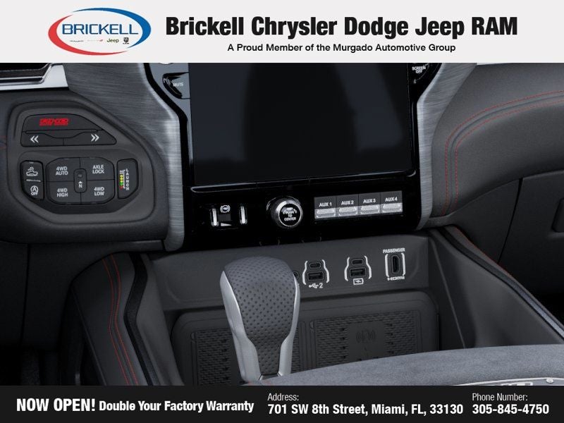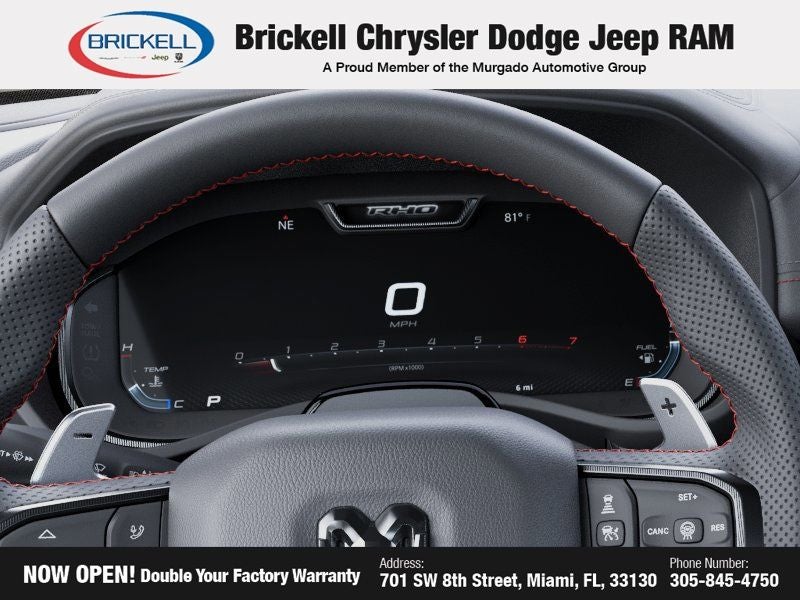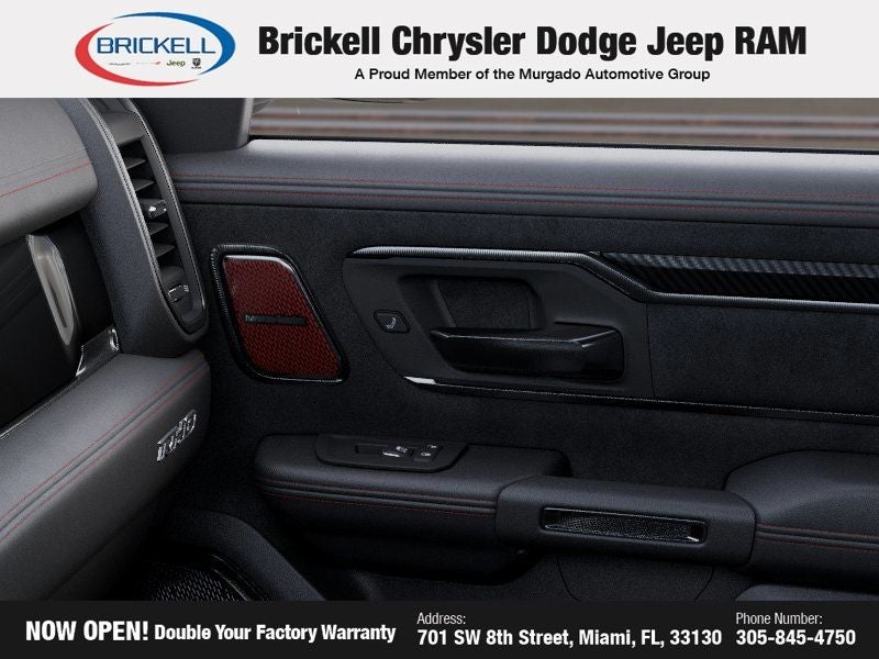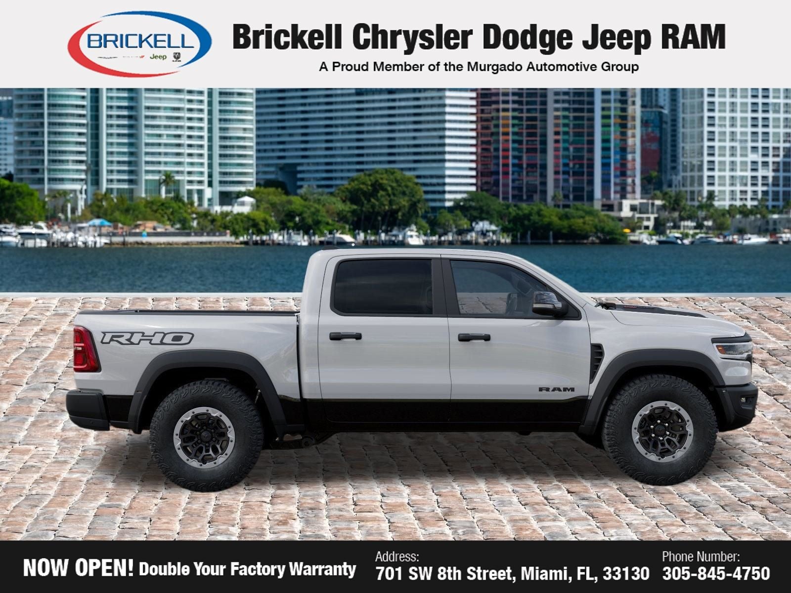 Discover Your Next Vehicle at Brickell Chrysler Dodge Jeep Ram Welcome to Brickell CDJR, where we go beyond selling cars. We double the factory powertrain warranty, giving you added peace of mind. Our dealership offers one of the largest new car inventories in the region, ensuring you find the right vehicle Prices displayed do not included our Perma-plate. Our state-of-the-art service department is the largest in the country and is open seven days a week from 7 AM to 9 PM. Visit us at 701 SW 8th St, Miami, FL 33130, or call 305-777-2800 to learn more and schedule a test drive. The displayed price includes an incentive for financing with Brickell CDJR Finance Company. Outside financing and bank drafts are not accepted. All pre-owned vehicle exports are subject to an export fee. Prices apply only to customers who live, work, or worship in Broward, Miami-Dade, Palm Beach, Monroe, Collier, Hendry, Lee, Glades, Martin, St. Lucie, Okeechobee, Manatee, Hillsborough, Osceola, or Orange County. Customers outside these counties will pay an additional $ Taxes, title, registration, and dealer fees apply. New Price! Factory MSRP: $94,155 Bright White Clearcoat 2026 Ram 1500 RHO 4WD 8-Speed Automatic 3.0L I6